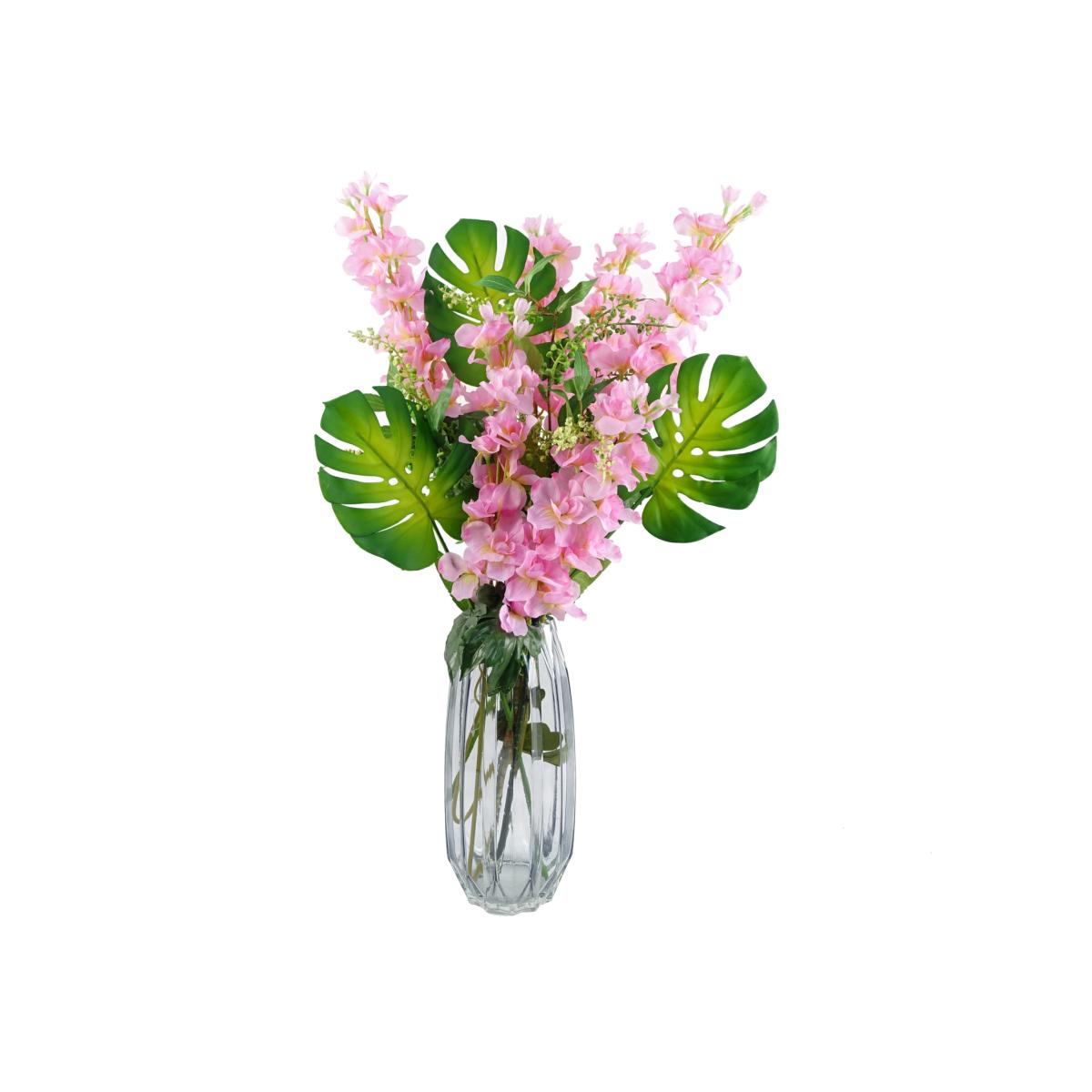 These artificial flower arrangements come with the vases a complete pack of everything you need to create the display shown in our photos. Sizes given in item specifics are the overall measurements when arranged as shown in our pictures. Sizes of individual stems vary and are given in the following description. Stems are wired and this can be shaped to your requirements. This pack contains the following 1 x LEAF-40573 30cm clear contemporary glass vase 30cm x 12cm x 12cm at widest points and the slightly narrower top rim measures 9cm diameter. 1 x LEAF-40654 85cm artificial green foliage spray. 6 x LEAF-40692 75cm delphinium silk pink artificial stem. 3 x LEAF-40700 55cm single artificial monstera leaf. Flowers and foliage are supplied loose at full length ready for you arrange. You can cut these shorter if wanted for arrangement (very easy- just use wire cutters) or you can just fold the stems at the ends before putting them in the vase.