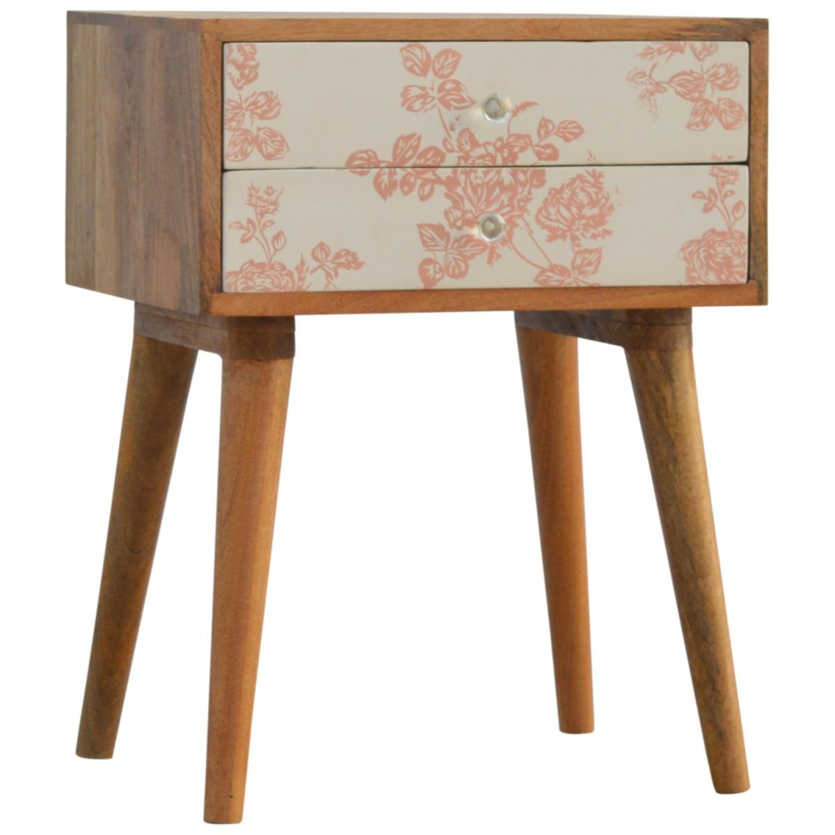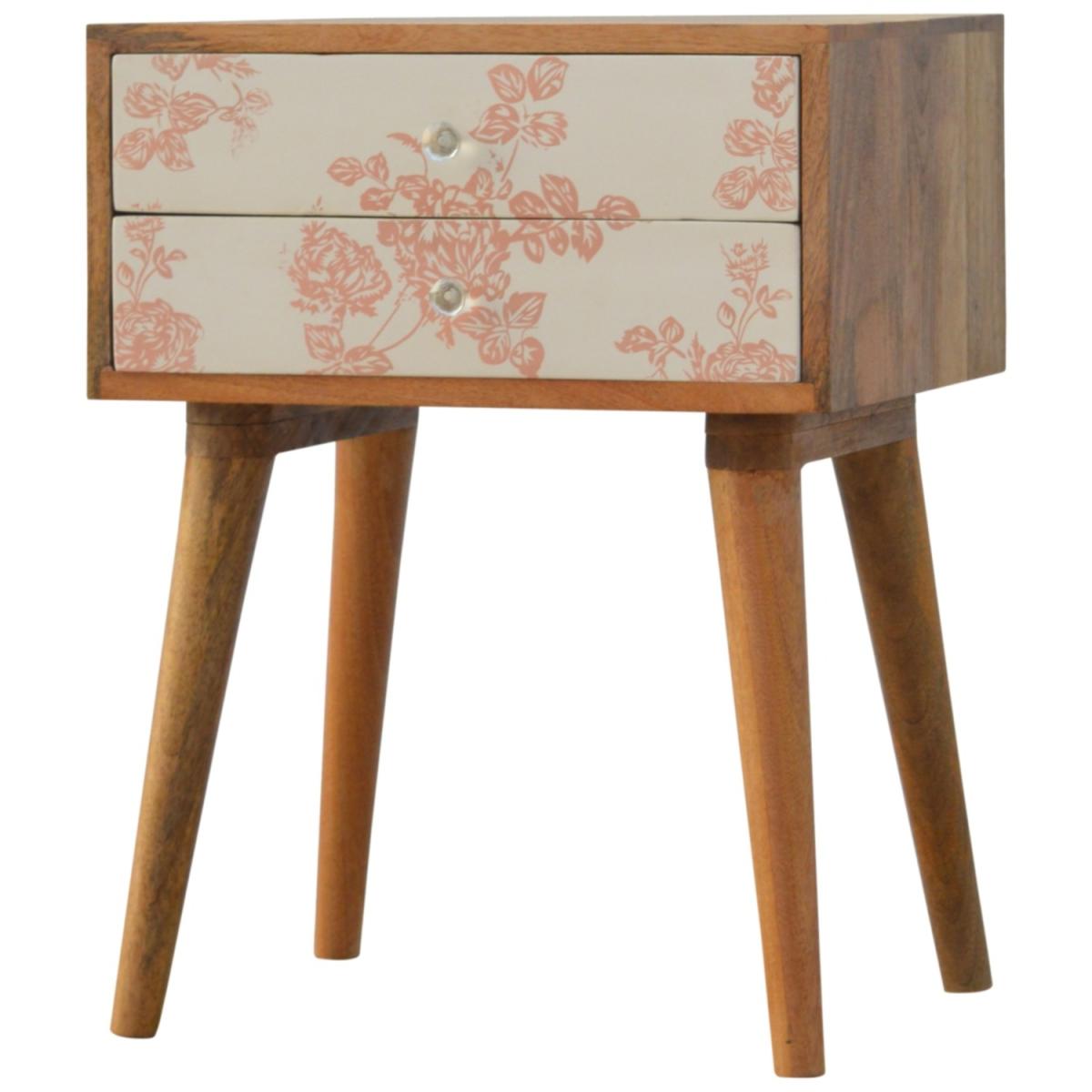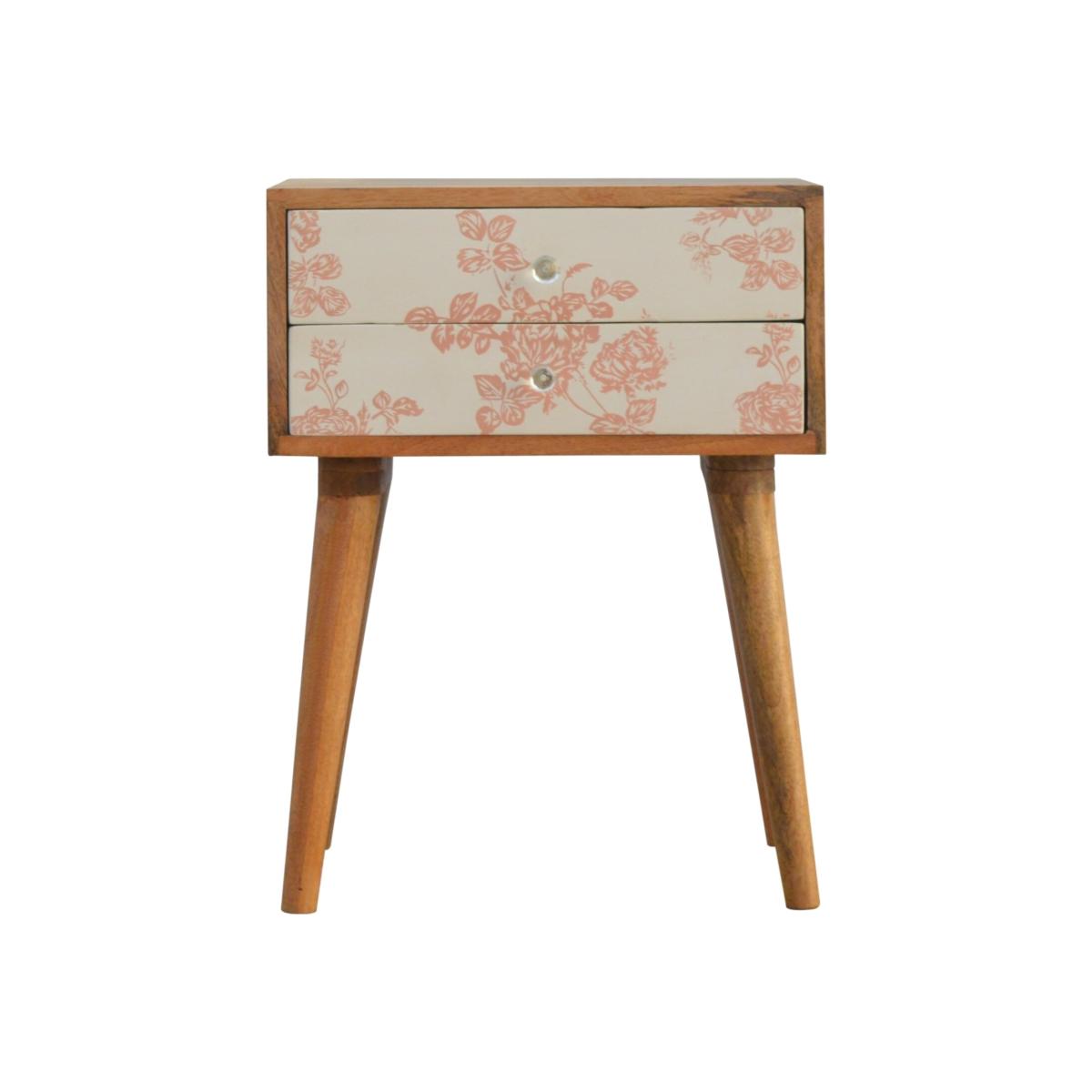 This bedside table is a versatile piece that will prove handy all over your home and provide storage for any bits and pieces before bed. It has been made from 100 solid mango wood with has a fine oak-ish finish. It also comes with 2 pink floral screen printed drawers that have glass knobs and 4 Nordic-style legs.