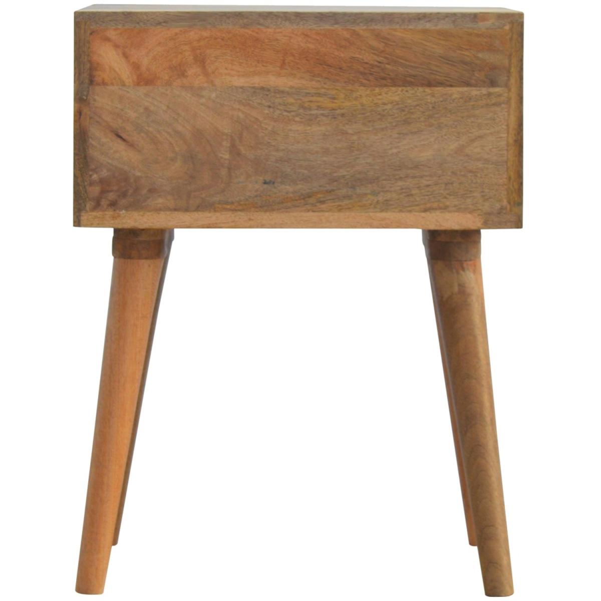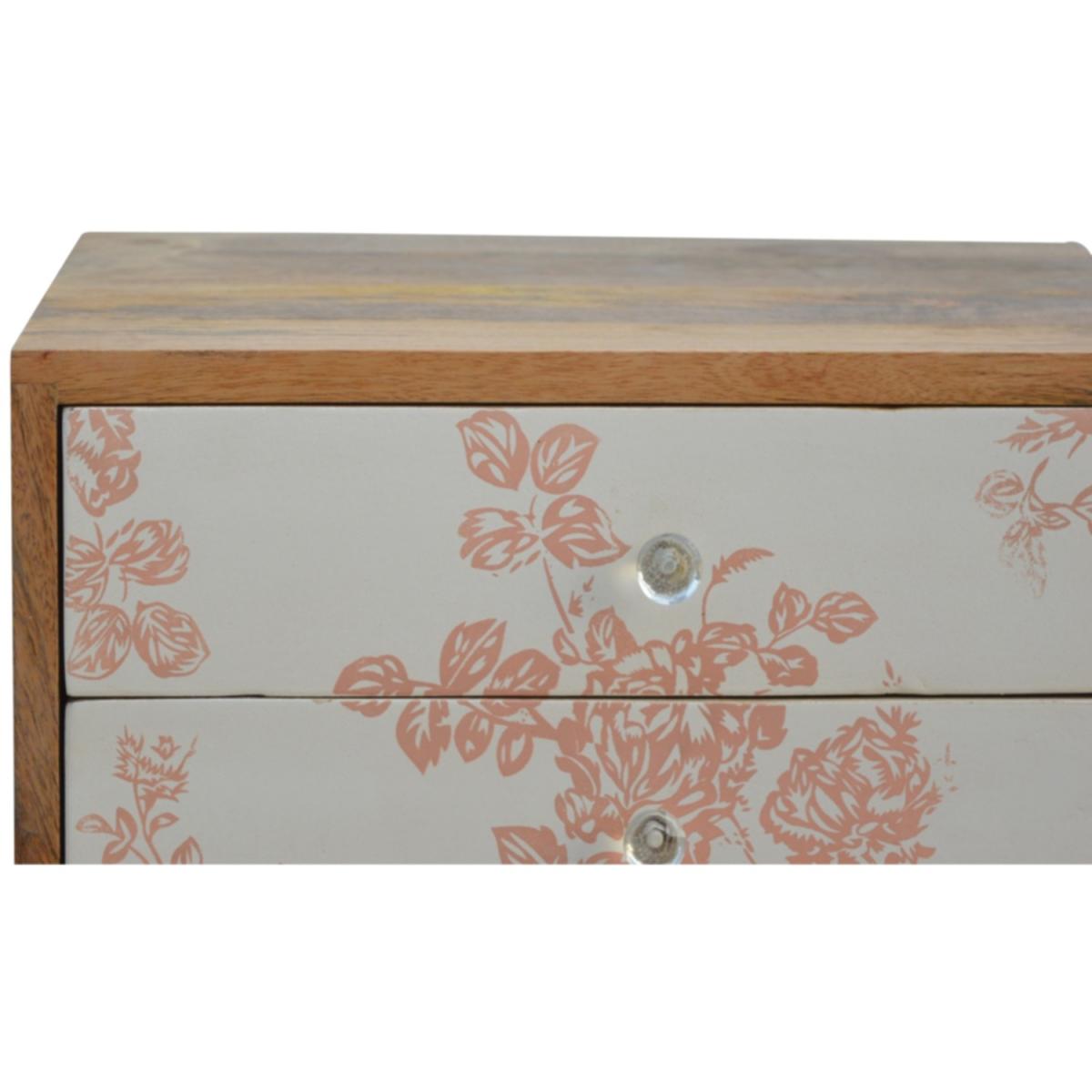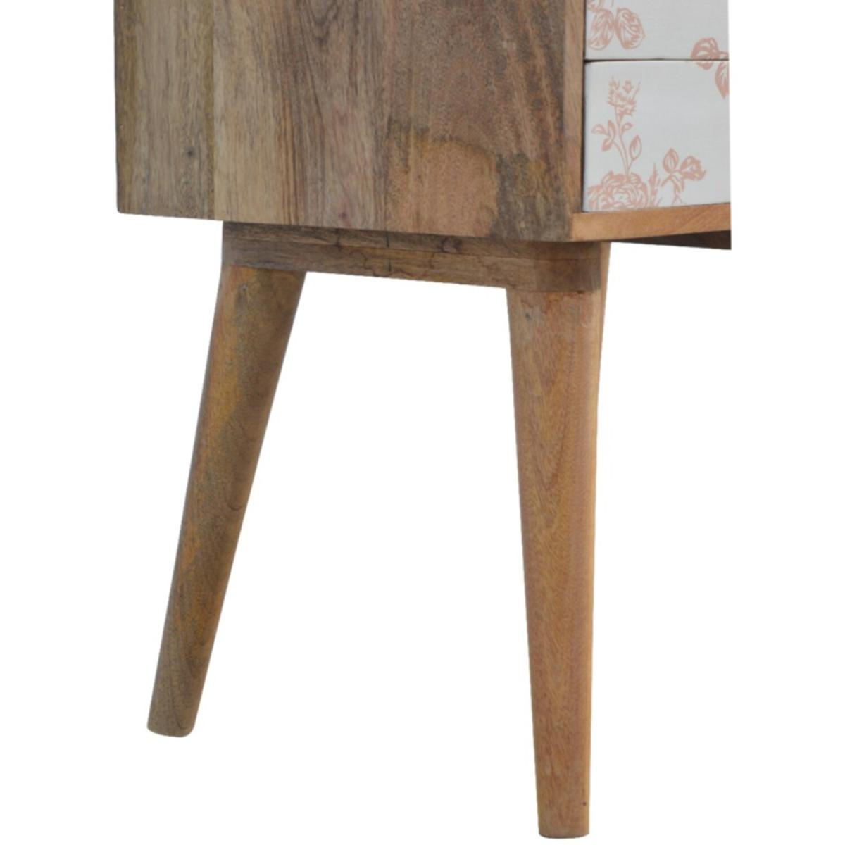 This bedside table is a versatile piece that will prove handy all over your home and provide storage for any bits and pieces before bed. It has been made from 100 solid mango wood with has a fine oak-ish finish. It also comes with 2 pink floral screen printed drawers that have glass knobs and 4 Nordic-style legs.