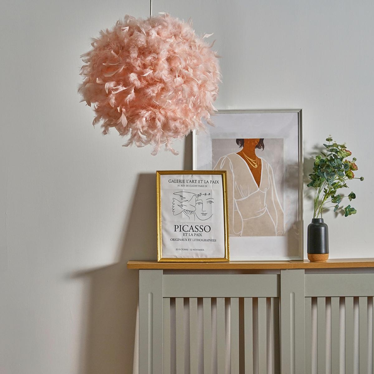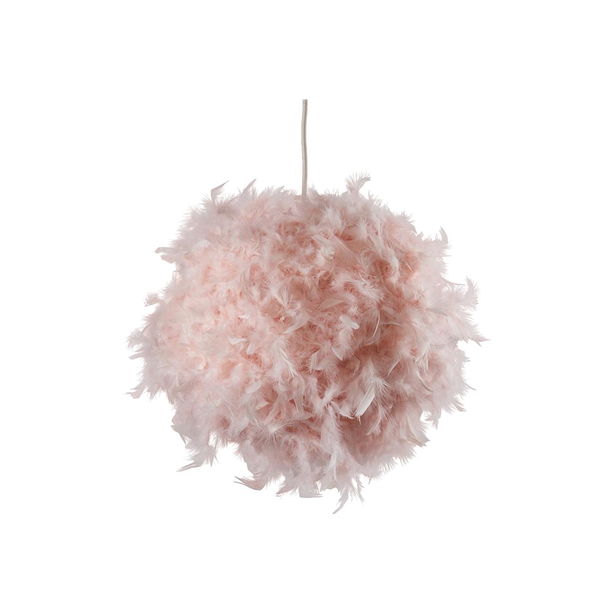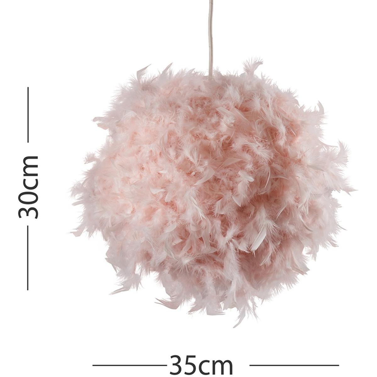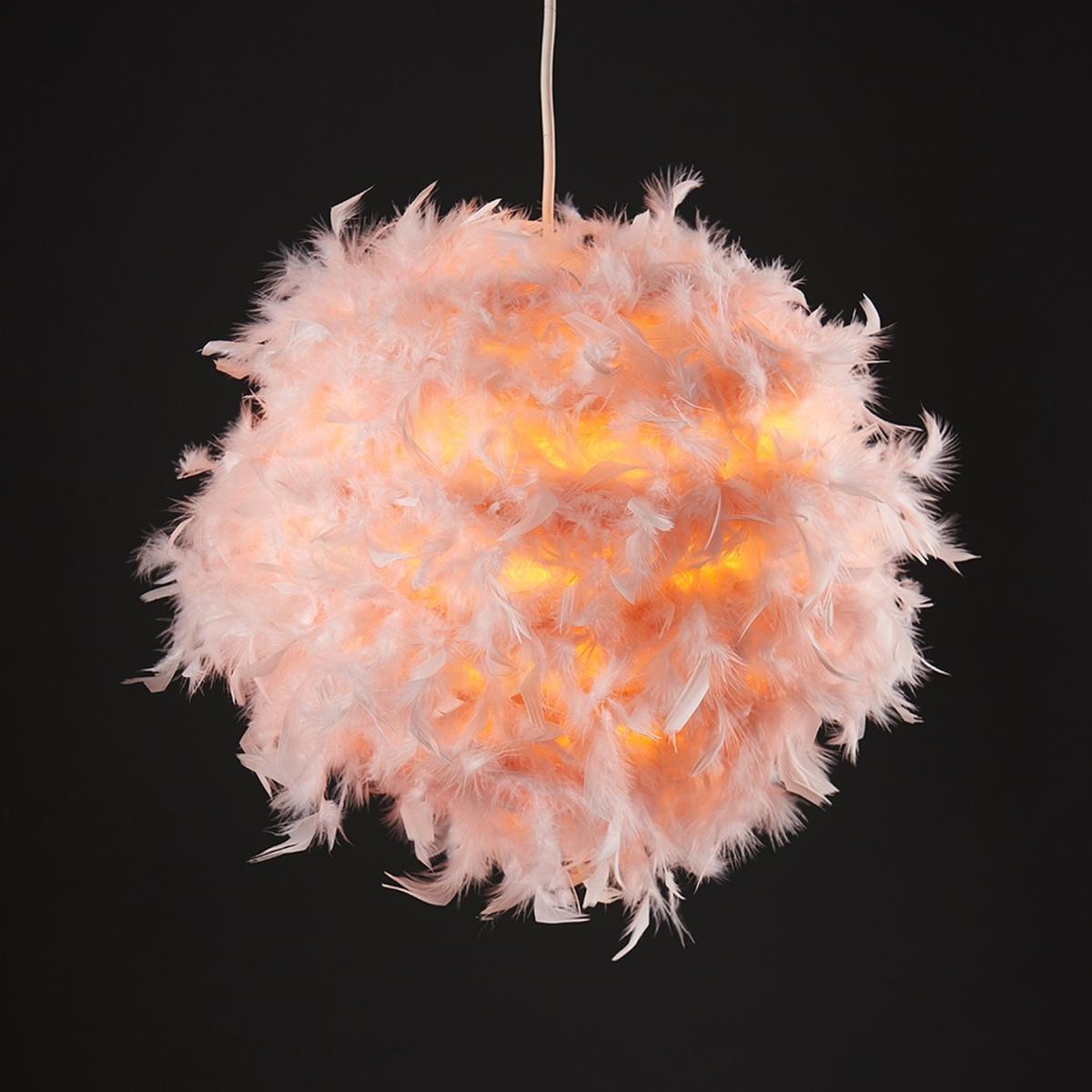 Modern globe shaped ceiling pendant light shade in a pink real feather finish. This unique shade will become the main talking focal point of any room. The right fitting can make a real style statement and complete your living space look. Ideal for living rooms, bedrooms, dining rooms and hallways. Easily fits to your standard light socket - no electrical installation wiring required.