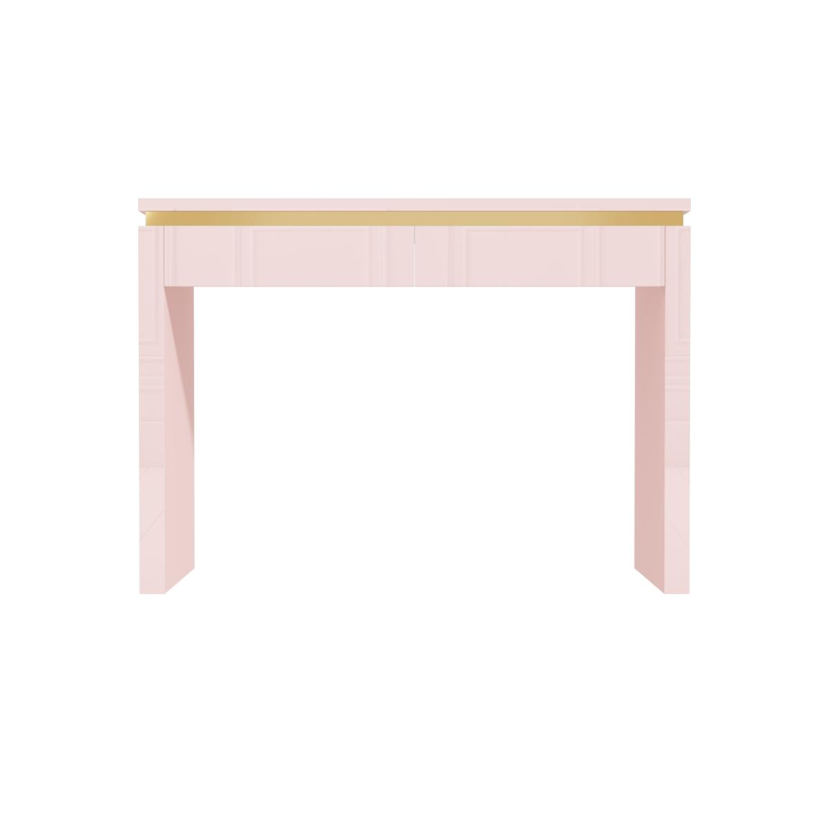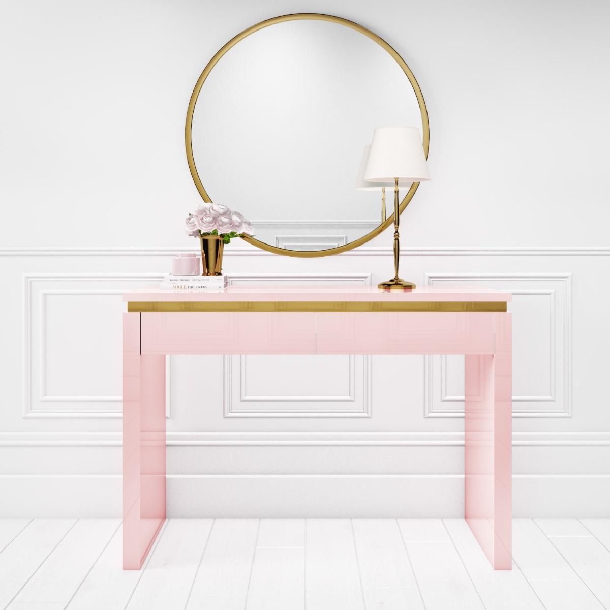 Contemporary pink dressing table with gold trim Two spacious drawers to store all your accessories Gold painted trim makes a striking contrast The high-gloss finish gives it a natural shine Full Isabella bedroom furniture collection available All About Me Give your bedroom a splash of elegance with the modern Isabella dressing table. It makes a stunning focal point due to its beautiful pink glossy exterior and exquisite gold finish and with two large drawers for storing essentials, this piece is highly practical as well as stylish. Why not match it with other pieces from the Isabella range? Need to know Brand:Isabella Number of drawers:2 Colour:Pink Material: Wood Finish: Gloss Assembly required: Yes