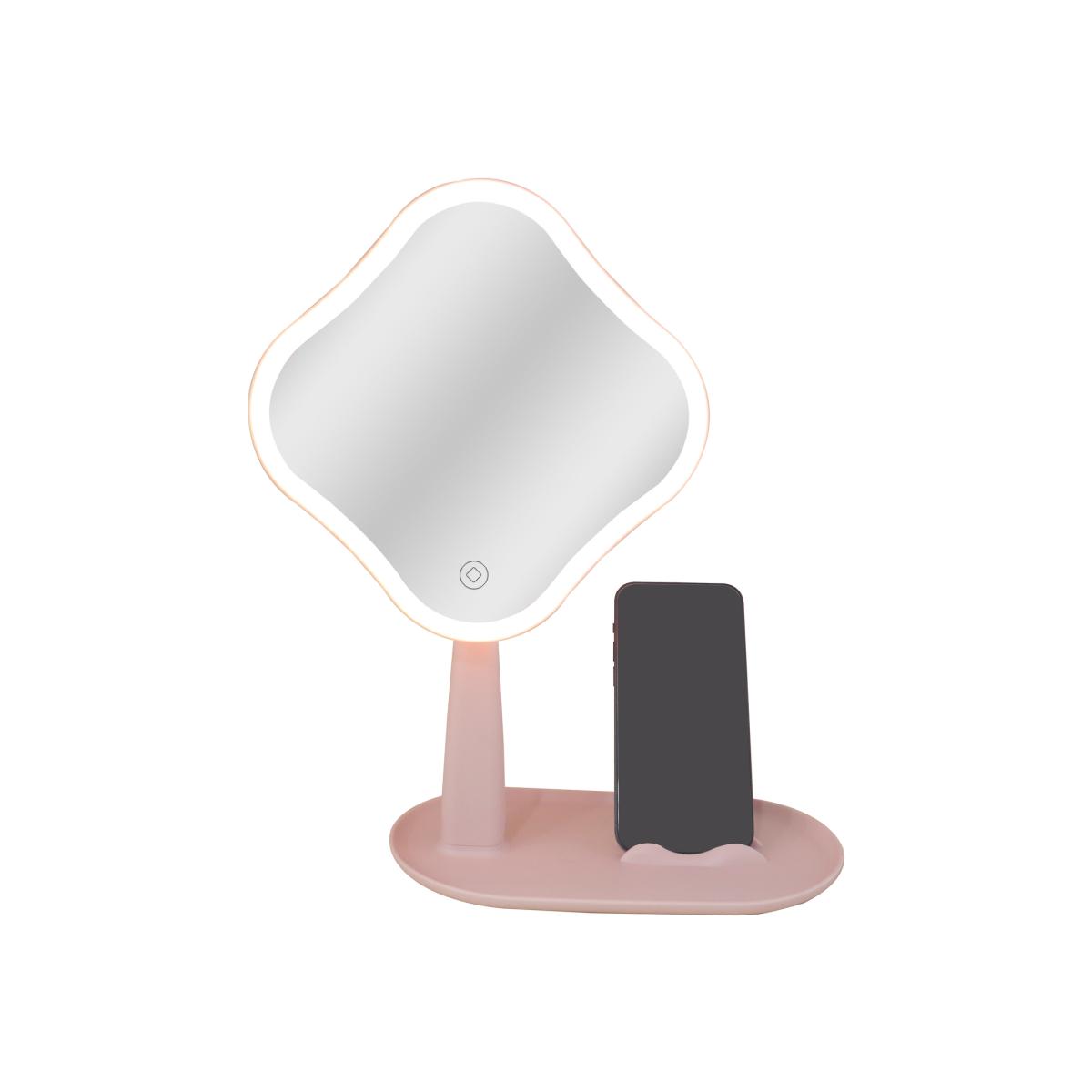 Get the perfect view for applying your makeup with this Pink LED Mirror with Phone Holder. This compact mirror sits neatly on your desk or vanity unit and features LED lights controlled with a smart touch light switch to provide the best lighting. It can be powered via USB or battery for convenience. Additionally, the mirror doubles as a phone stand, making it easy for you to watch videos, record, or Face. Time.