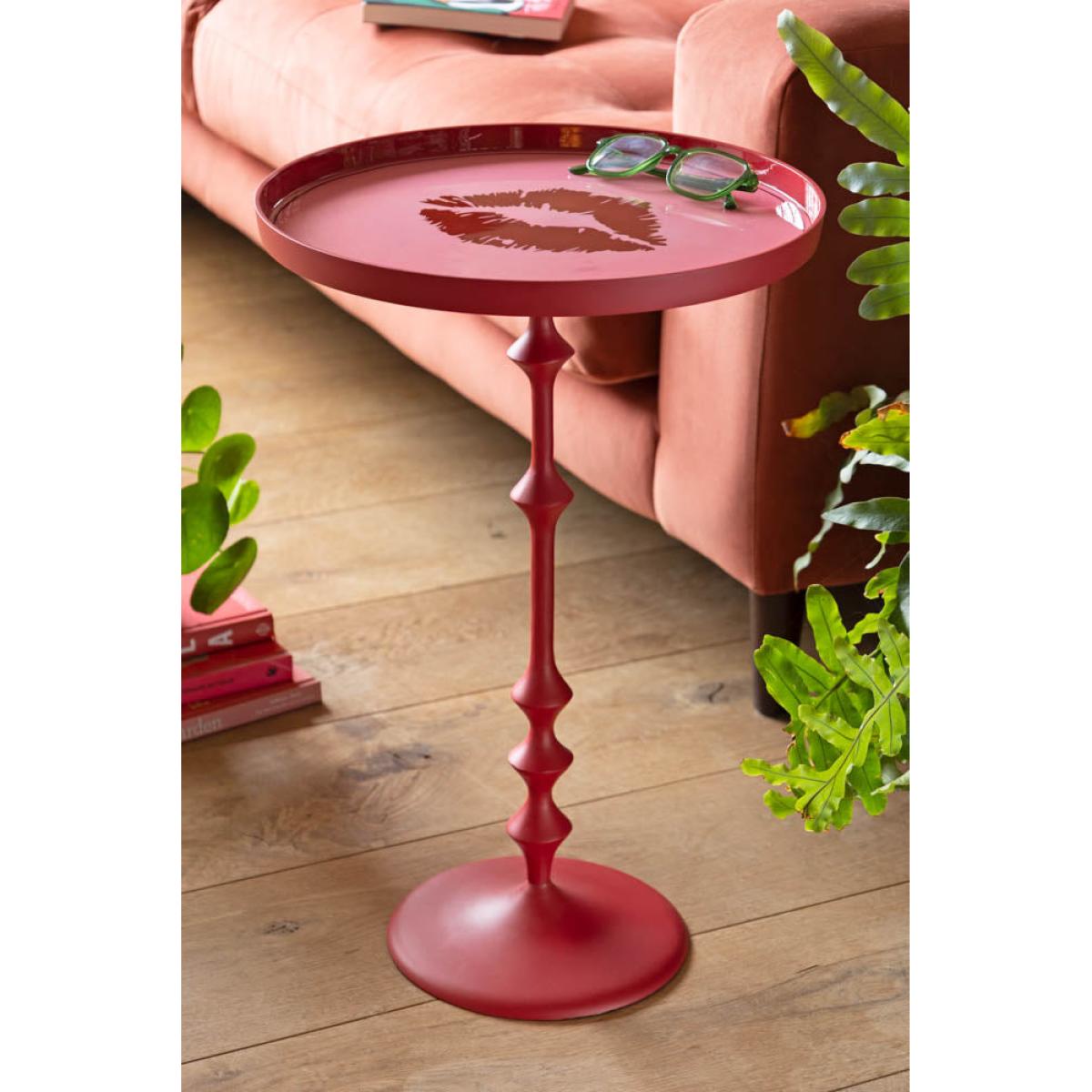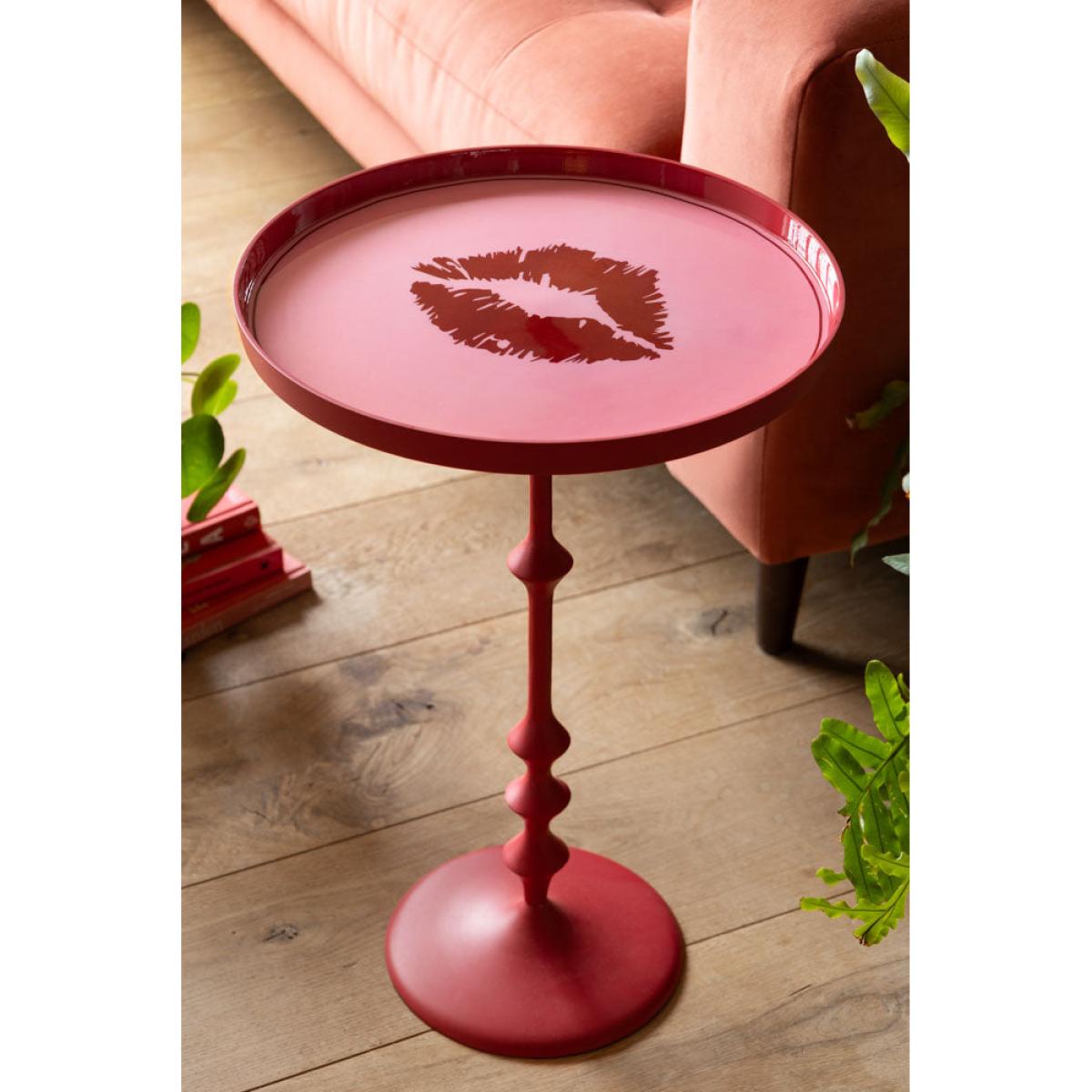 Our Pink Lips Side Table is here to steal hearts and turn heads, with its bold red ribbed pedestal leg and glossy pink tabletop, finished off with a cheeky lipstick stain right in the centre. This round side table is romantic, sassy and unapologetically sexy – basically, the living room furniture version of making a statement. Pop it next to your sofa, side tables, or reading chair and let it bring some very welcome drama to your living room décor. Whether you’re styling it with a cocktail glass, a stack of mags, or a vase of roses, it’s guaranteed to serve looks.- Pink Lips Side Table - Measures: W37cm x D37cm x H57cm - Materials: Metal - This product should only be used on firm, level ground. Avoid exposing the furniture to excessive heat or direct sunlight as this can cause cracking and deterioration of the colour. Keep away from strong heat sources. Do not use this item if components are missing or broken. - Wipe clean