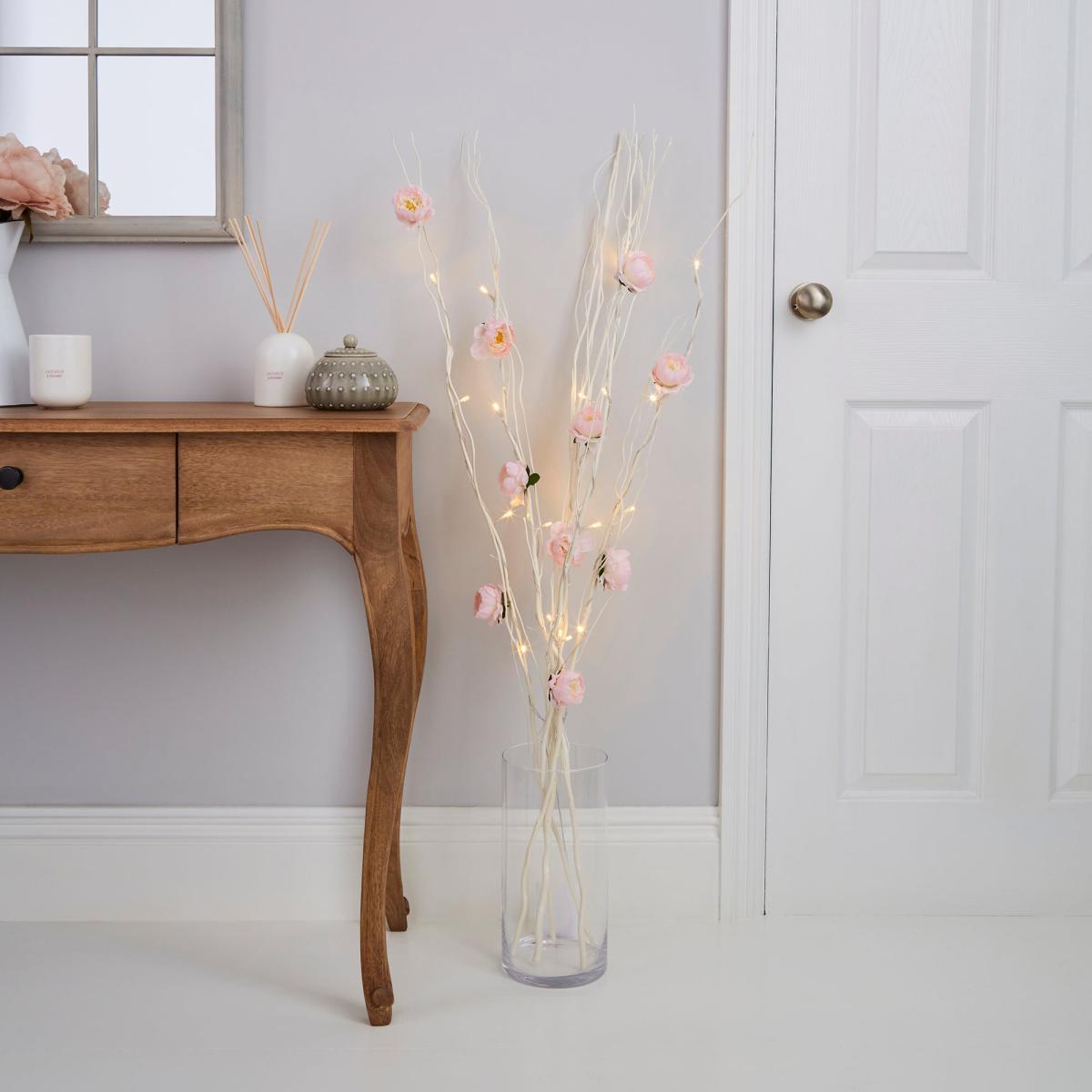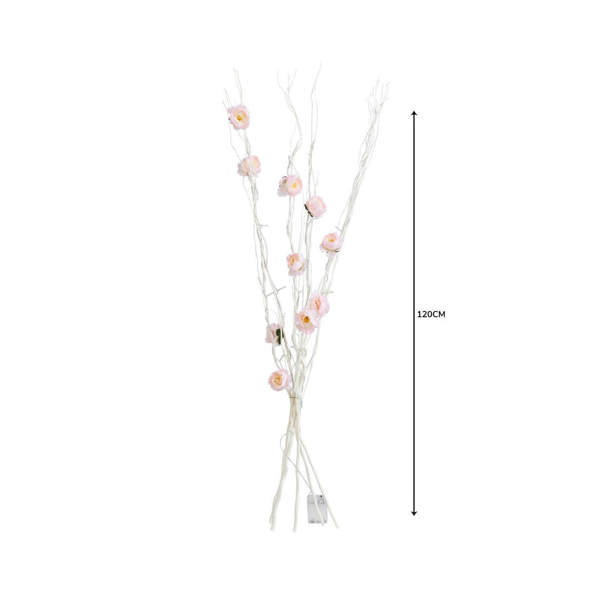 Crafted with 5 large white twigs, each with two beautiful pink Peony flower decorations, this battery operated twig light features 20 warm white LED lights. Requires 3 x AA batteries. Please note: batteries are not incldued.