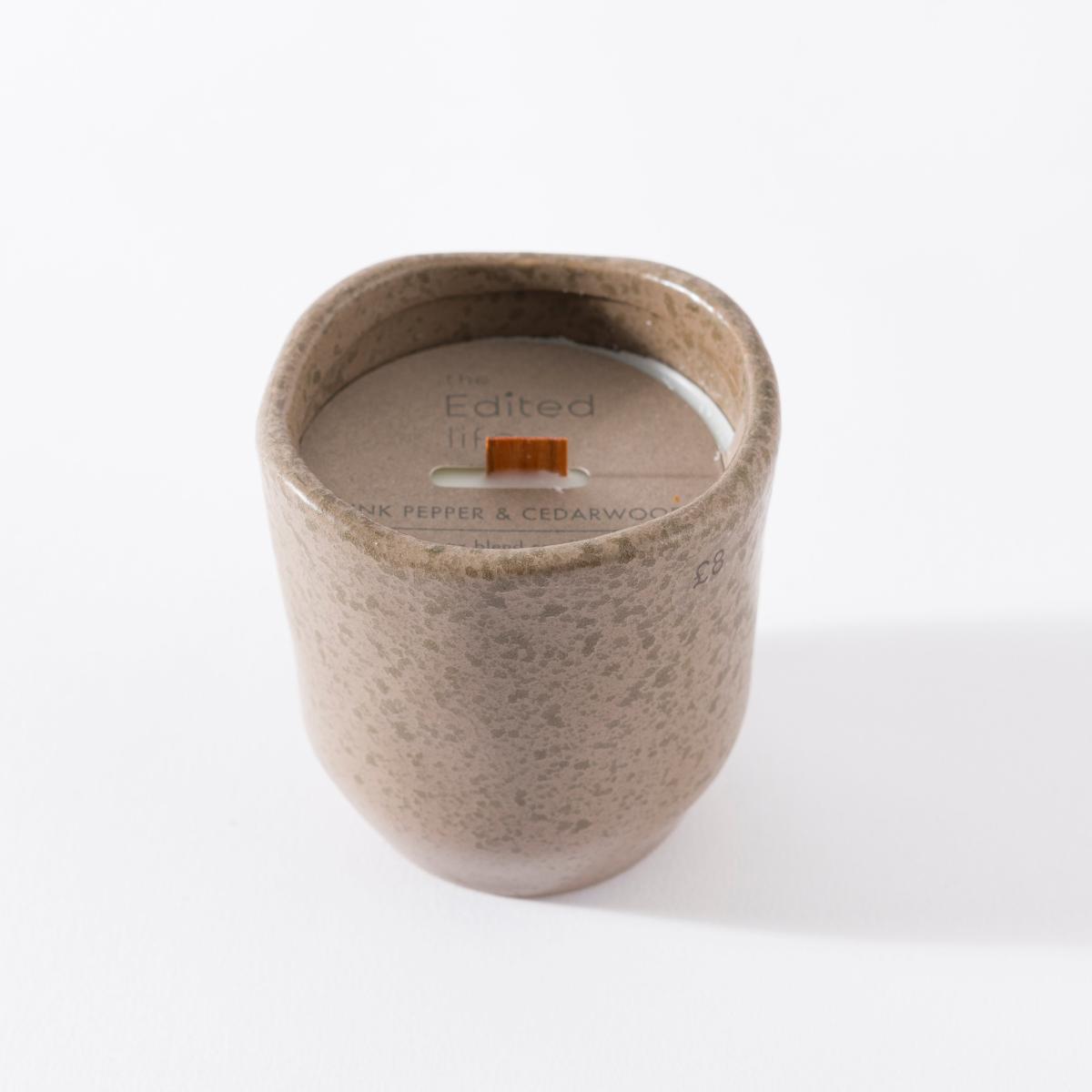 The Edited Life - Pink Pepper & Cedarwood Ceramic Crackle Candle * Stylish ceramic vessel * Crackle wick * Sweet, spicy scent * Up to 25 hours burn time This stylish candle perfectly blends fresh bergamot, tangy rhubarb, and spicy peppercorn with soft balsamic and tobacco notes, creating a rich, warm fragrance that fills your home. Resting on a base of amber, cedarwood, and patchouli, the scent offers a comforting yet sophisticated atmosphere. The wooden crackling wick adds a cosy, fireside feel to your space as it burns, making it the perfect addition to any room. Housed in a beautiful ceramic vessel, it adds an elegant touch to your décor, and with a burn time of 25 hours, this candle provides long-lasting enjoyment. Live well. Mean well. Be well. Many of us want to live simpler, more responsible lives. As we become more aware of our surroundings and understand how our choices contribute to the world around us, more people are choosing to consume less and curate more. The Edited Life introduces a new era of thoughtfulness in the home, with an understated collection of pieces chosen for their simple beauty, quality craftsmanship and innate usefulness that will last beyond any trend. Having it all is no longer the goal; having enough, and it being just right, is.