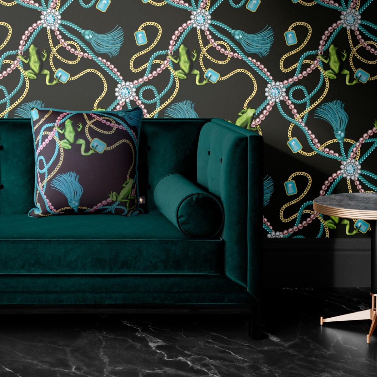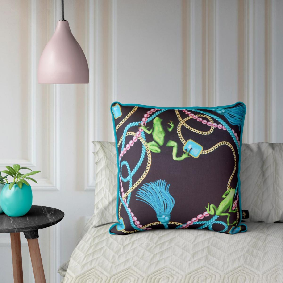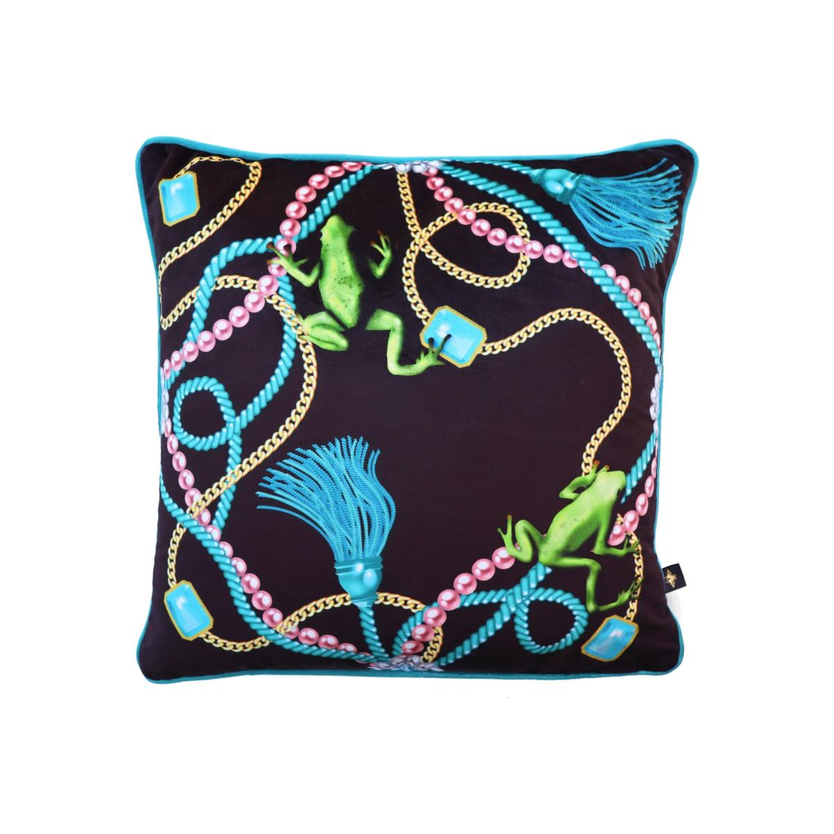 Inspired by the stories, emotions and feelings that can be imbued into precious objects, Tiana fuses the fantasy of fairytales with the opulence of fine jewellery. Sweeping tangles of chains and pearls protected by poisonous frogs create a bold nostalgic luxurious design. Our luxurious and shimmering velvet cushions are all hand cut, sewn and finished in the UK, featuring our dazzling pattern on both sides and accentuated with velvet piping cord detail. Each cushion is completed with a hidden zipper and golden scarab label. Size: 50cm x 50cm Outer: 100% Poly Velvet Filling: Soft Duck Feather