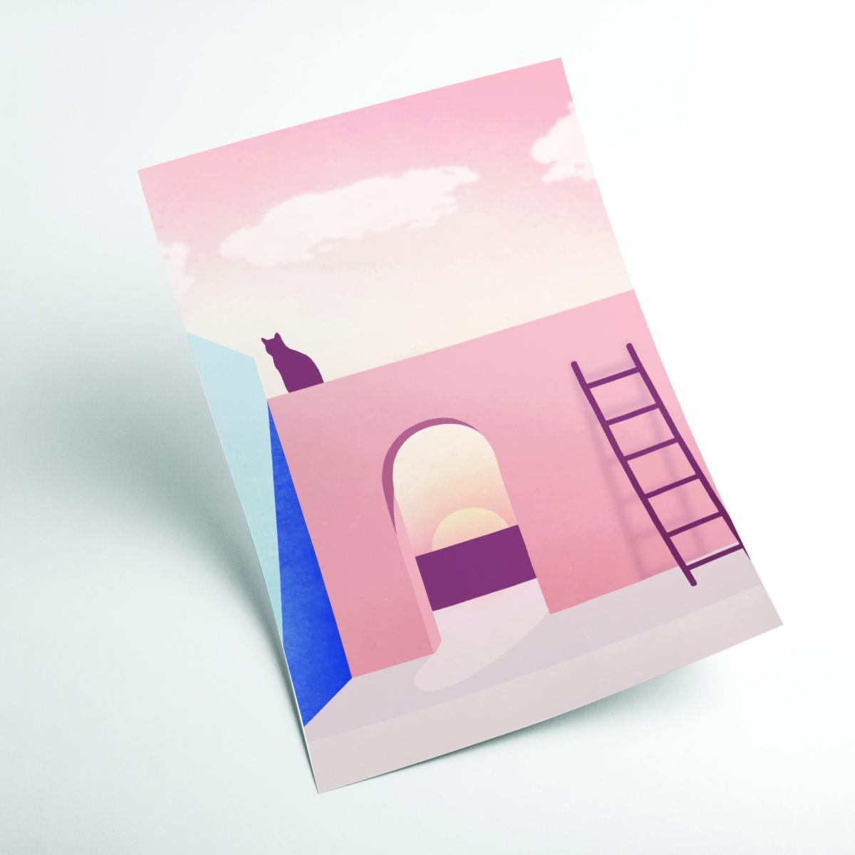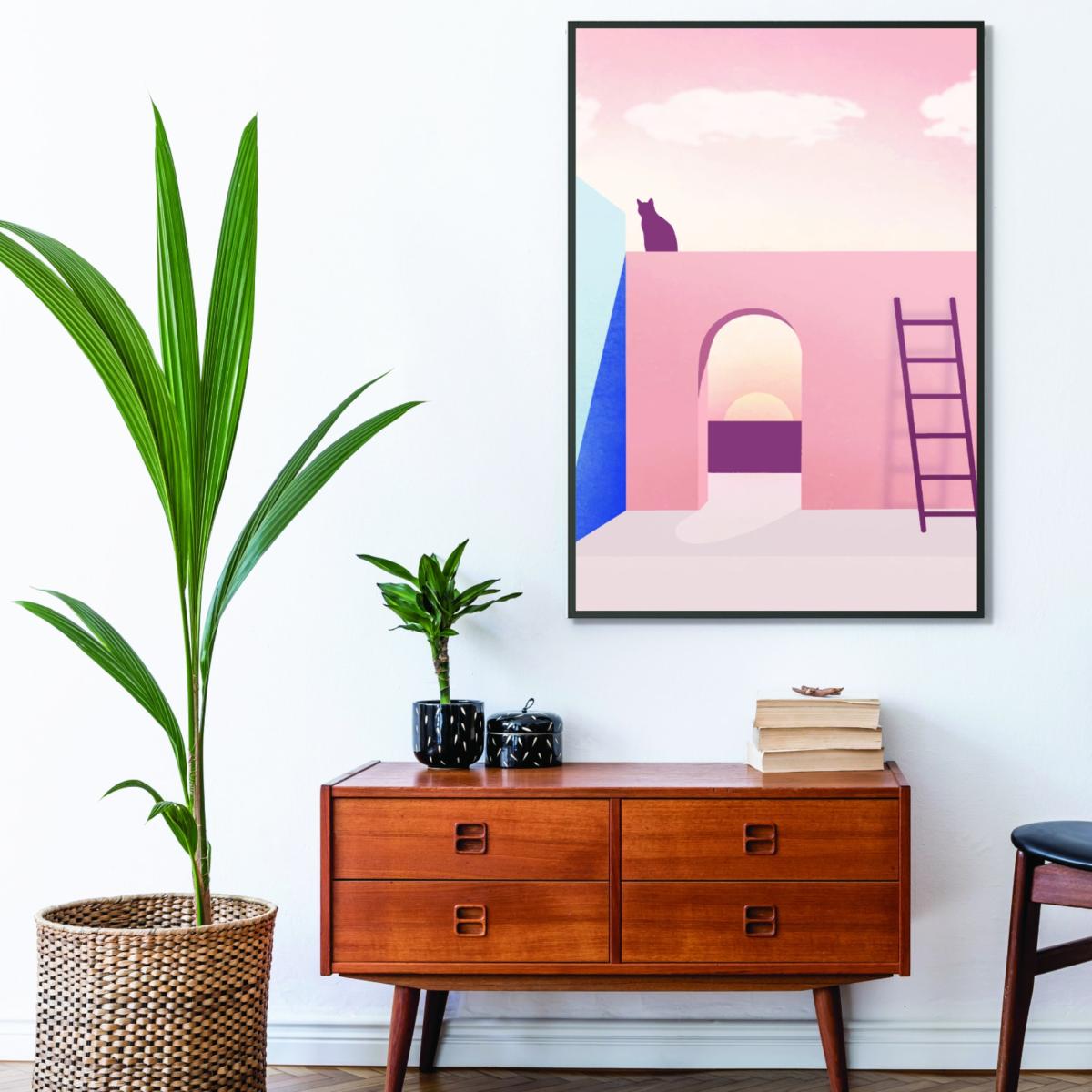 I love this small boho print for its playful yet refined colour palette of pinks and purples, making it a versatile piece for adding subtle colour to visual interest. It works well in relaxed interiors such as boho, Scandinavian, or eclectic spaces, where it can inject a dose of contemporary charm without overwhelming the decor. Practical styling tips include pairing it with natural textures like rattan or woven baskets, and placing it above a neutral sofa or bedside table to create a relaxed focal point. Its small size makes it ideal for accent walls, shelves, or corners, allowing it to bring an element of colour and whimsy into smaller spaces or layered gallery arrangements.