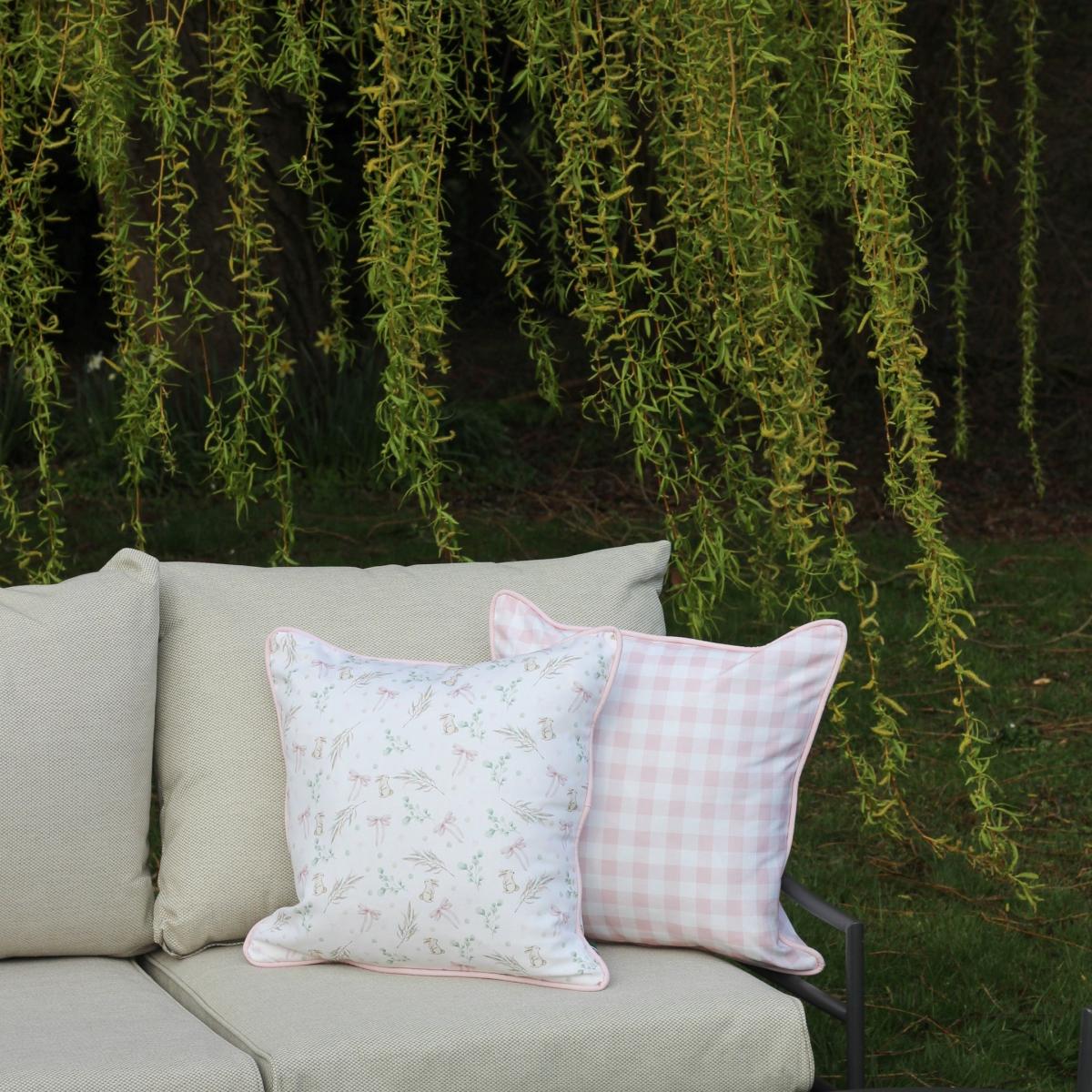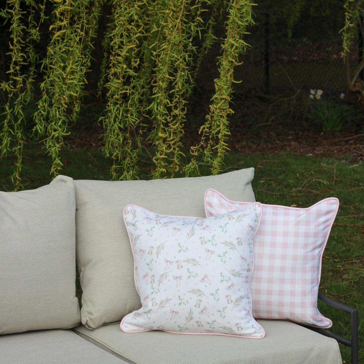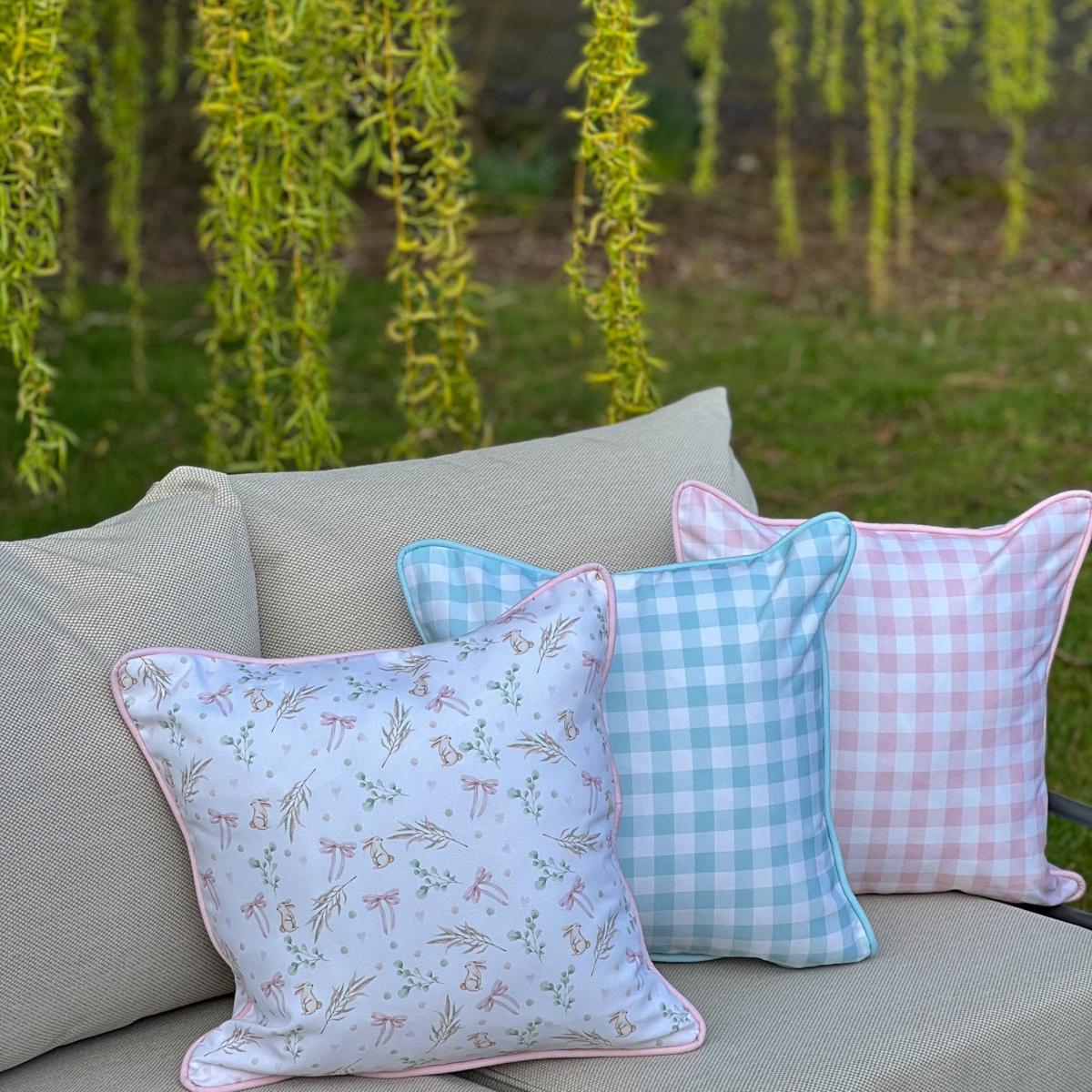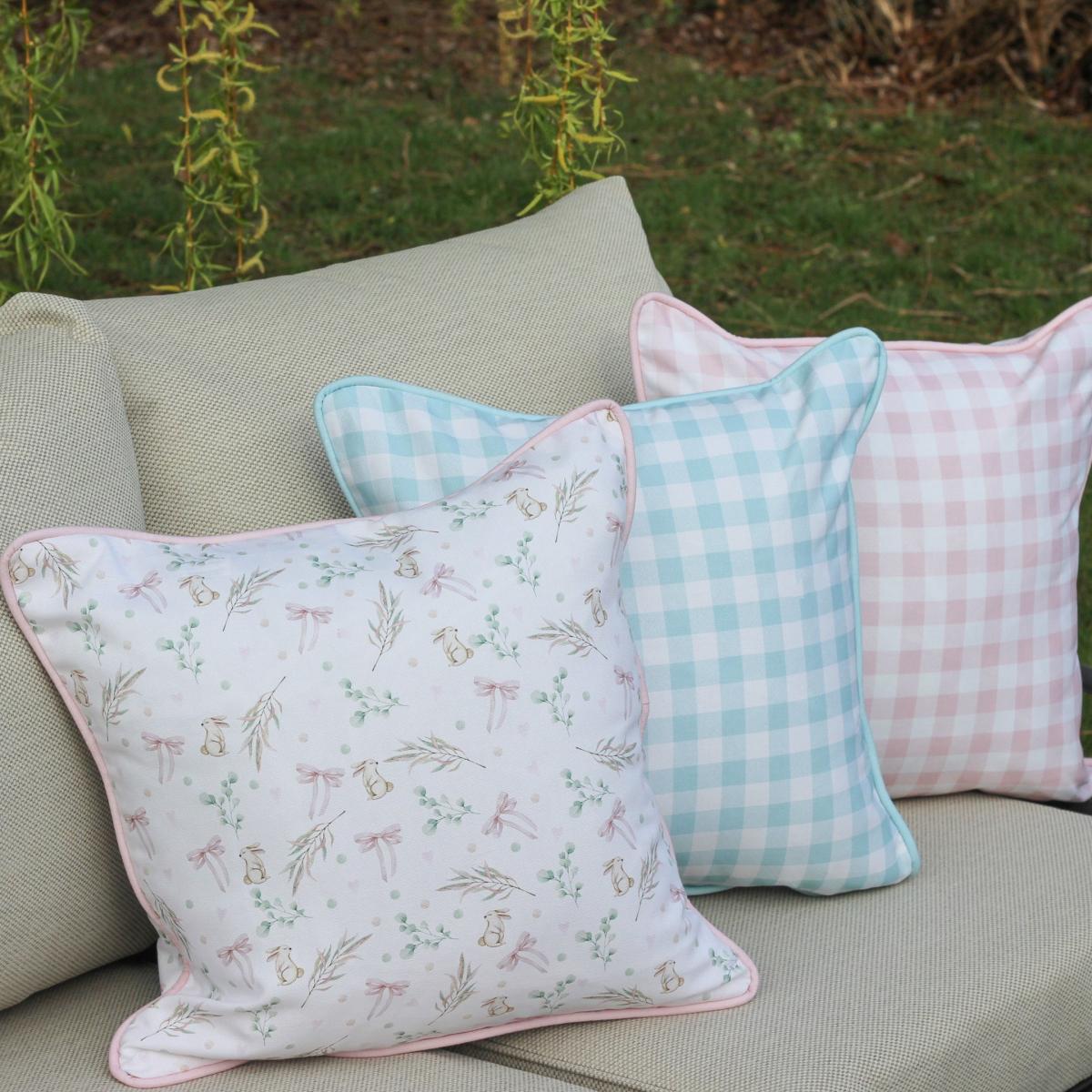 This 100% cotton cushion features our Bunnies and Bows fabric, inspired by my daughter's favourite soft toys. Mix and match across our complementary designs;Pink Gingham, Blue Gingham, Pink Frills, Blue Frills and the darling Bunnies and Bows collection. Designed, printed and manufactured in the UK. SIze - 45x45cm Sold unfilled