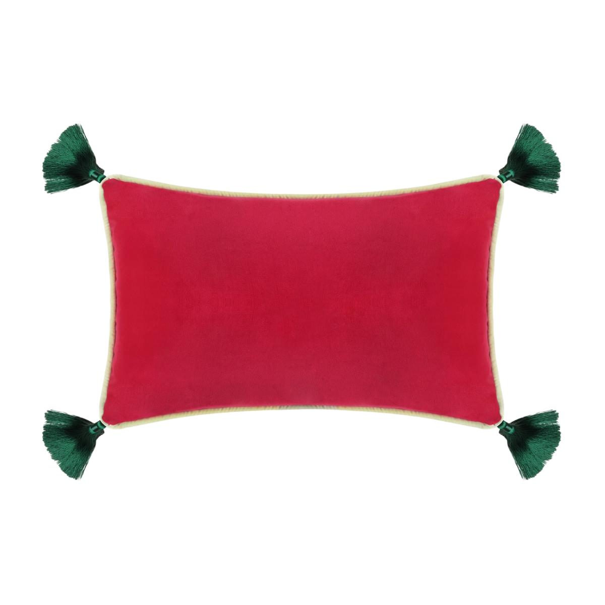 Fuchsia pink velvet rectangular cushion with mint piping and emerald green tassels This rectangular velvet lumbar cushion cushion adds a touch of luxe and cosiness to any room. Handcrafted in small batches, this scatter cushion is made in a bright fuchsia pink velvet with a luxurious feel and finished with a mint piping and silky emerald green tassels. Composition: Velvet front and back, velvet piping, polyester tassels Includes feather pad Removable cover Discreet zip closure Dry clean only