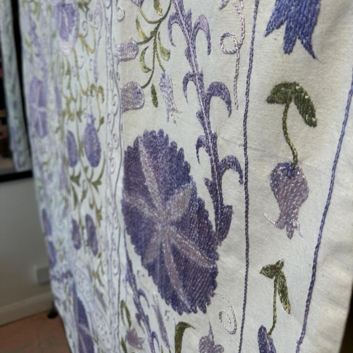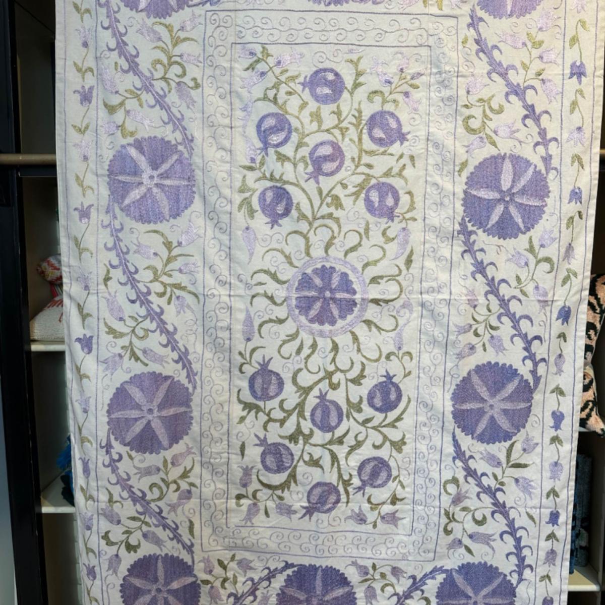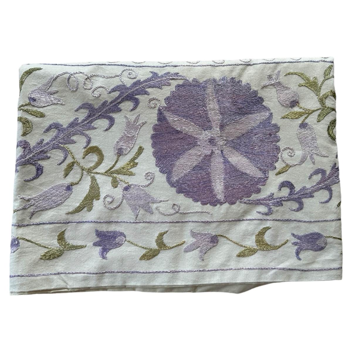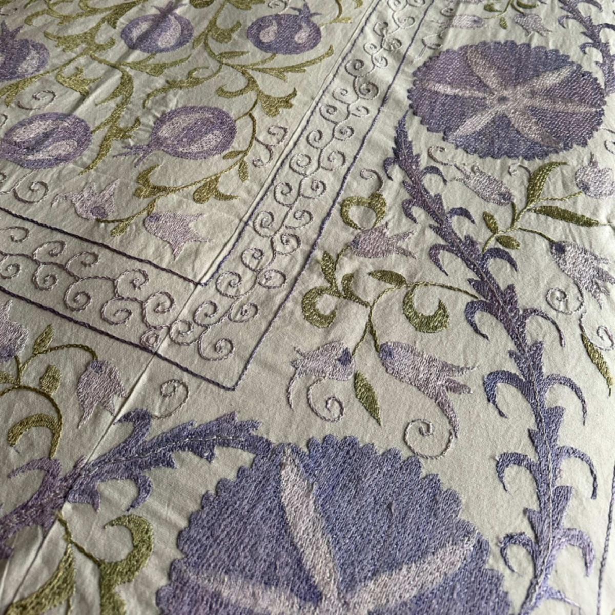 Stunning hand embroidered Suzani throw. These are all one of a kind. Perfect to throw over the end of a bed or sofa. Or use to upholster a bed head or stool. This one is a very pretty lilac and green. It has a cotton backing.