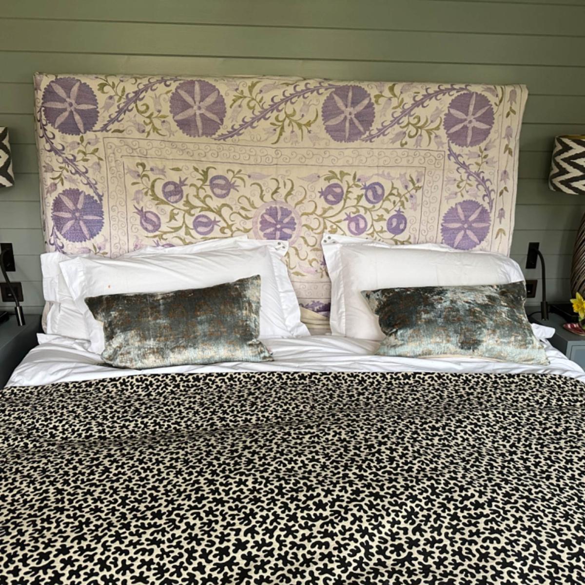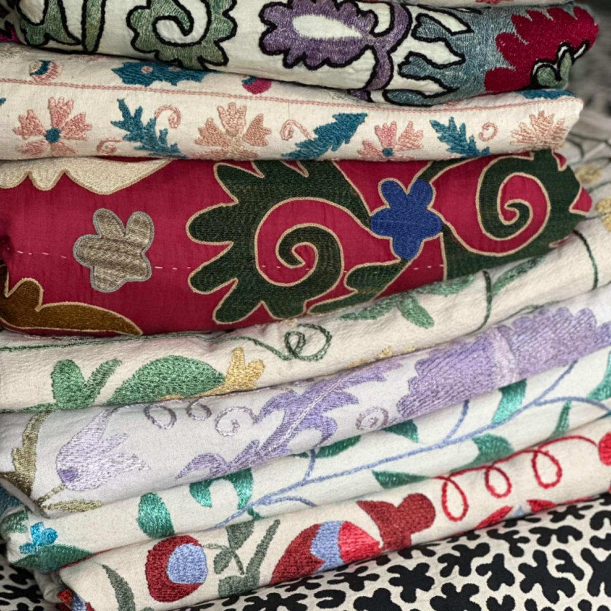 I love the vibrant mix of pink, purple, and green on this Suzani throw - it’s a versatile piece that can brighten up neutral sofas or beds effortlessly. It works particularly well in bohemian or eclectic interiors, adding a splash of colour and pattern without overwhelming. For styling tips, try draping it casually over the back of a sofa or folding it at the foot of the bed for an inviting layered look. It also pairs nicely with natural textures like rattan or linen for a relaxed yet curated vibe. This throw's bold design makes it a focal point, so keep surrounding accessories simple to let it stand out.
