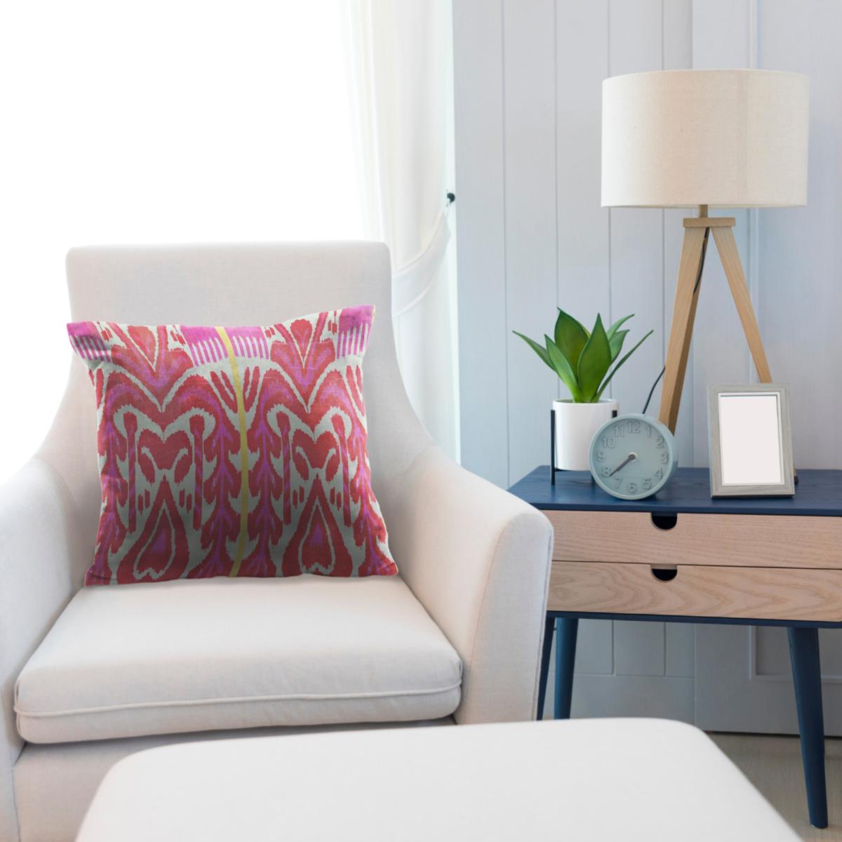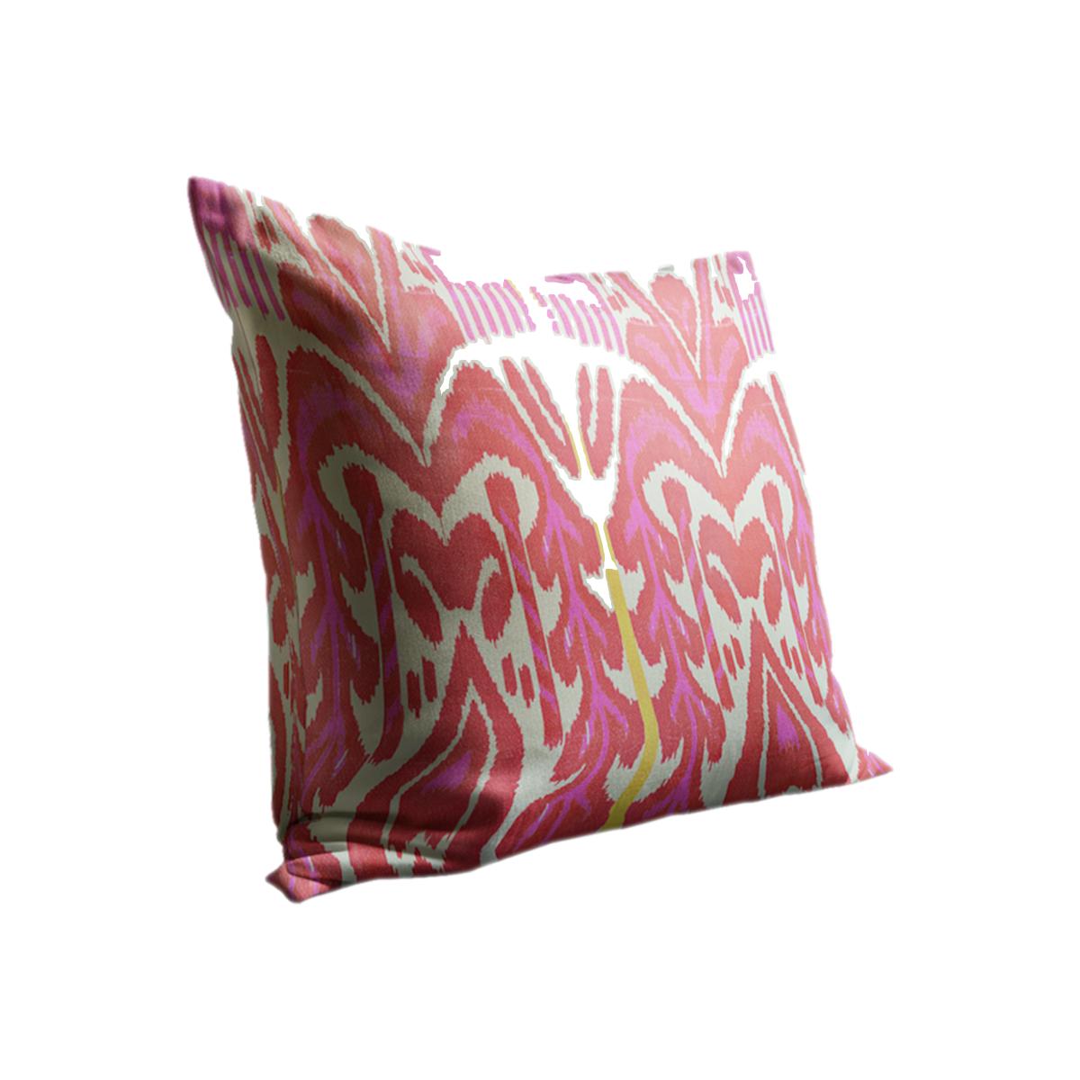 Introducing our stunning new ikat-inspired pillows, handcrafted in velvet and feature our luxurious down-alternative inserts. These velvet ikat inpspired pillows are both modern and timeless. The most versatile accent pieces that will effortlessly elevate any space. This particular pillow features an ikat design in various shades of pink, complete with a yellow stripe down the middle.