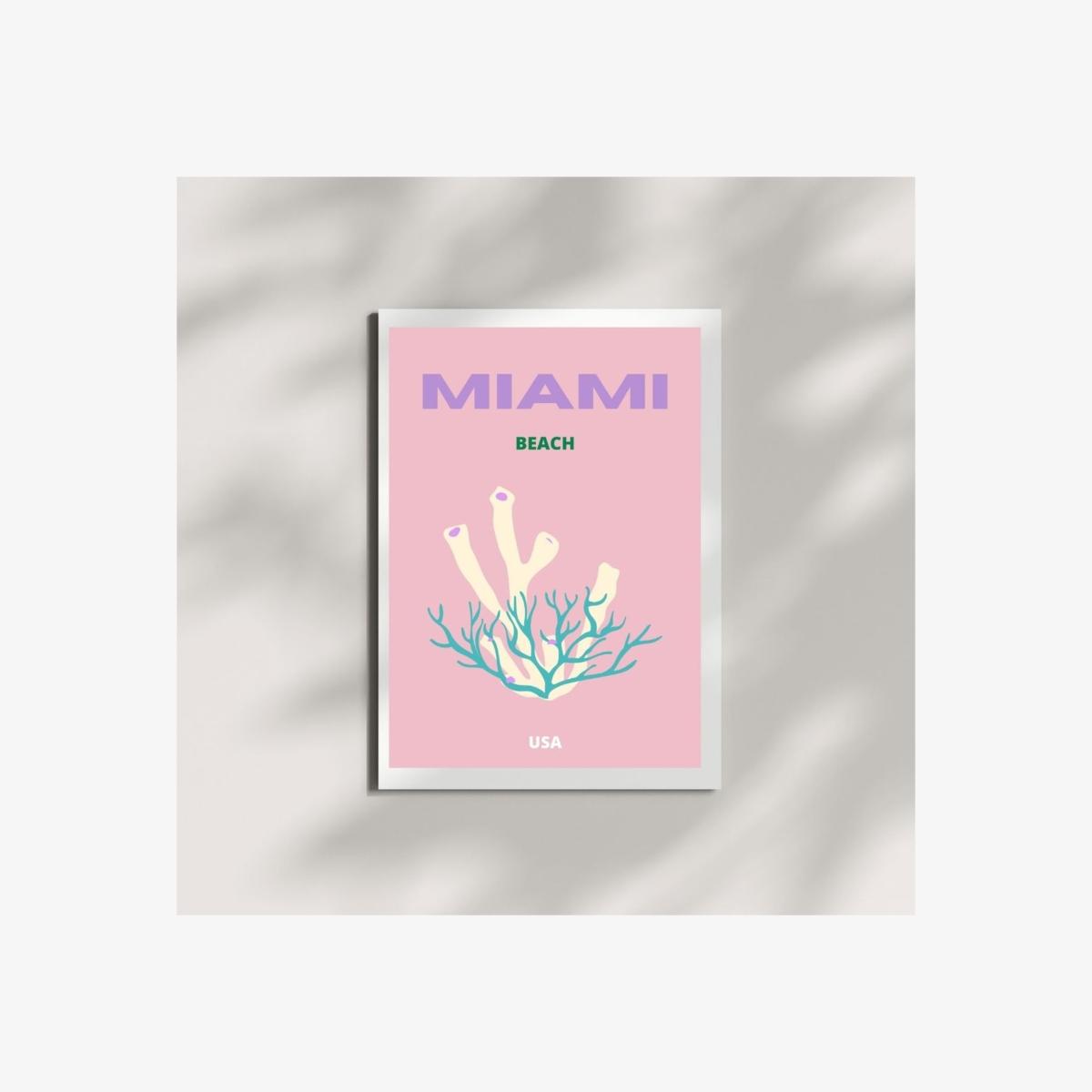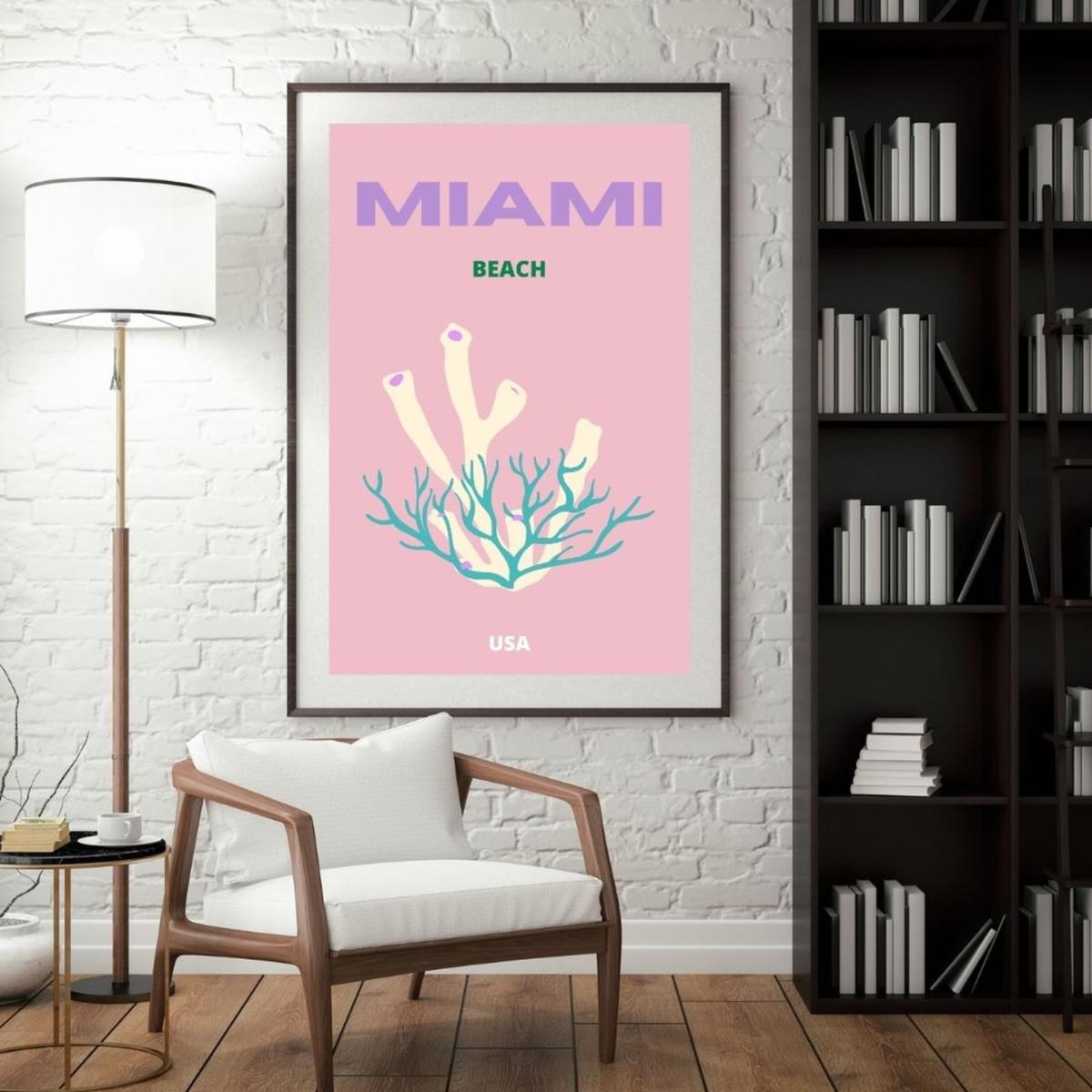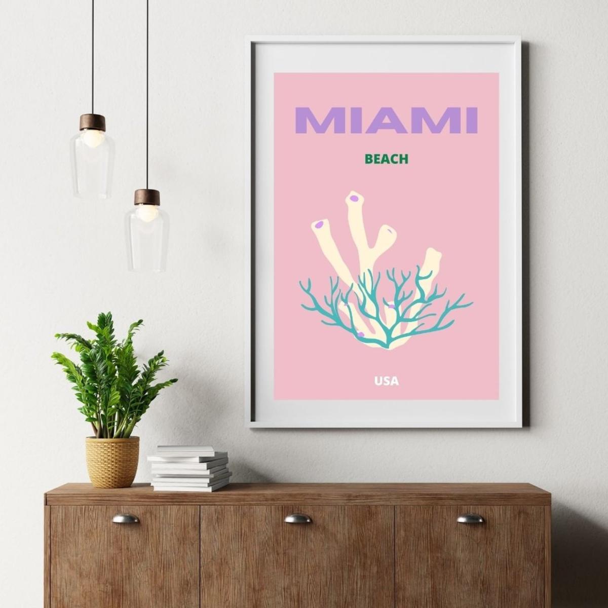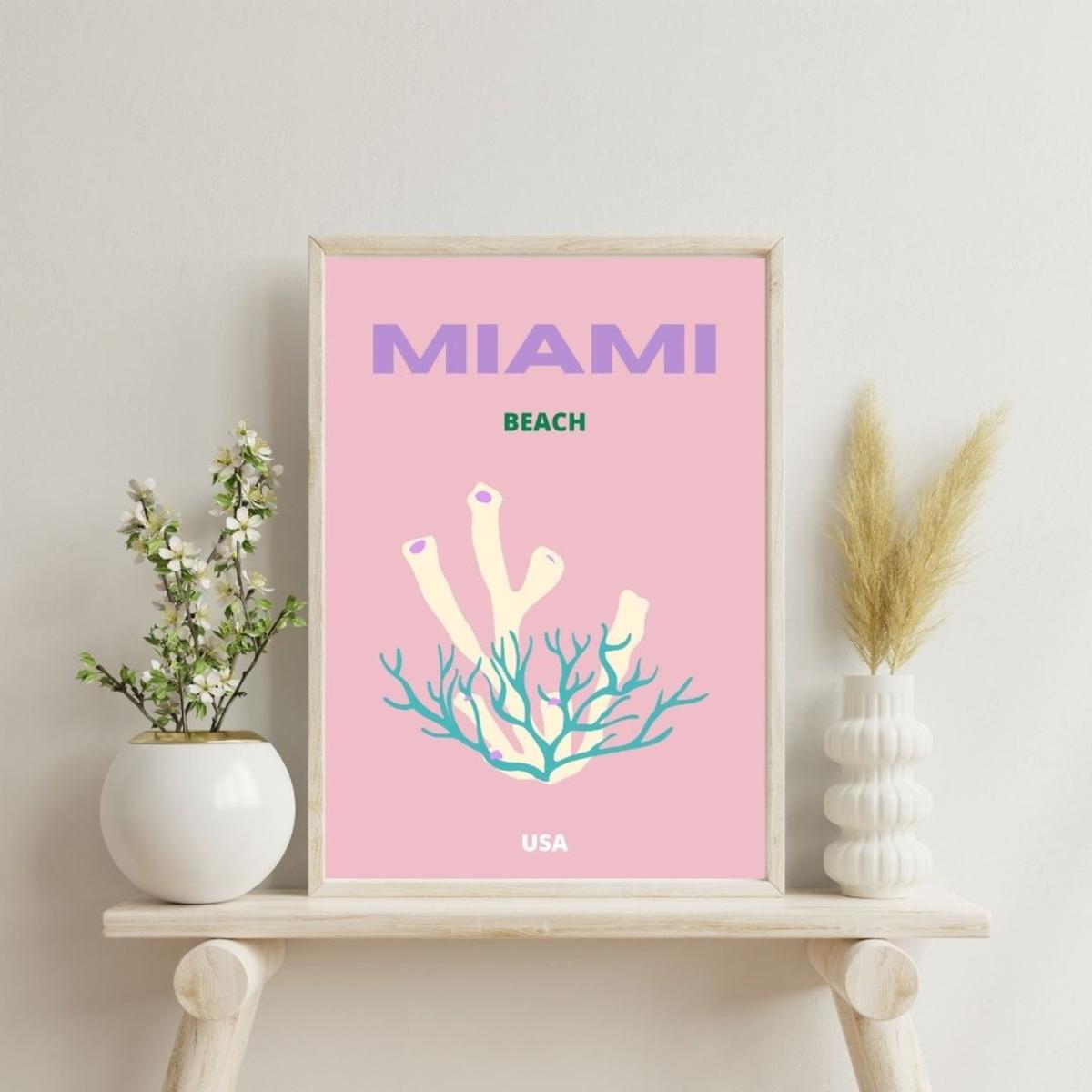 This vibrant A3 poster captures the essence of Miami Beach, USA, with its pastel hues and unique coral design. It's a perfect addition to any space, bringing a hint of tropical elegance and coastal charm. Ideal for beach lovers and decor enthusiasts who appreciate bold, artistic expressions. Note: We offer this poster unframed at the moment.