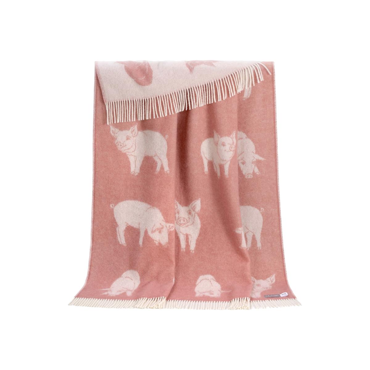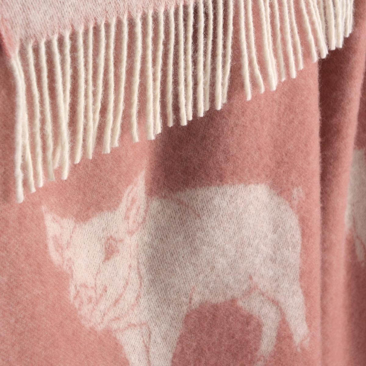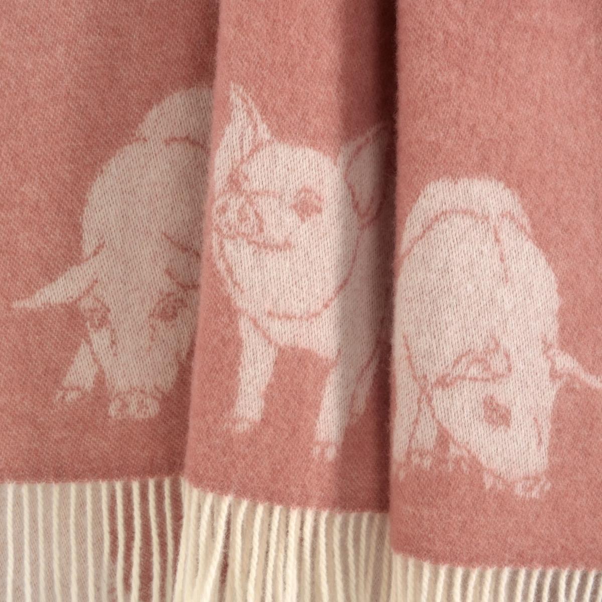 Add some character and a splash of colour with our Piglet throw, which features an array of cute little piglets. Made from 100% pure wool, this warm throw will keep you toasty through the cool winter months and takes the chill off cooler summer evenings. It is fully reversible, featuring a bold pink and off-white colour scheme. Soft wool fringed edge finishes off this statement blanket. This throw is the perfect addition to any home and makes a wonderful gift.
