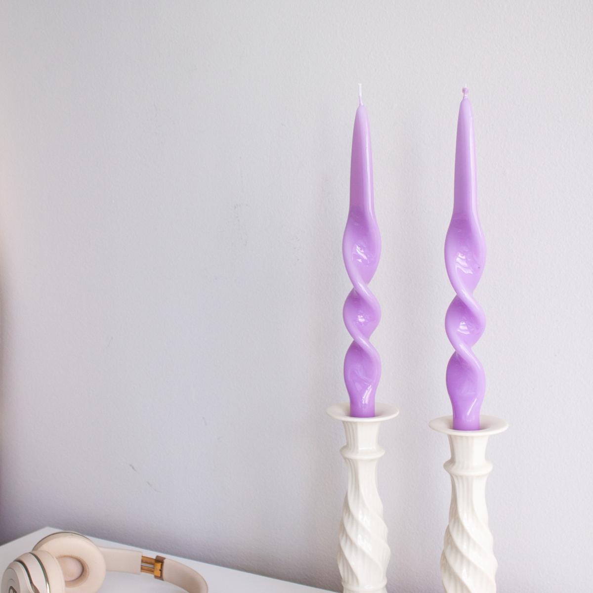 High-gloss taper candles in purple that are nothing but chic. style them sky high on minimalist candle sticks or grab your heirloom / vintage ones and adorn your holiday table. quite the accent for all forms of decor (boho, vintage, retro, minimalist, etc.) finished by hand from an italian family that has been making candles since the 1800s.