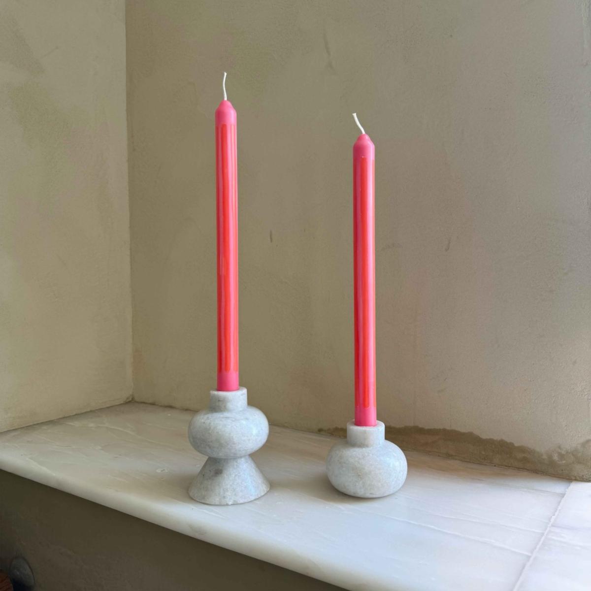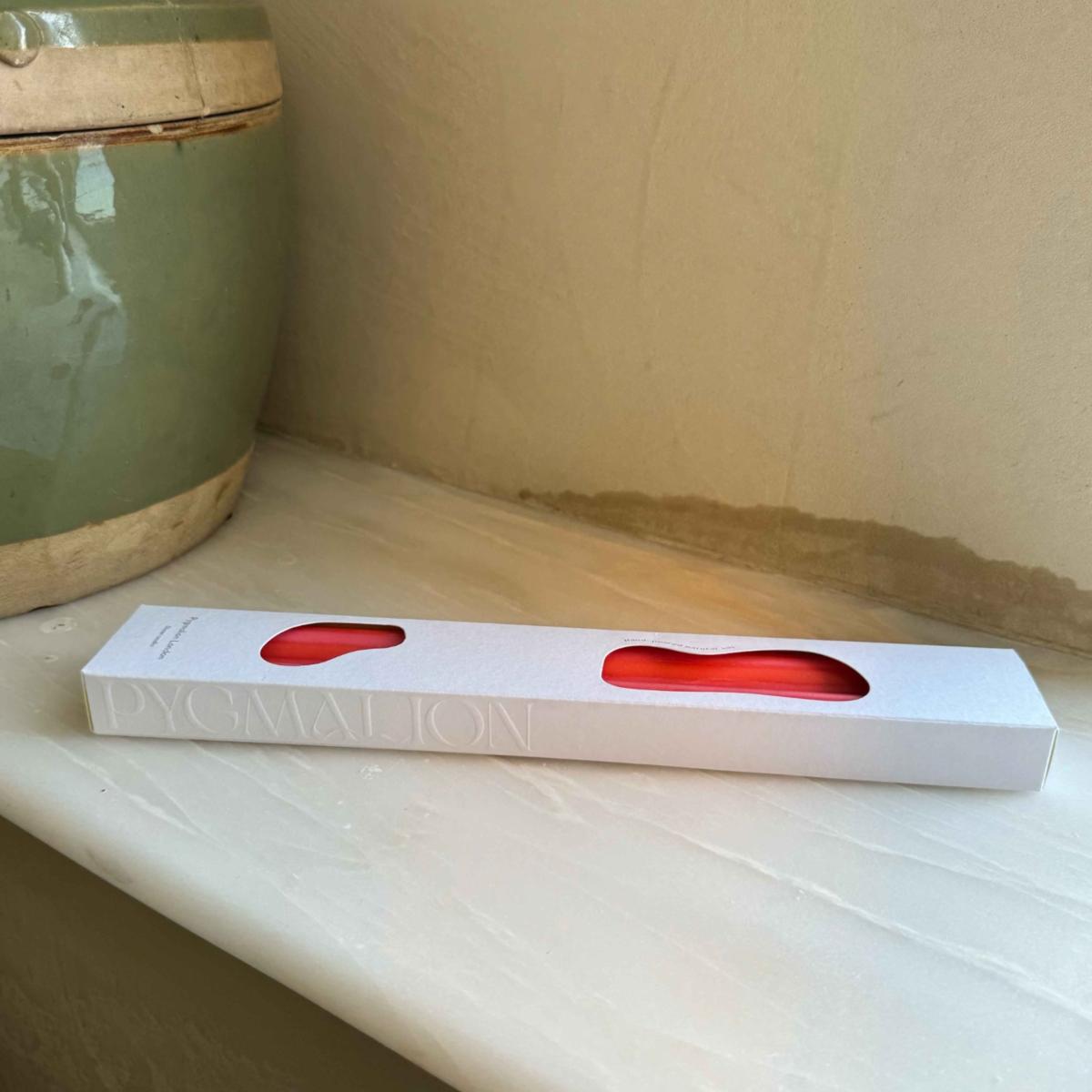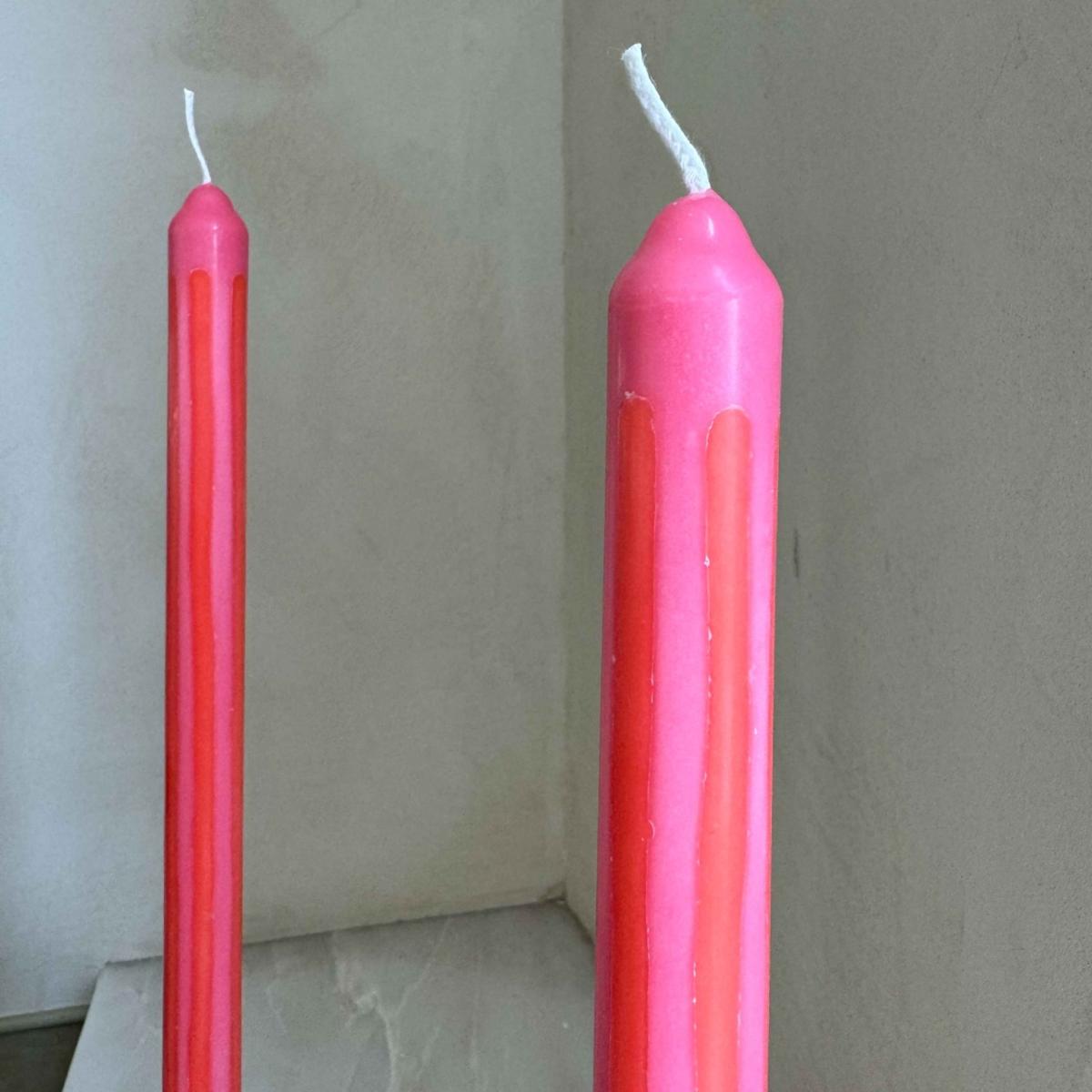 Pair of two dinner candles, hand-poured into loose stripes of parlour pink and blood-orange red vegetable wax. Dinner candles like you've never seen before - hand-poured using 100% natural wax, natural dyes and pure cotton wicks. Pygmalions are designed for the joy of hosting: good food, great company and memorable ambience. The packaging was dreamed up using this same ethos - bringing luxury, design, sustainability and fun together to create the perfect gift. The candles are 29cm allowing for a leisurely 10+ hour burn time.