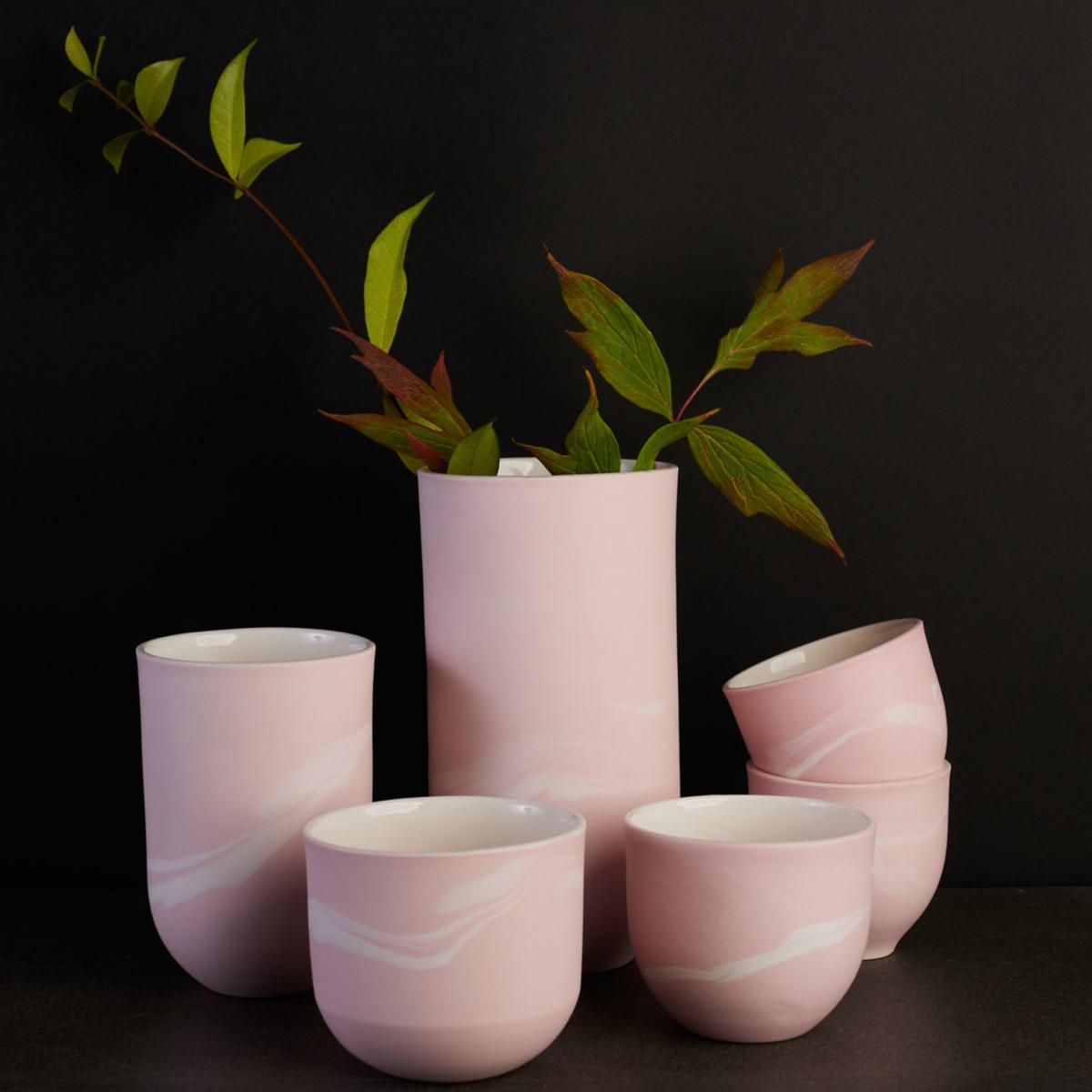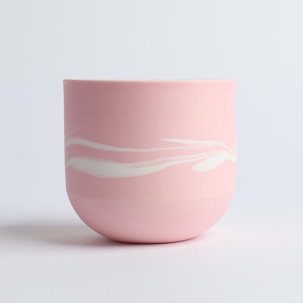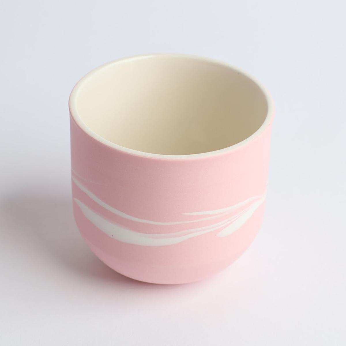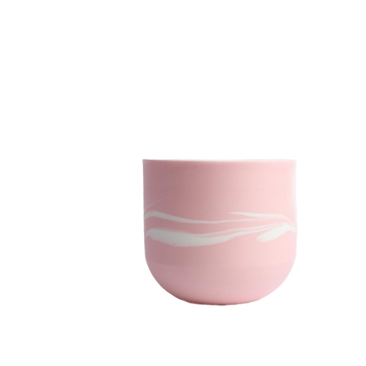 Marbled porcelain vessel / candle holder. Approximately 5 inches tall — beautiful complement to other pieces. Can also be used as a small vase, planter, candle holder, or decorative bowl. Its flexible role is part of its charm. Clear glazed interior, lusciously smooth hand-sanded exterior. Dishwasher safe. Due to their handmade nature, the swirl designs will vary, and tops may be slightly oval (not perfectly round).