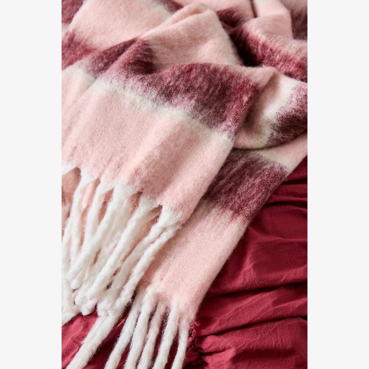 Soft pink throw with stripes and white fringed edges, perfect for getting cosy or using as an accent piece on beds or sofas. **Content + Care** \- 100% Acrylic \- Machine wash **Size** \- 150cm x 125cm