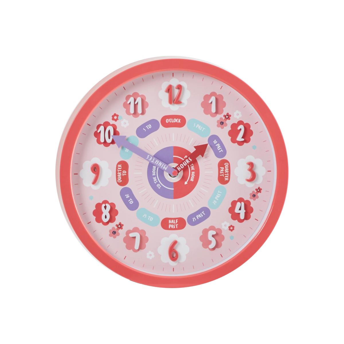 This cute and colourful tell the time clock for kids is a great accessory for hanging up in your child's bedroom for them to learn how to tell the time in a fun way. Crafted from plastic with a glass face, you should take care when hanging this clock against painted or polished surfaces and handle with care.