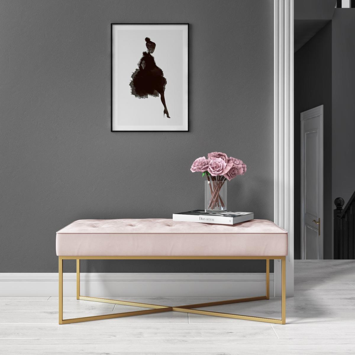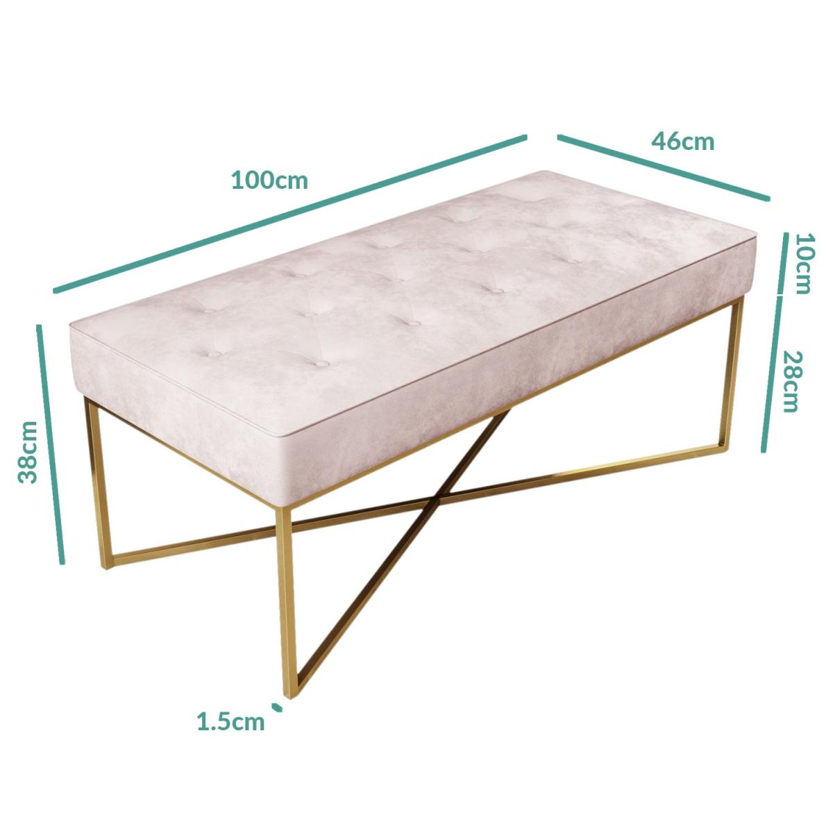 Features we love Pink velvet bedroom bench with gold legs Perfect for any bedroom, living room or hallway The open gold frame adds a modern contemporary touch Search 'Esme' to see the full range No assembly required All about me Add a hint of glam with this Esme bench. Beautifully upholstered in a plush pink velvet fabric, it features a quilted button topto give it an elegant and stylish finish. A shiny gold open frame base in a criss-cross design completes the look while also creating an illusion of space. It's perfect as additional seating and serves as a stylish footstool too. Position it in the hallway for practicality, in the hub of your living room, or bedroom at the end of your bed for an immediate focal point. There's no assembly either so can use it right away. Need to know Overall dimensions: H38 x W100 x D46 cm Number of hinges: 2 Colour: Pink and Gold Finish: Velvet and shiny legs Material: Velvet and metal Weight: 10kg Assembly required: No