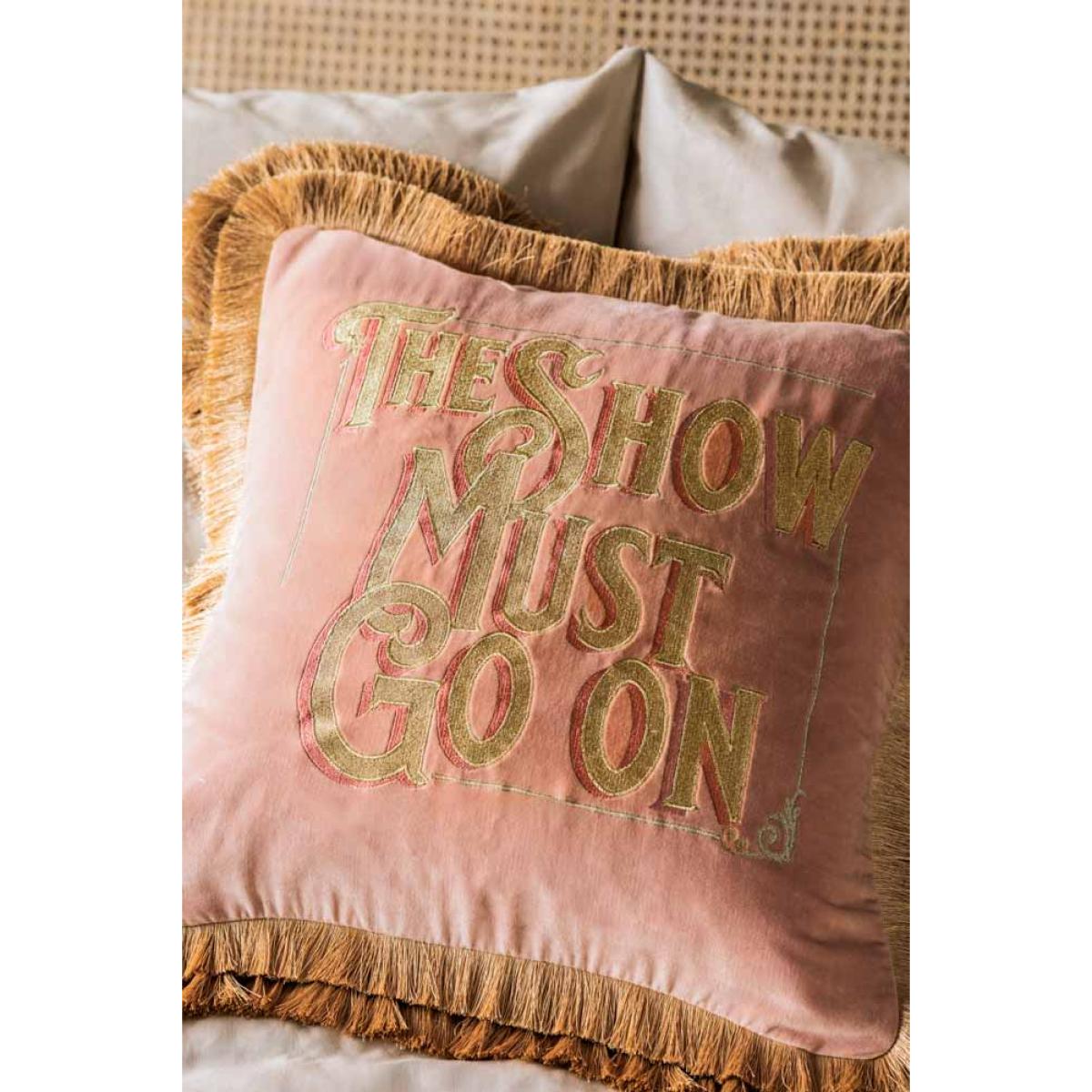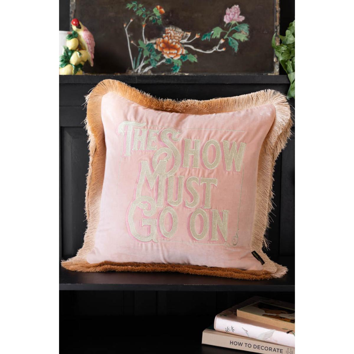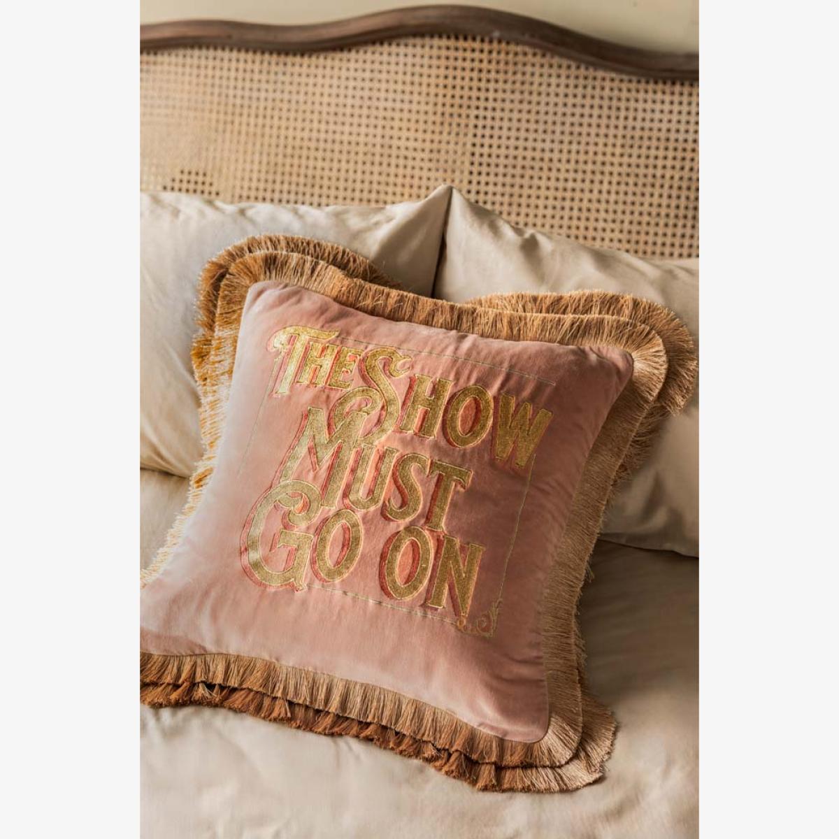 Bring a little theatrical flair to your space with this utterly fabulous velvet fringed cushion that’s here to steal the spotlight. Made from dreamy pale pink velvet and finished with glamorous gold tasselled edges, this soft sofa cushion is a standing ovation in cushion form. Front and centre, in a gloriously glitzy gold embroidered font, it reads “The Show Must Go On” – because even on the dullest days, a little sparkle and drama can go a long way. Whether you’re styling it on your sofa or bed, it’s guaranteed to bring joy, sass, and a whole lot of stage presence to your home. Perfect for maximalists, dreamers, and anyone who lives life with a touch of flair. Curtains up, cushions fluffed, let's go! - Gold Velvet Double-Fringed Show Must Go On Embroidered Cushion - Measures: W50cm x H50cm - Materials: Polyvelvet - Duck feather inner included - Wipe clean with a dry cloth only
