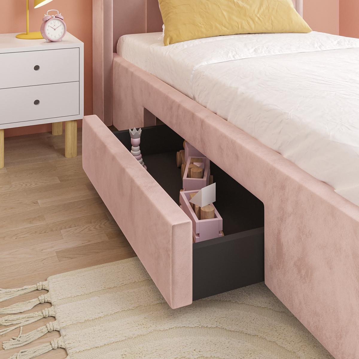 Features we love Single bed frame with tall padded winged headboard Upholstered in a soft-to-touch pink velvet fabric With vertical stitch detailing and natural wood legs Storage drawer on castor wheels for easy opening Drawer can be fitted on either side of the bed All about me Make a stunning impression in any bedroom with this gorgeous single bed. It's perfect for older kids and beyond, thanks to its timeless design, from the vertical stitch detailing on the headboard to its padded and velvet upholstered finish. It features a large drawer that's easy to slide out, ideal for folded items, bed linen and keeping clutter at bay. Made with wood and metal and supported by chunky yet discreet light wood legs, it has been made to last. It fits a UK single mattress, which isn't included, so you're free to choose a mattress of your choice. Need to know Bed dimensions:W114 x D211 x H122 cm Inner drawer dimensions:W102 x D48 x H12 cm Bed mattress size: Standard UK single (90 x 190cm / 3ft) Max weight capacity: 100kg Product weight: 48kg Colour: Pink Finish: Upholstered Material: Wood, velvet fabric, metal, and sponge (padding) Bed base: Wood slats For use: Indoors Assembly required:Yes, it comes flat packed Mattresses included: No Packaging dimensions: Box 1: W113 x D107.5 x H23 cm / Box 2: W36.5 x D195 x H12 cm Packaging weights: Box 1: 33.5kg / Box 2: 18.5kg