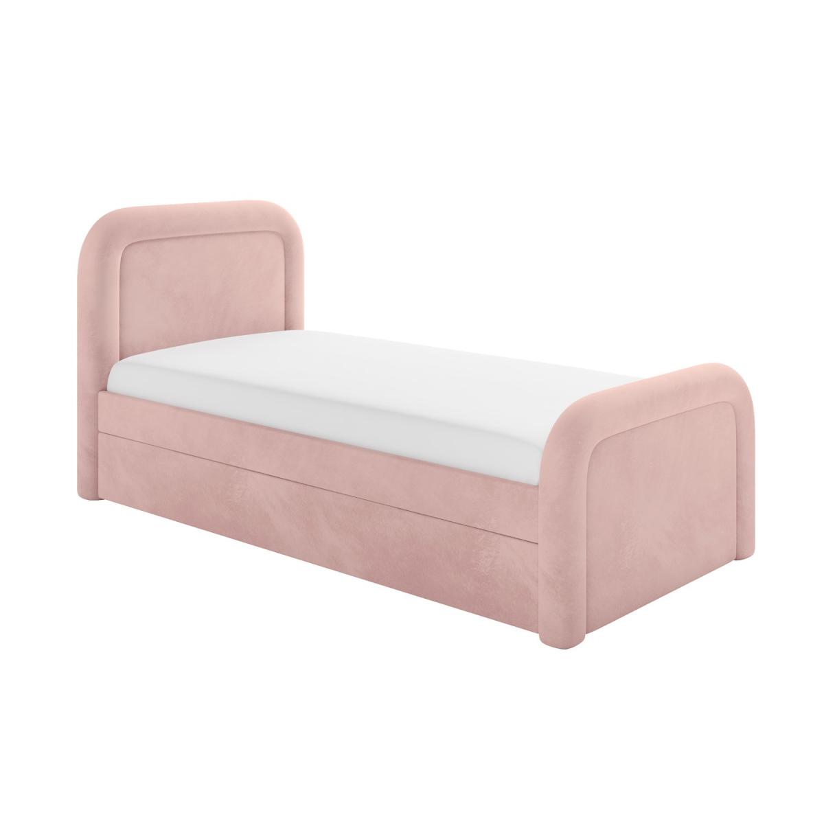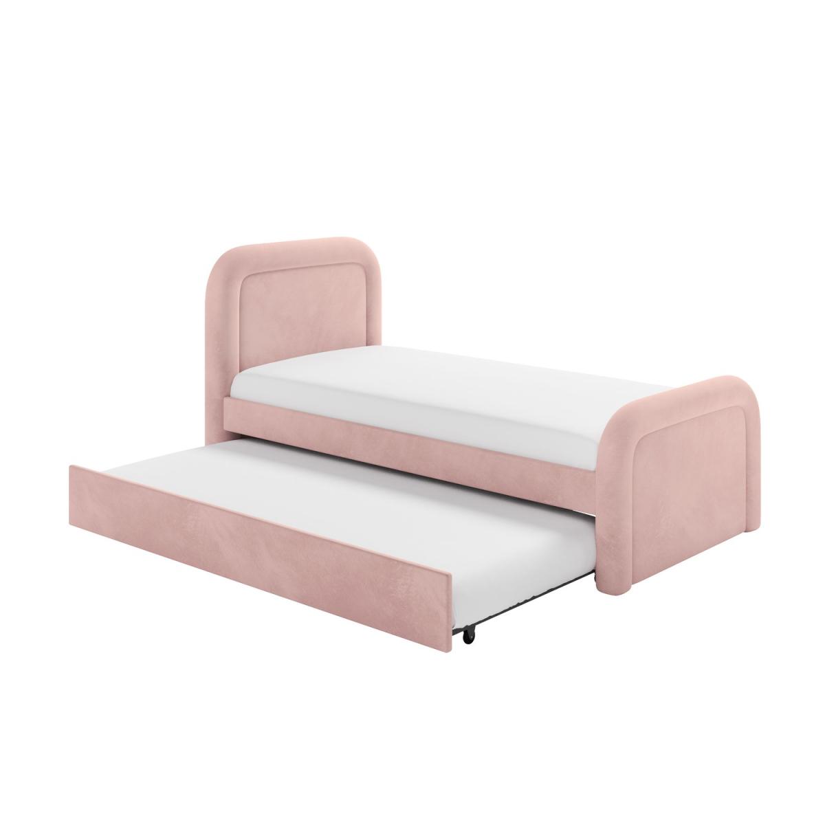 Featuring a sleek, curved design, the headboard adds a touch of modern sophistication to your bedroom. Trundle is fitted with castor wheels and pulls out from either side for effortless movement and easy setup. Luxuriously soft velvet fabric in a soft pink shade complements various interior styles. The pull-out trundle bed is seamlessly integrated beneath the main bed, offering a space-saving storage solution that keeps your room organised and clutter-free. Provides excellent support for the mattress, promoting airflow for added comfort and longevity. Enhance your bedroom with the Naomi single guest bed with trundle. Upholstered in a fabric, it features a plush curved headboard which blends comfort with style. This bed also offers a space-saving solution as the discreet pull-out trundle is perfect for a smaller room or an additional sleeping space. The trundle easily glides out as it's fitted with castor wheel and can be set up to open from the side that works best for your room. Both beds have wooden sprung-slatted bases for comfortable mattress support and fit a standard UK single mattress.