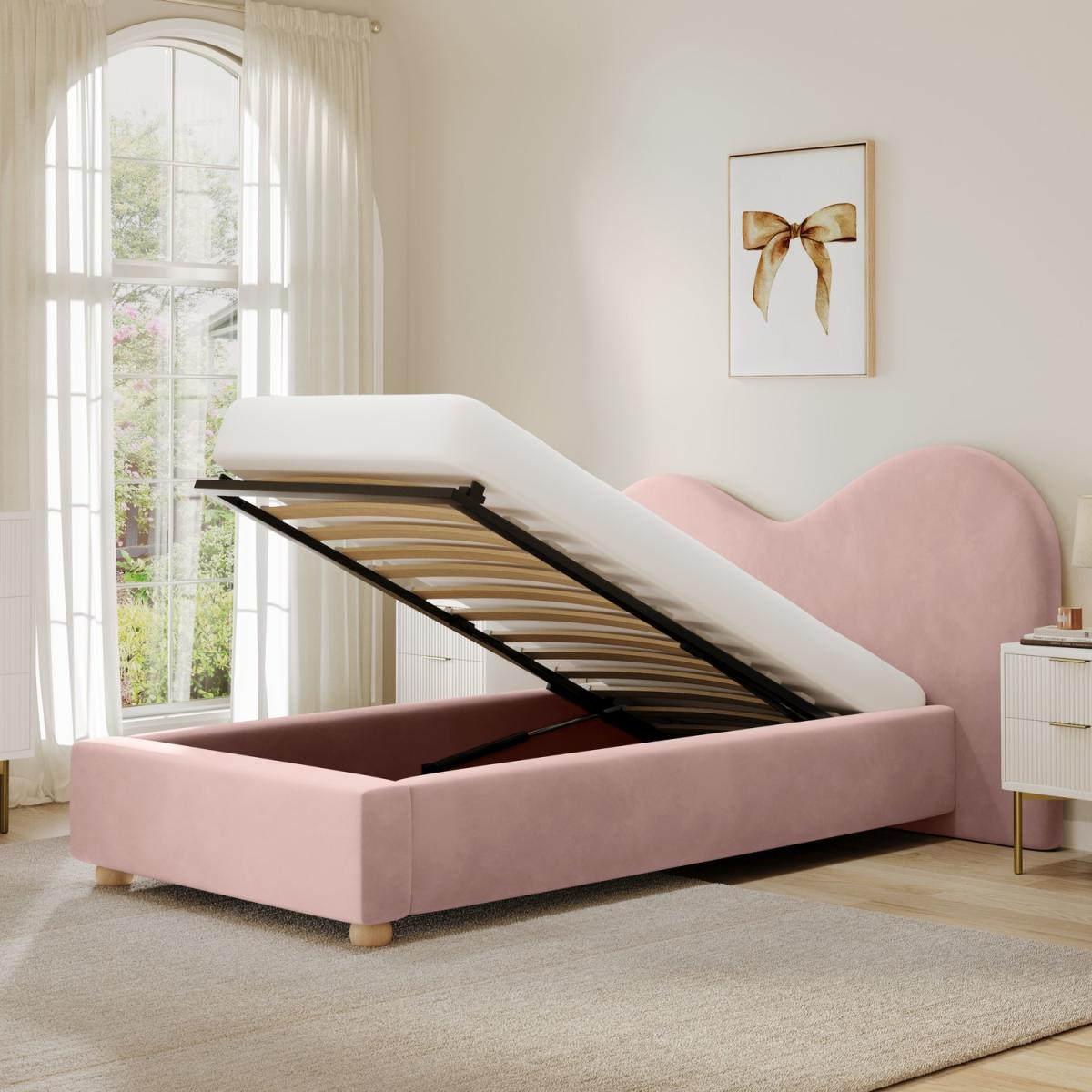 Designed to elevate any bedroom, the wide curved headboard adds a modern touch and creates a warm, inviting feel. Soft and luxurious velvet fabric in a versatile pink shade complements various bedroom styles. Convenient storage space accessible via a smooth gas-lift mechanism, ideal for bedding, pillows, or seasonal items. The ottoman compartment features a solid base that helps protect stored items from dust and wear. Provides excellent support for the mattress, promoting airflow for added comfort and longevity. Elevate your bedroom with the Aria Ottoman Bed, a stylish blend of comfort, function, and versatile design creating a focal point in any bedroom. Upholstered in soft-touch pink velvet fabric, it features a wide curved headboard for an inviting, sophisticated touch. Perfect for older kids and teens, this bed adapts to changing styles while offering generous ottoman storage with a solid base to keep things tidy. Also, this bed has a sprung slatted base for comfortable mattress support and fits a UK standard single-size mattress.