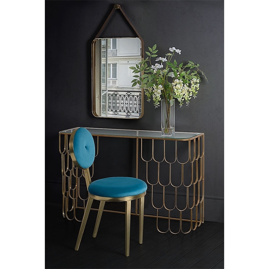 Glamorous design inspired by Mid-Century Italian architecture and interiors. Suitable for use as a console or dressing table. Steel construction with brass effect finish. Toughened glass top with bevelled edge. Co-ordinating coffee and side table available.