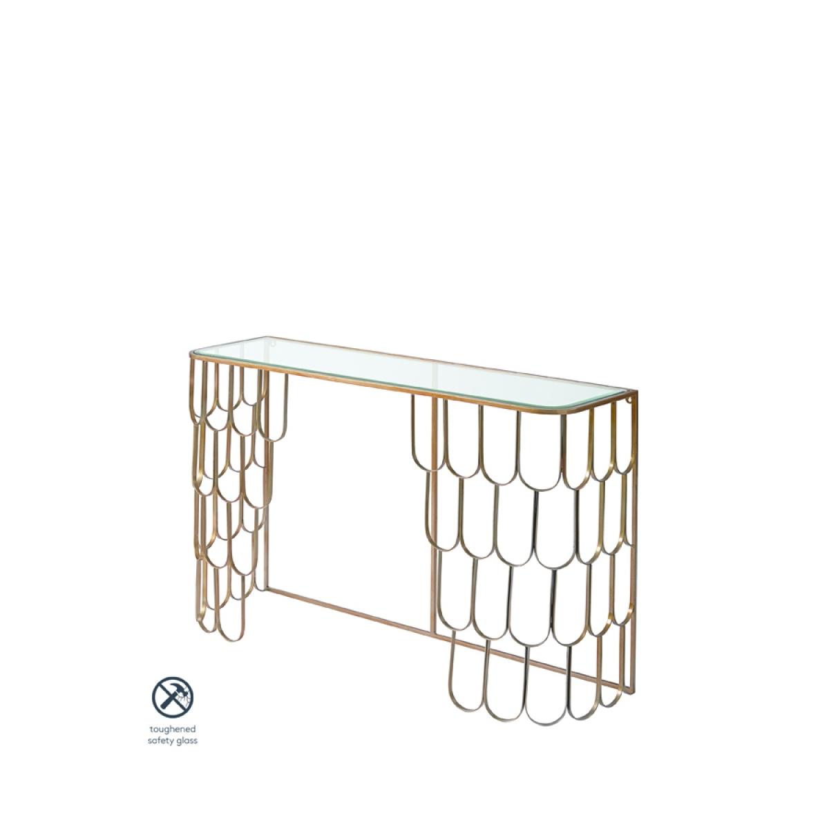 Glamorous design inspired by Mid-Century Italian architecture and interiors. Suitable for use as a console or dressing table. Steel construction with brass effect finish. Toughened glass top with bevelled edge. Co-ordinating coffee and side table available.