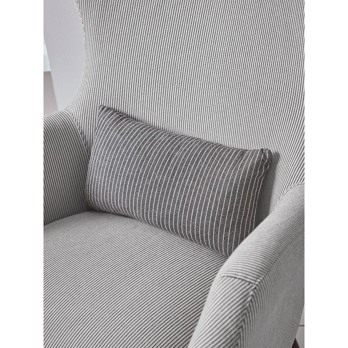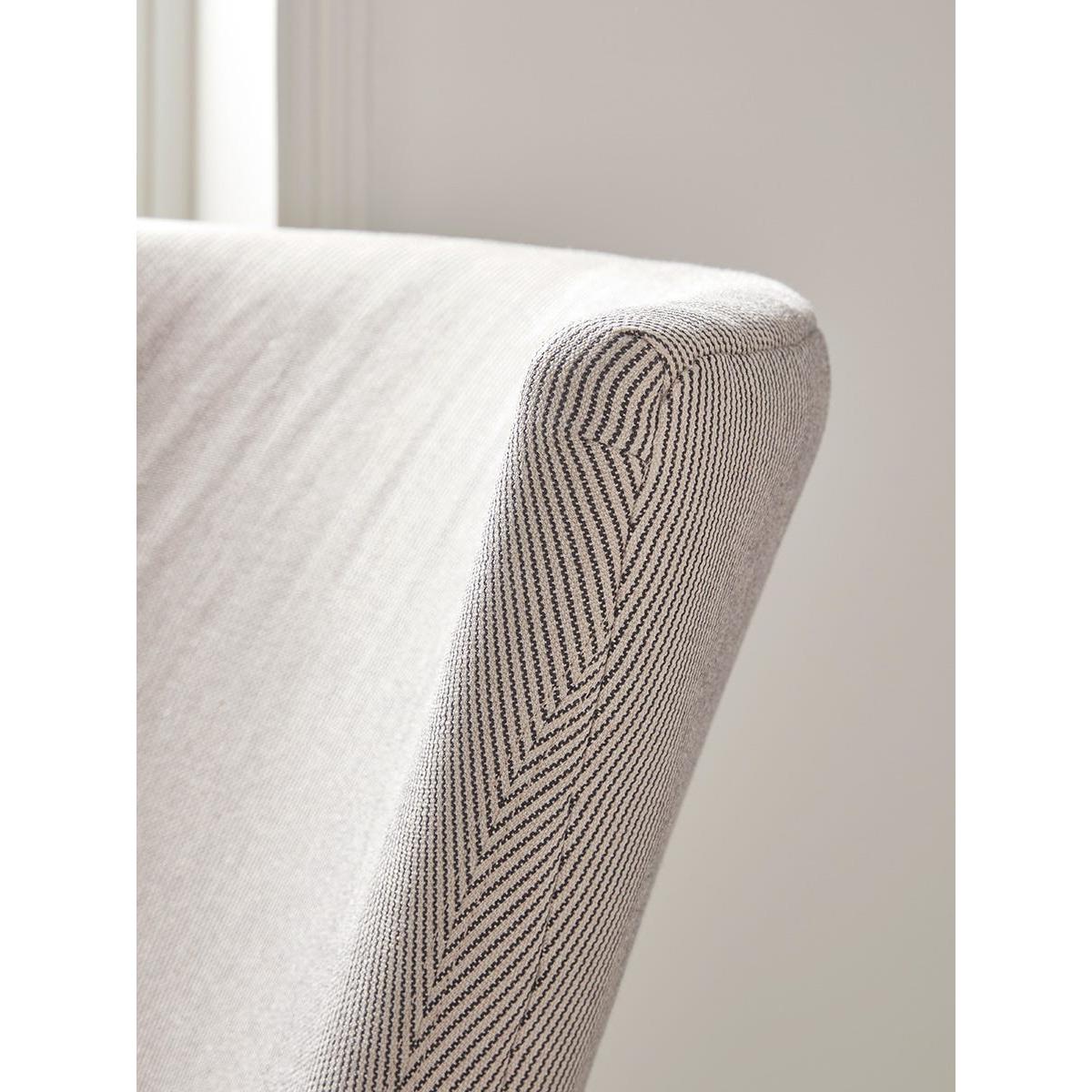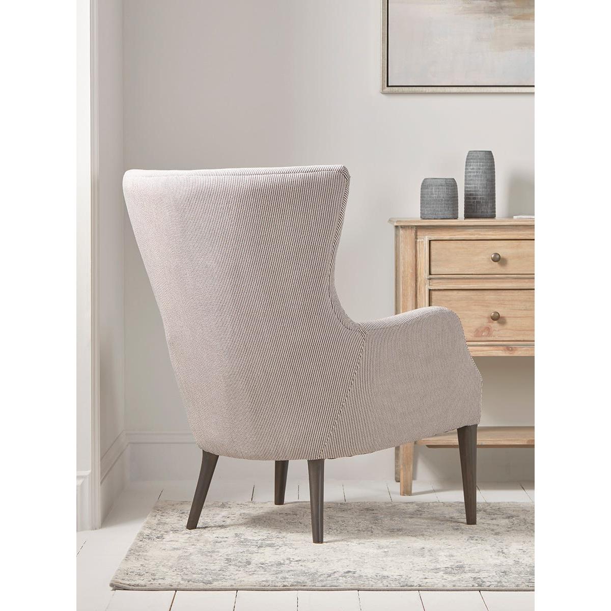 With a mid-century outline, crisp ticking stripe upholstery fabric and dark wood legs, our Pinstriped Tall Chair is first and foremost designed for comfort. The high back and curved arms will draw you into this chair’s welcoming embrace wherever you place it. Its enduring style and versatile fabric will make it a timeless addition to any setting.