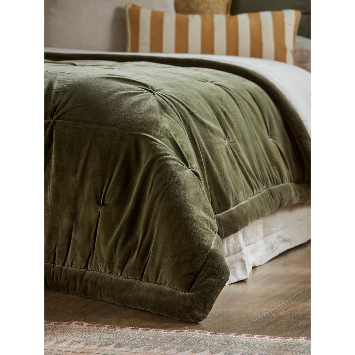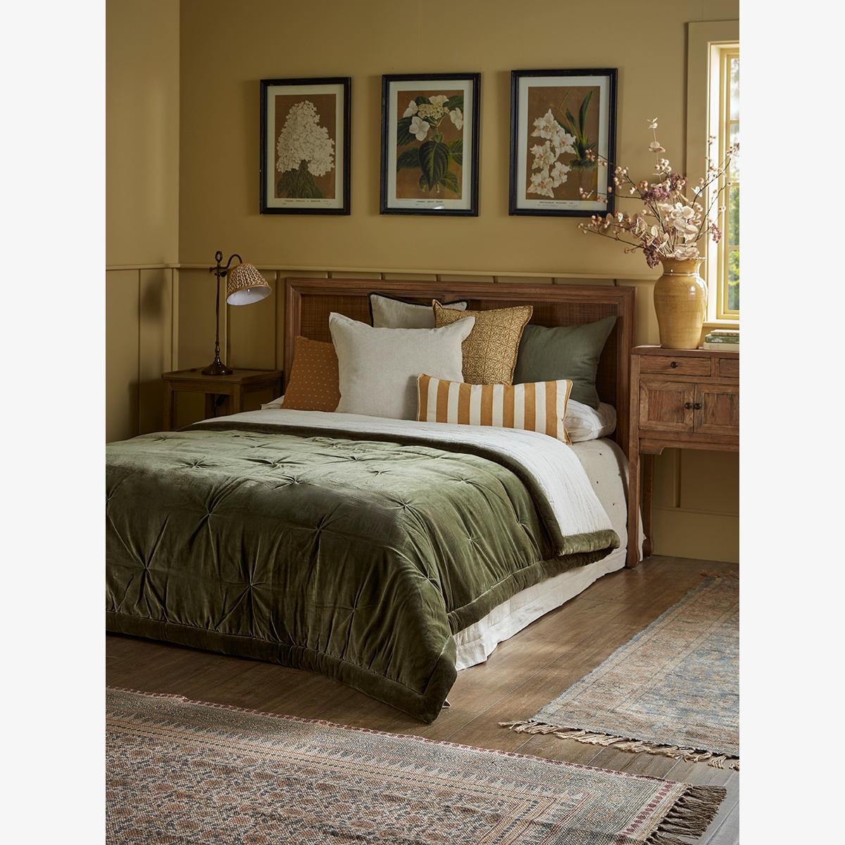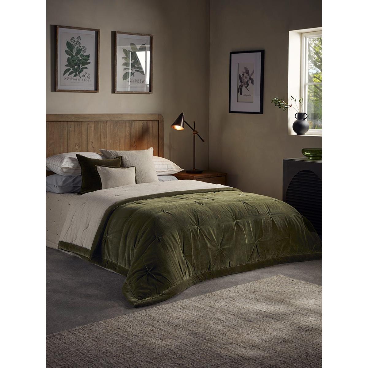 I really like the Pintucked Velvet & Cotton Linen quilt in moss green because it adds a rich texture and a relaxed, cosy feel to a bedroom. It works well in both classic and contemporary interiors, especially those with earthy or muted colour palettes. For styling, consider layering it over neutral bedding to create visual interest, or fold it at the foot of the bed as a decorative accent. Its plush velvet detailing makes it perfect for autumn and winter months, and it pairs beautifully with warm wood tones or stone accents. For a polished look, keep complementary cushions in similar tones or subtle patterns - the natural hue makes it versatile enough to mix and match effortlessly.
