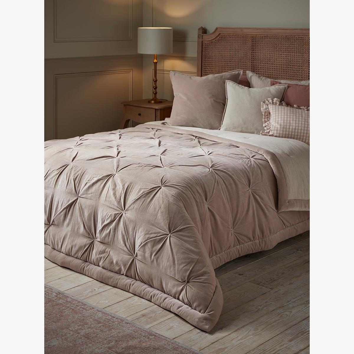 With quilted pin tucked style detailing, this dusky pink throw adds a beautiful and subtle touch of colour to your home, whilst its material of cotton velvet adds a luxurious finish to it. Reversible to a neutral side that is crafted from a blend of linen and cotton, this throw has enough versatility to work in a variety of room styles and interiors, depending on your mood.  Also available in blue.