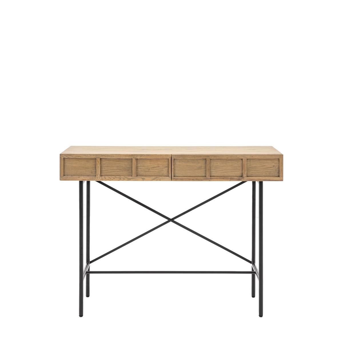 * Designed for modern apartment living* Retro style panelled fascias in oak veneers and solids* Weathered grey finish with black metal legs and underframe* Matching pieces available The Pinxton 2 Drawer Console Table combines modern design with retro flair, featuring oak veneers and solids with a weathered grey finish. Paired with black metal legs and underframe, this console table is perfect for modern apartment living, with matching pieces available for a cohesive interior.