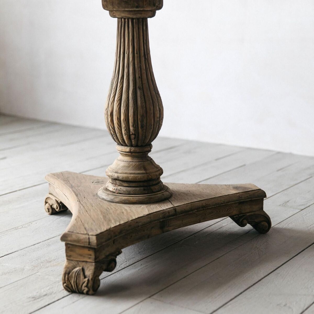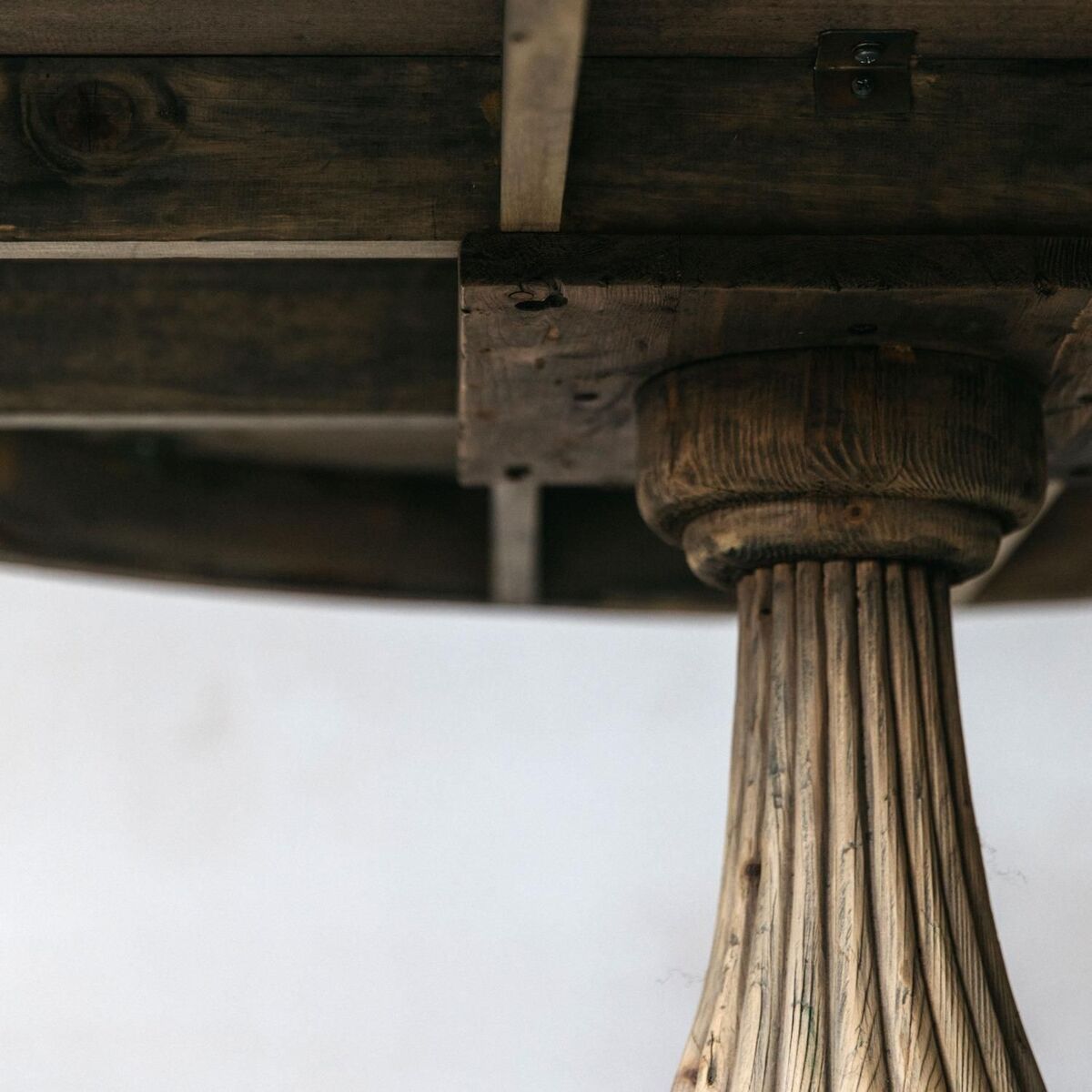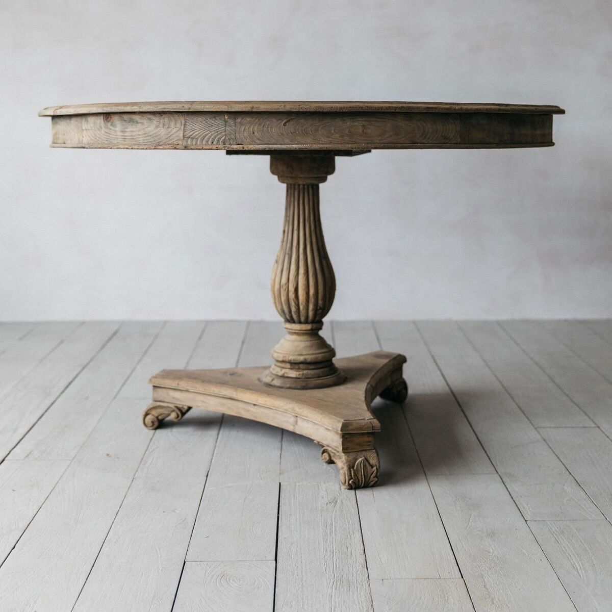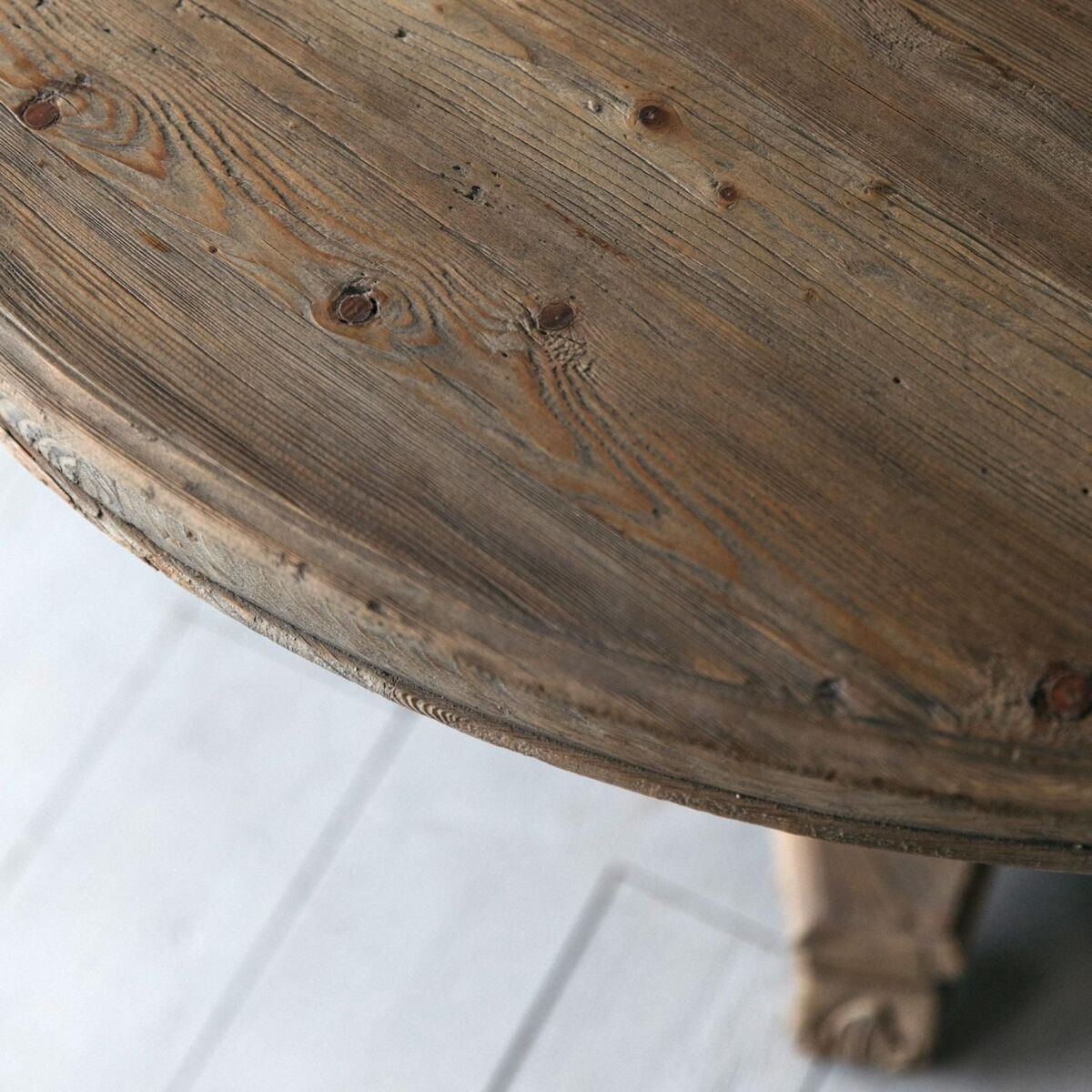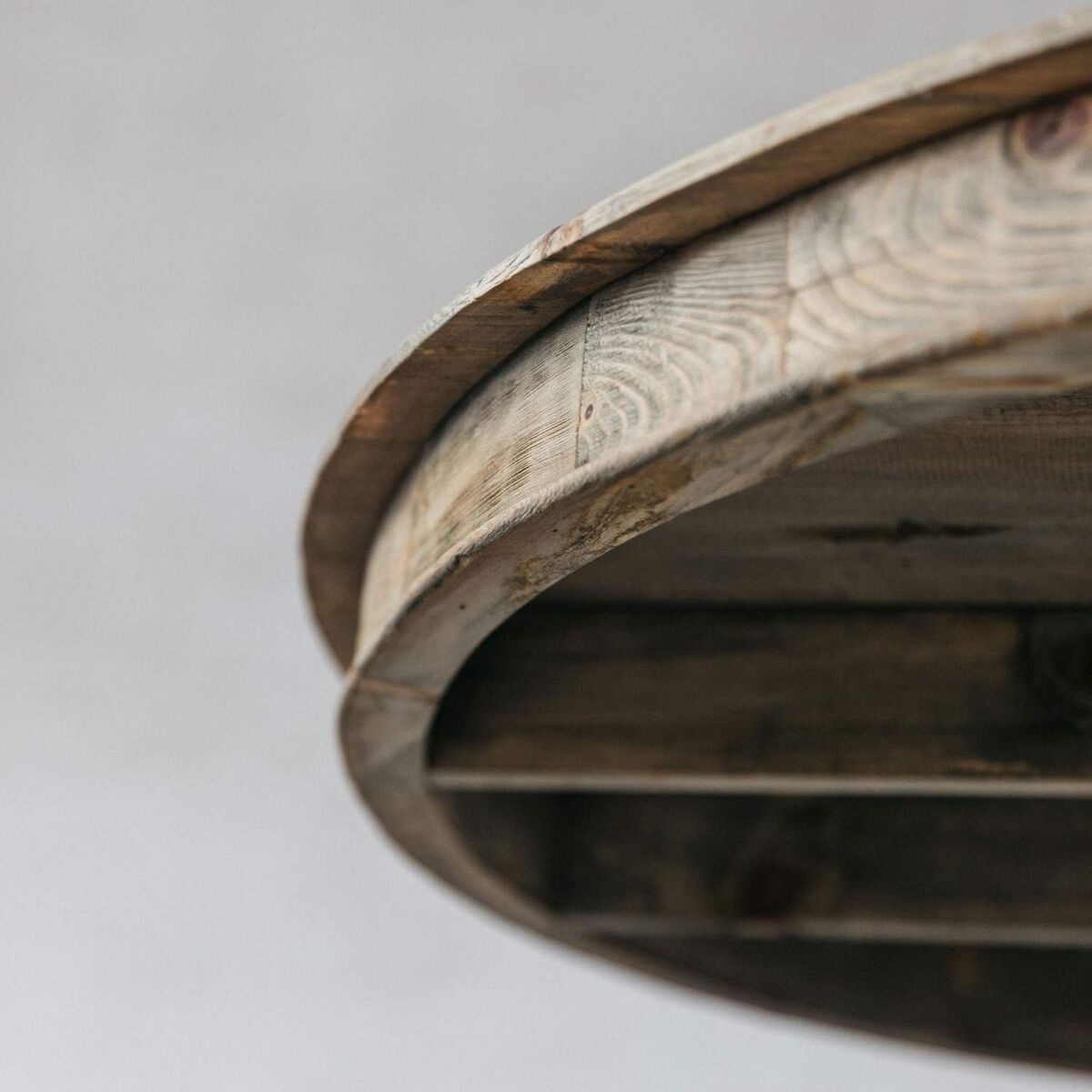 Crafted from reclaimed pine wood, our pioneer inspired dining table features a drum style tabletop sat upon a triangular base with three ornately scrolled feet.