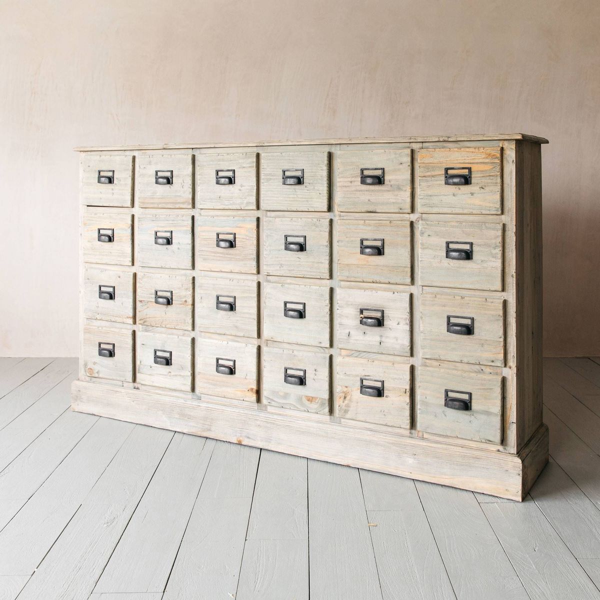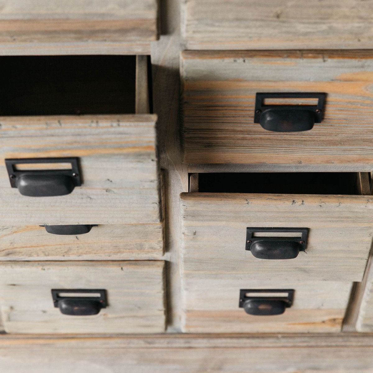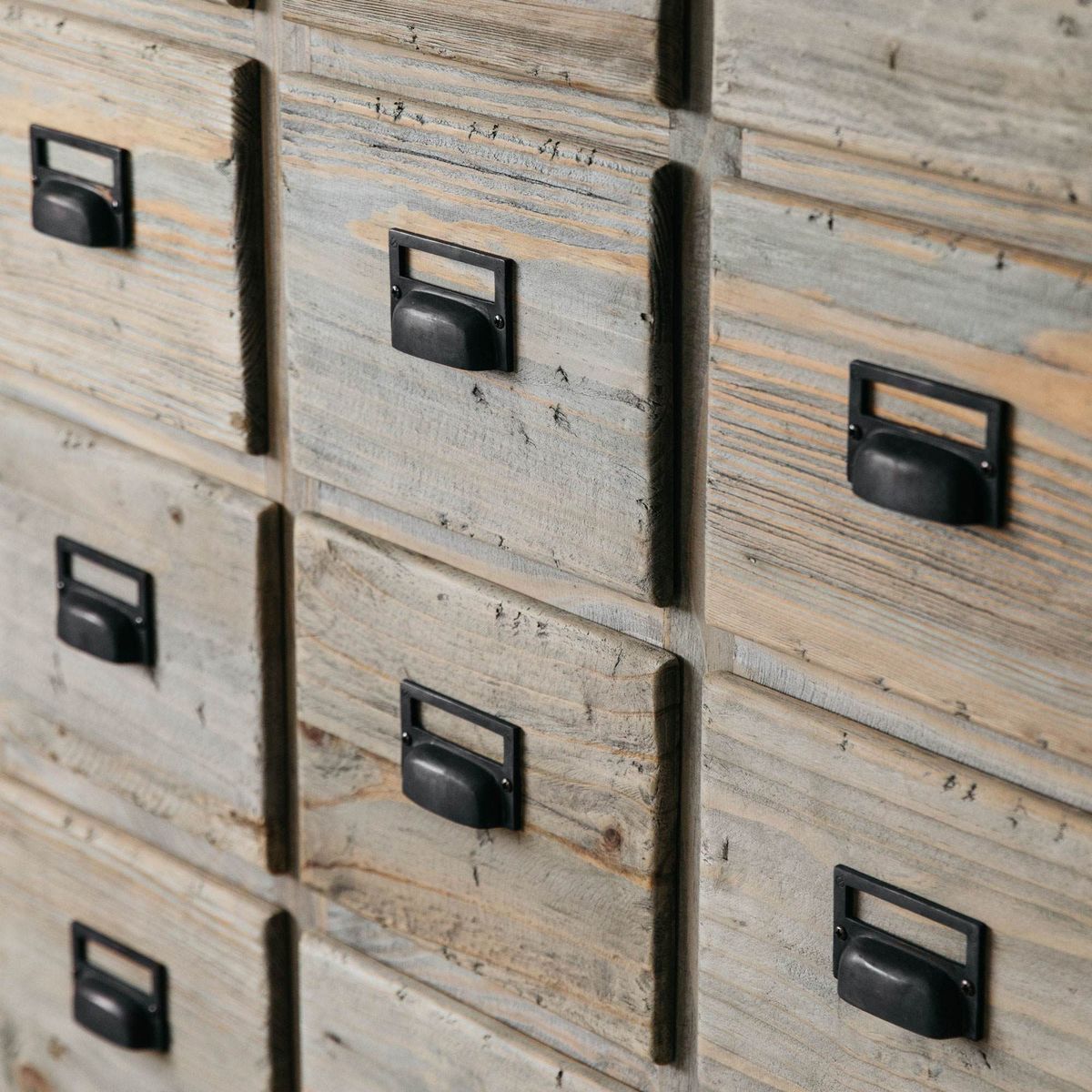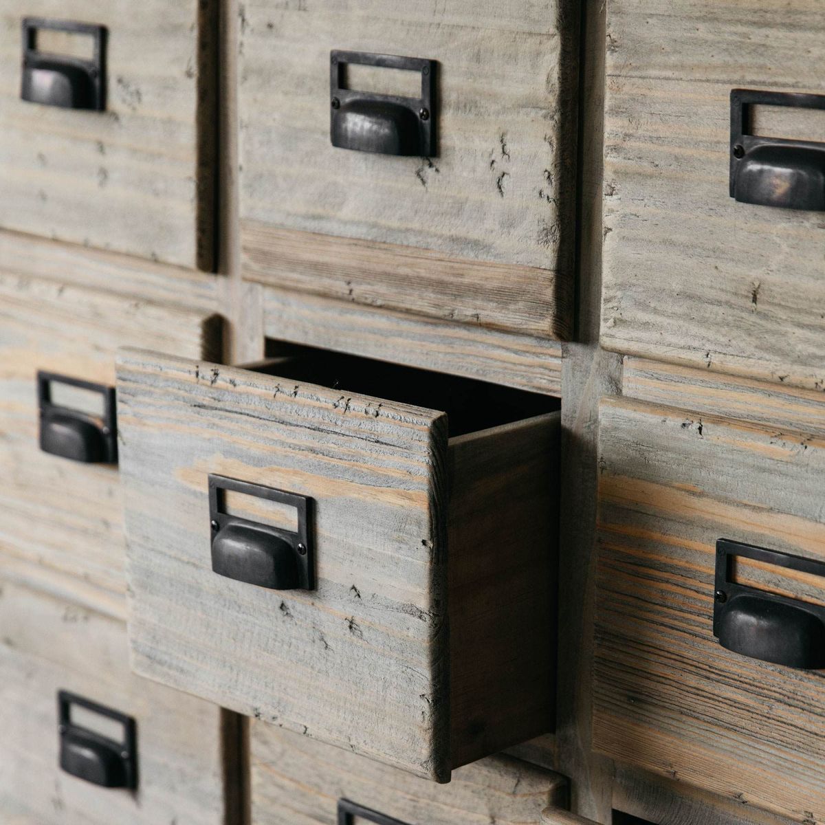A rustic oversized chest with ample storage, featuring twenty-four drawers each finished with vintage postmaster-inspired metal handles. Crafted from reclaimed, weathered pine wood, each piece is truly unique with distinct character and natural variation in grain.