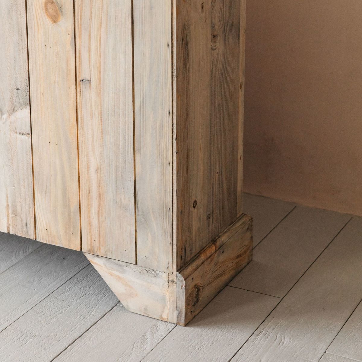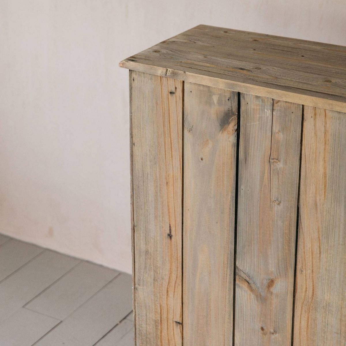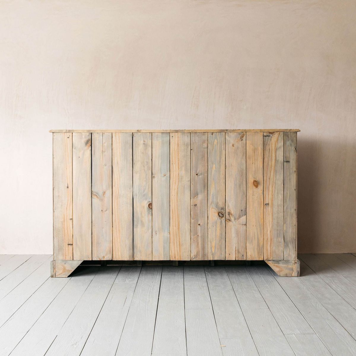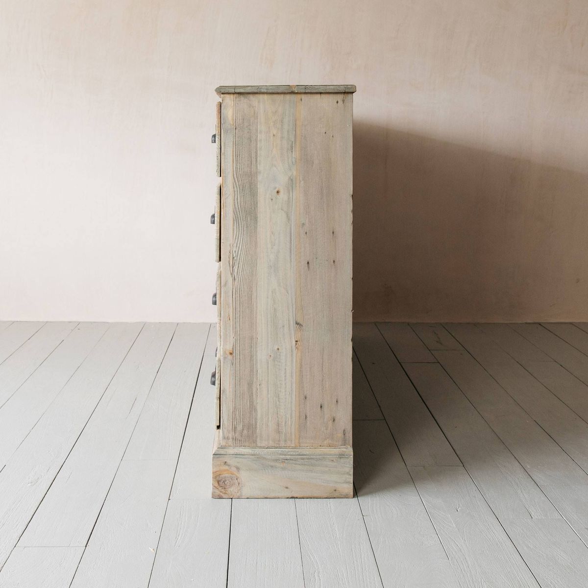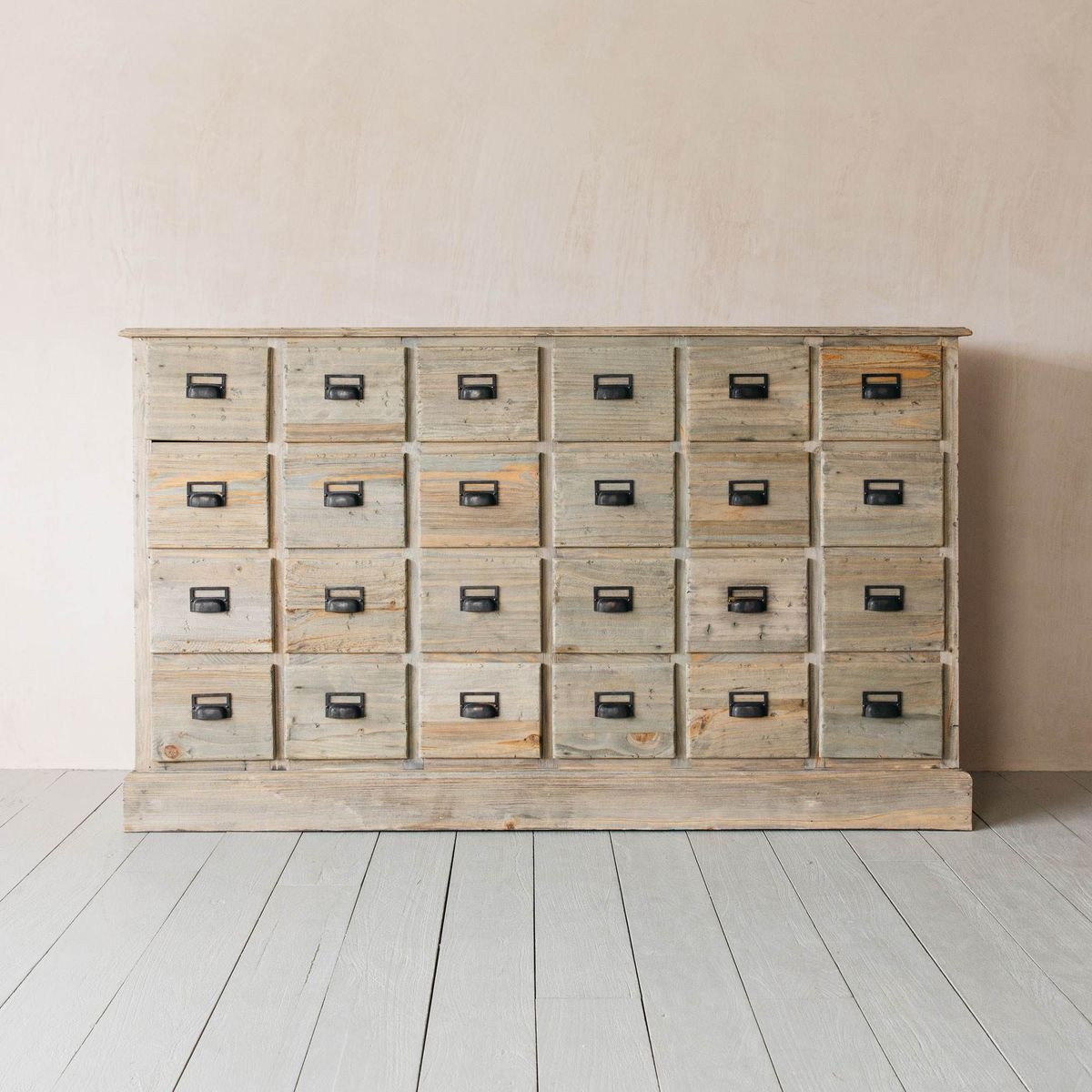 A rustic oversized chest with ample storage, featuring twenty-four drawers each finished with vintage postmaster-inspired metal handles. Crafted from reclaimed, weathered pine wood, each piece is truly unique with distinct character and natural variation in grain.