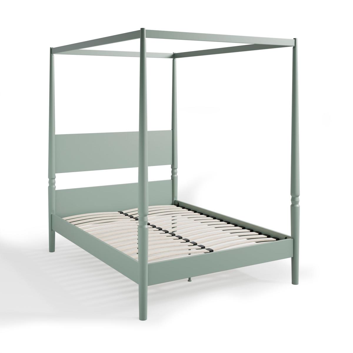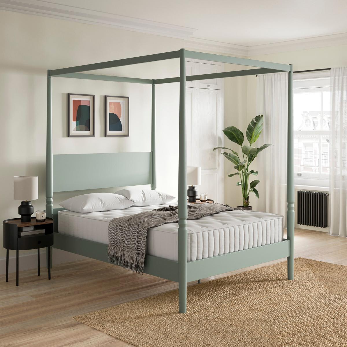 I’m really taken with the Pip four-poster bed for its simple, pared-back design and sturdy timber finish. It sits equally well in Scandi-inspired rooms, modern country schemes or relaxed, boho-edged interiors, thanks to its muted sage tone and uncluttered silhouette. To style it, keep bedding crisp and neutral, then layer in textured throws or a chunky knit at the foot. Add slender bedside tables with pared-down lamps, and introduce a tall plant or two to emphasise the height of the canopy. A sisal or jute rug beneath the frame will ground the look without overpowering it.