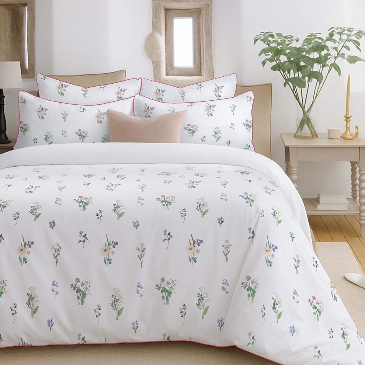 Bring a touch of elegance and freshness to your bedroom with this beautifully designed duvet cover set. Featuring a delicate floral print on a crisp white background, its finished with a stylish pink piped edge for a refined and contemporary look. The charming floral detailing adds a soft and uplifting feel, while the contrasting piping provides a subtle pop of colour that elevates the design. Made from soft, easy-care fabric, this bedding is as practical as it is stylish, ensuring comfort night after night. Complete with matching pillowcases, this set makes the perfect update for any modern or classic bedroom decor.