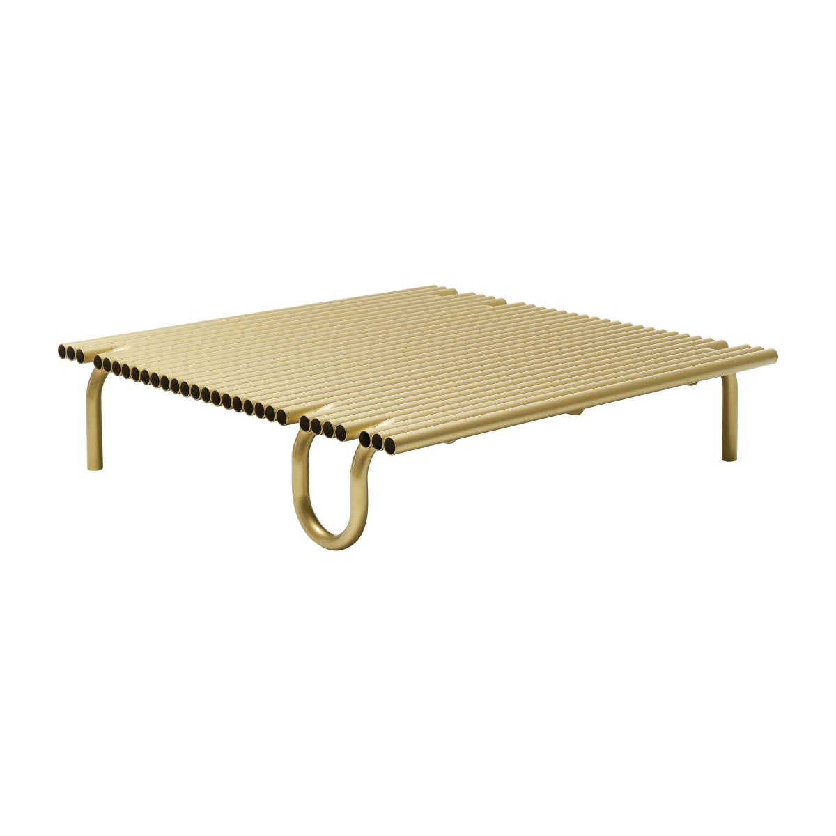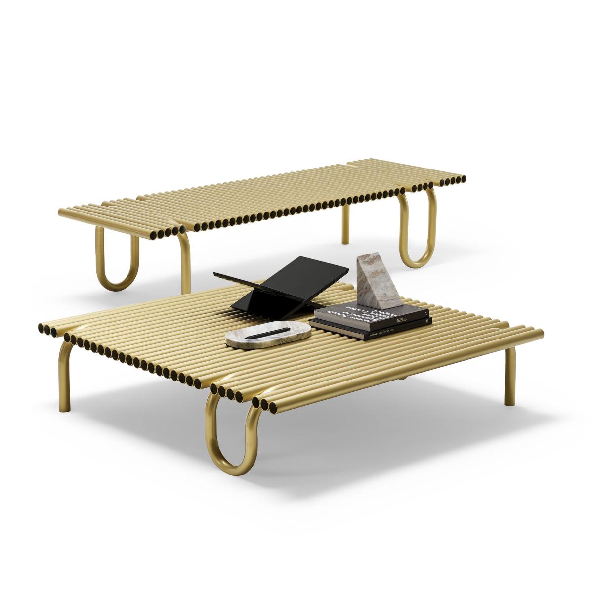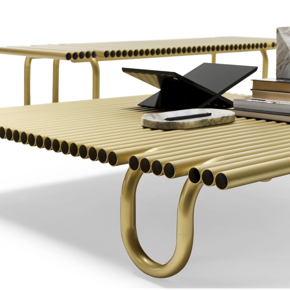 The tube has become a real decoration must-have! This graphic, sculptural piece of furniture is displayed like a work of art, becoming a centrepiece in your decor. The Pipeline coffee table is an assembly of metal tubes reminiscent of industrial pipes. The luxurious gold finish contrasts with the industrial look of the tubes. The wavy surface created by the repetitive rhythm of the metal tubes creates a feeling of lightness and solidity. With its rudimentary form, lost between a feeling of regression and technical distinction, the tube calls out with its power of interpretation. < The simple form, both enigmatic and playful, irresistibly attracts attention and stimulates the imagination. A style both full of fantasy yet refined. A snub to conventional design and predictable furniture.