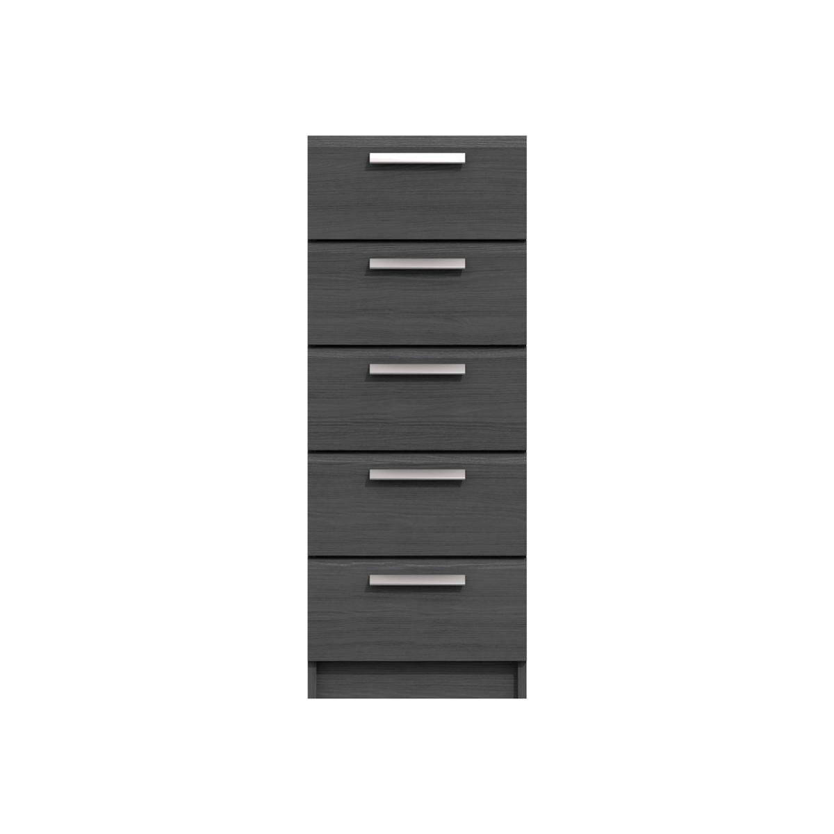 Available in a choice of graphite and oak effect colorways, the Piper 5 Drawer Tallboy offers a contemporary styling that would make a great addition to any home. The Piper boasts a realistic wood grain effect finish, coupled with stylish designer metal handles to accenturate the distinctive 45 degree profile on the doors and drawers. This chest of drawers is supplied fully assembled and comes with five large drawers, complete with linen look insides, 8mm heavy duty drawer bases and easy glide metal runners.