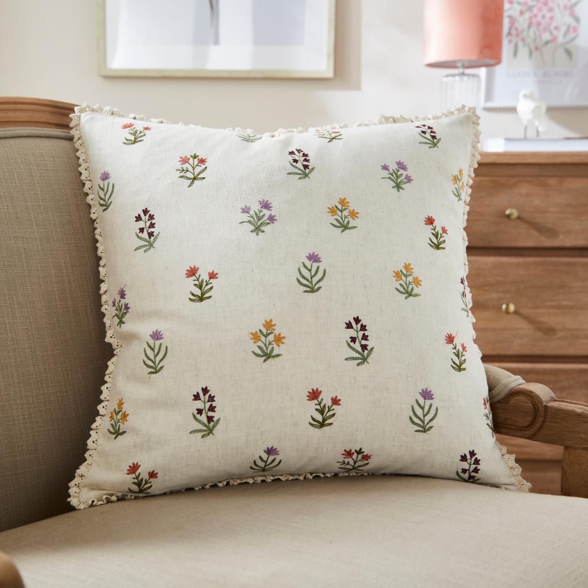 * Vintage floral Design* Plump Filling* Ruffled, lace-look border* Machine washable cover Add the Pippa cushion to your home to create the cosy cottage of your dreams. Sporting a dainty floral pattern against a neutral base this cushion compliments a range of interior styles whilst adding a vintage, feminine feel to its surroundings. This cushion is easy to care for as the cover can be removed and washed when necessary. Filled with a plump polyester filling and embellished with a lace-look border, this cushion has a whimsical quality to make you feel perfectly at home.
