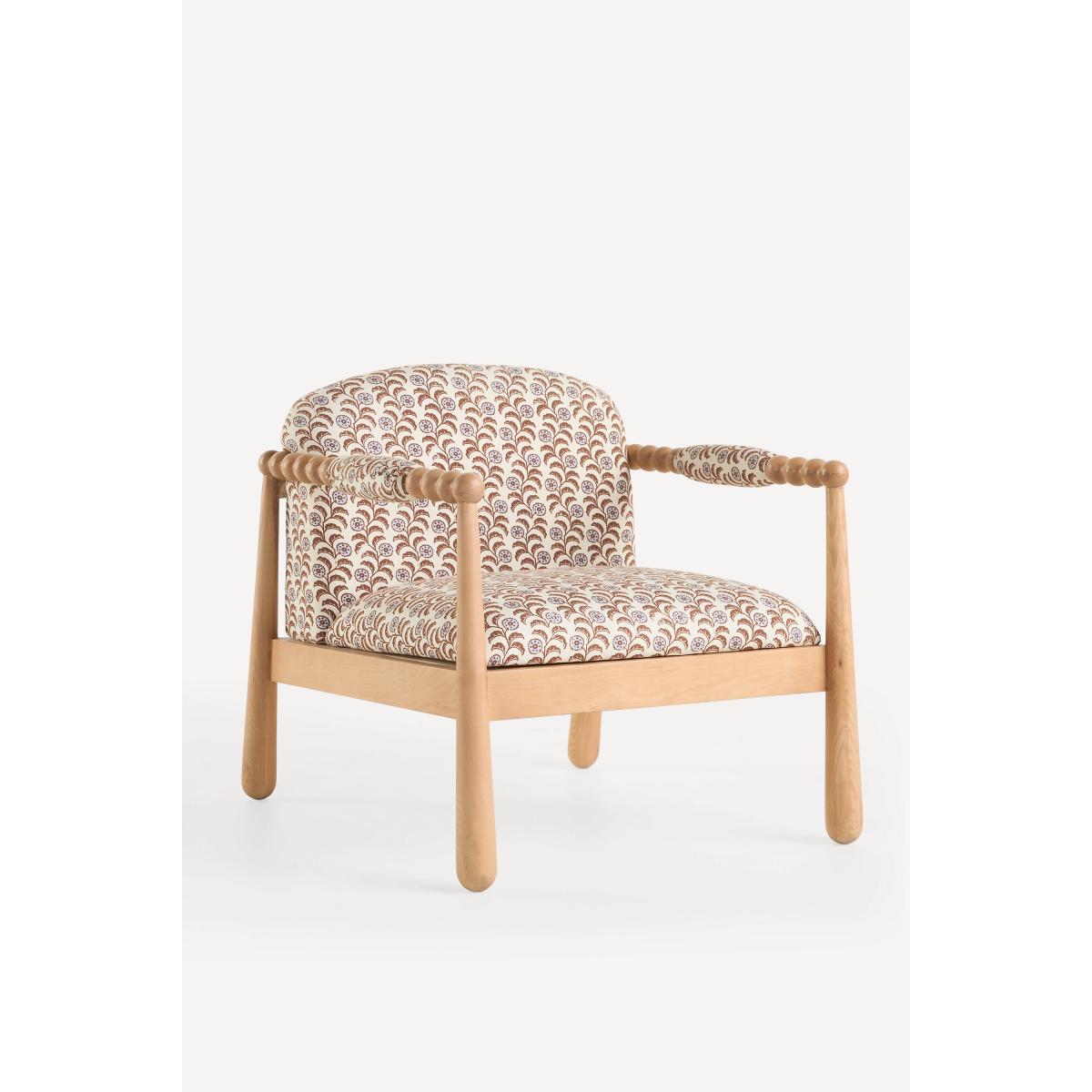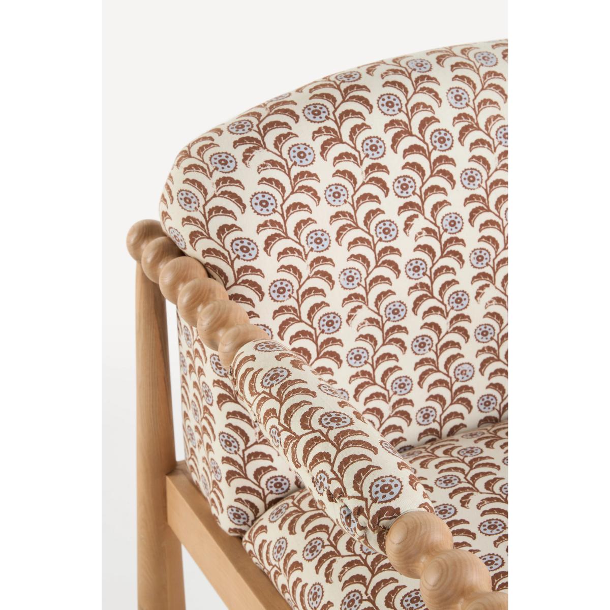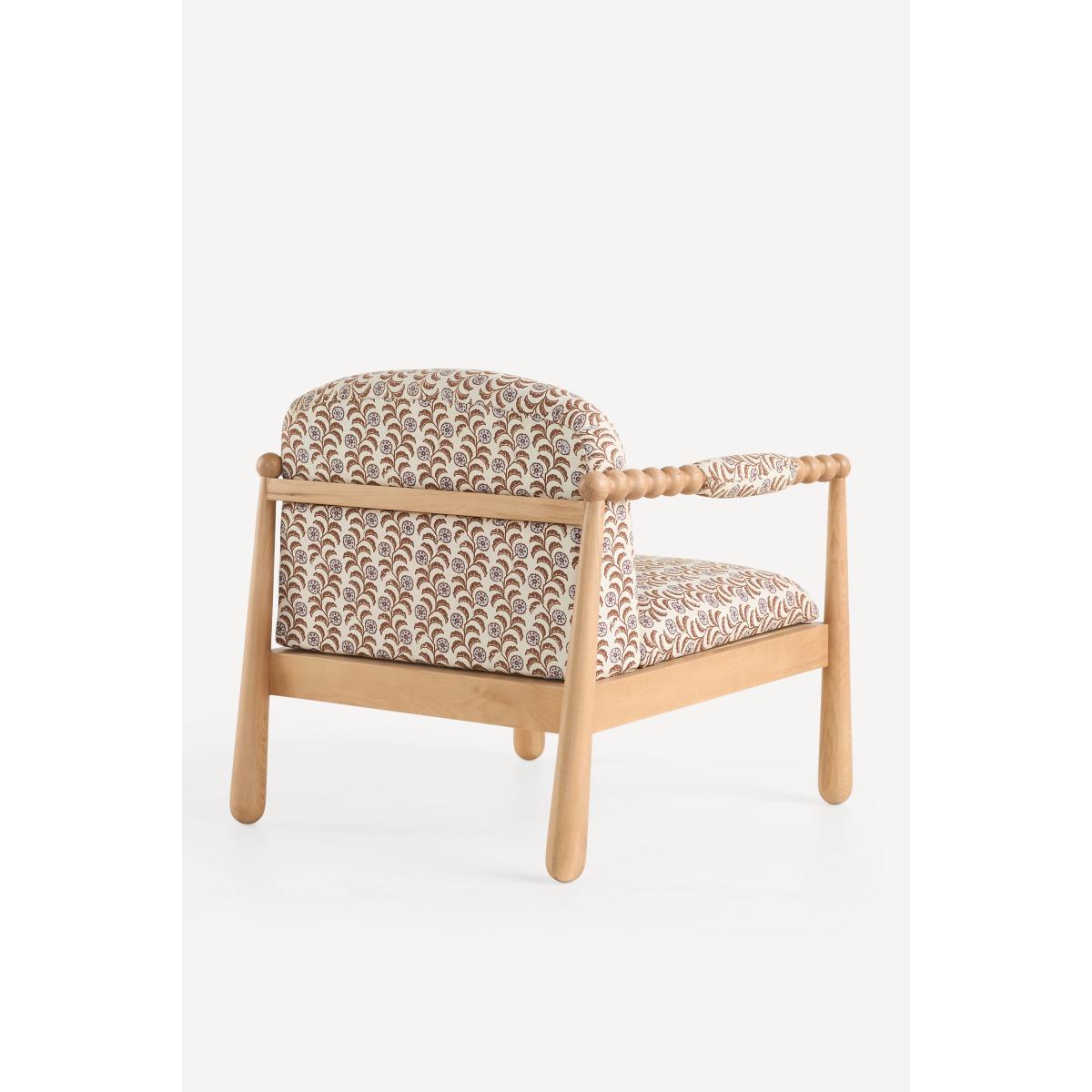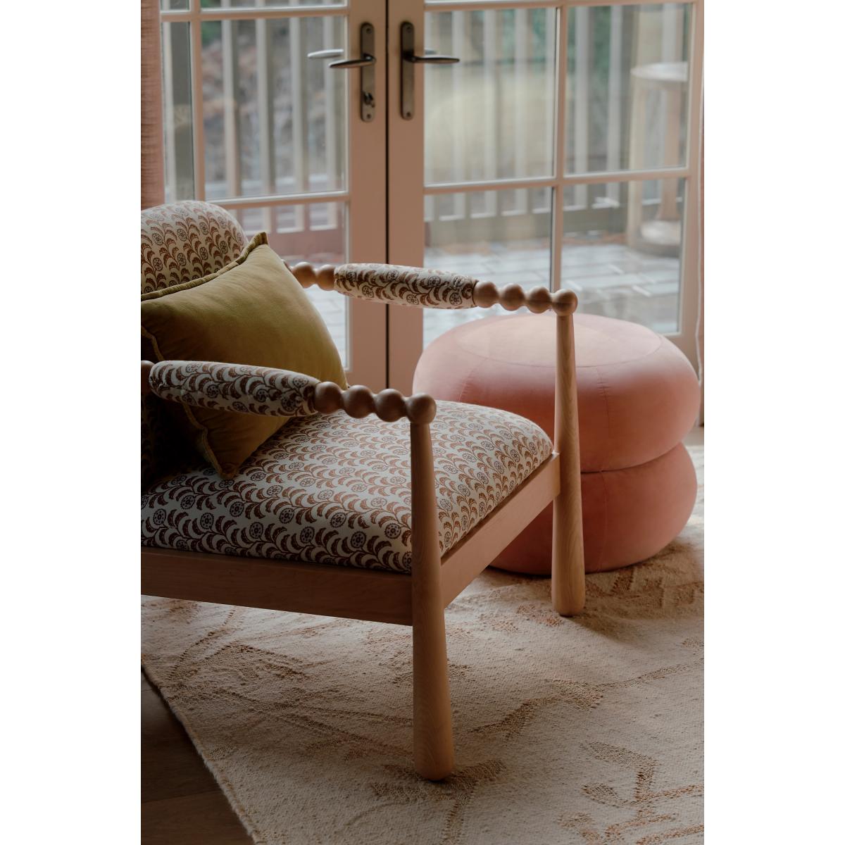 A lovely accent chair for a study or living area, the Pippa features a scalloped design and turned arms and legs crafted from ash wood. * Leora Block-Print upholstery: 100% cotton * Cushion content: Foam & fiber * Webbed seat construction * Kiln-dried hardwood frame * Turned legs * Professionally clean * This piece is intended for indoor use * No assembly required * Imported
