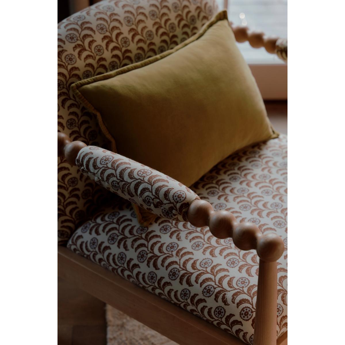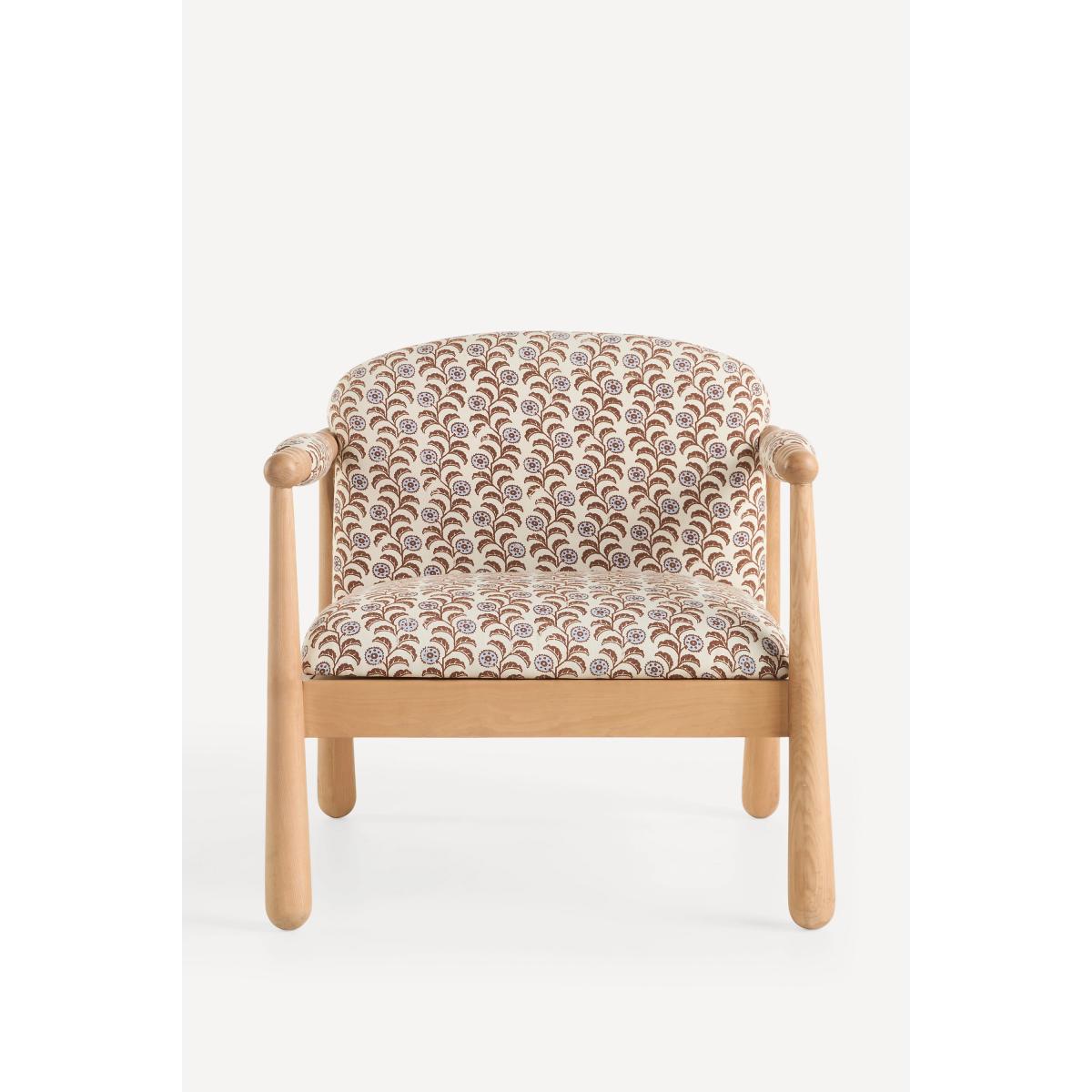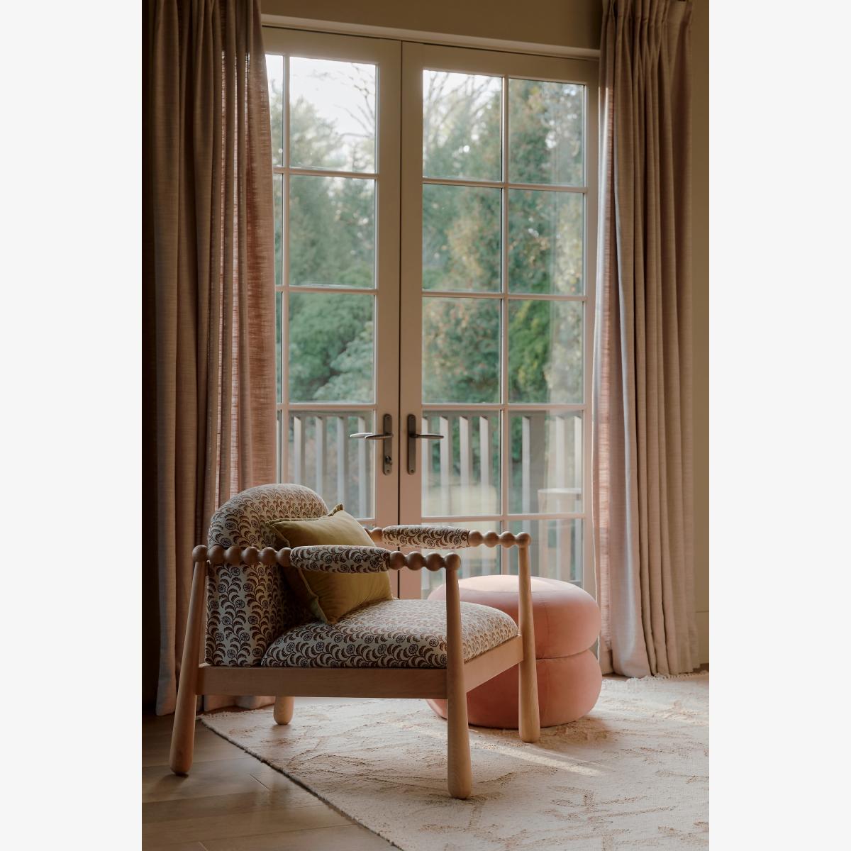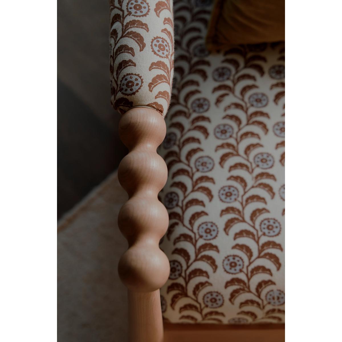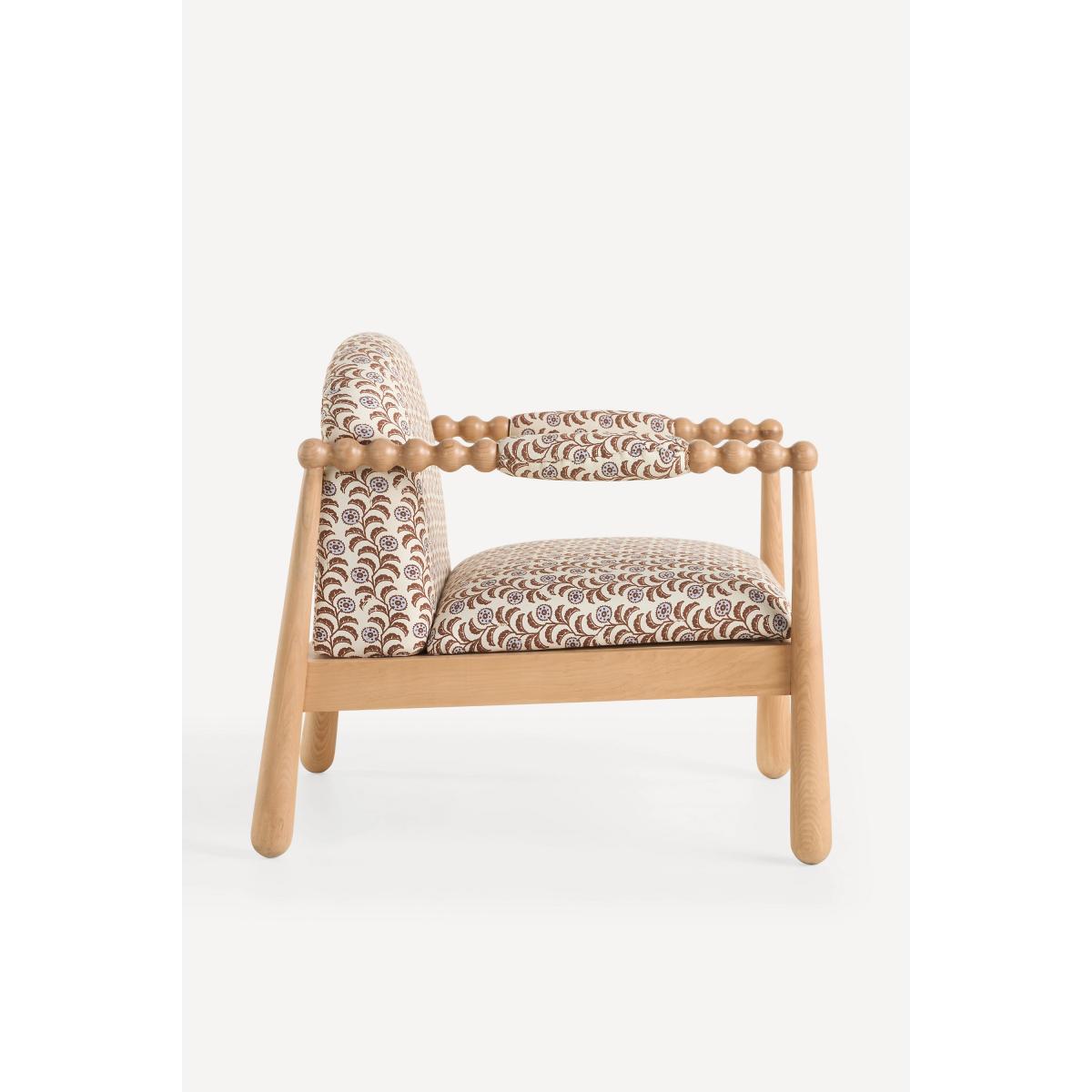 A lovely accent chair for a study or living area, the Pippa features a scalloped design and turned arms and legs crafted from ash wood. * Leora Block-Print upholstery: 100% cotton * Cushion content: Foam & fiber * Webbed seat construction * Kiln-dried hardwood frame * Turned legs * Professionally clean * This piece is intended for indoor use * No assembly required * Imported