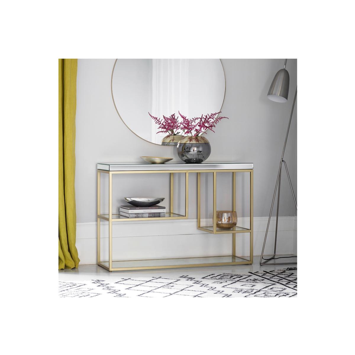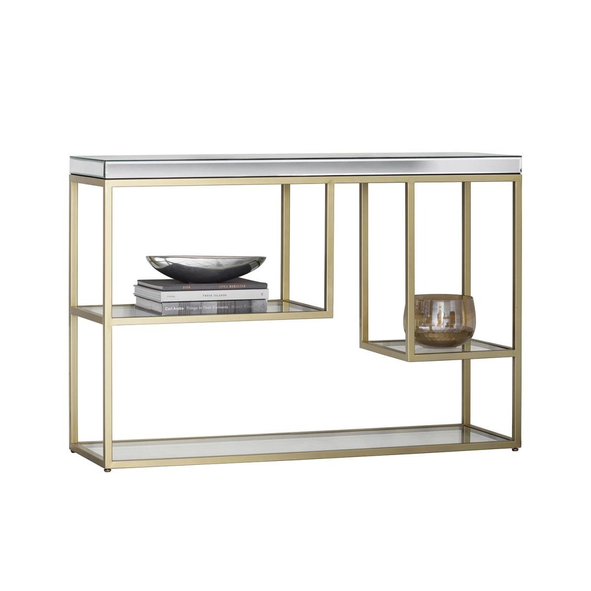 Dimensions W120cm x D36cm x H82cm Features. Sophisticated and luxury design. Stunning glass mirror table top Matt Gold-finished metal base. Two glass under shelves for extra storage. Matching Side and; Coffee tables also available..