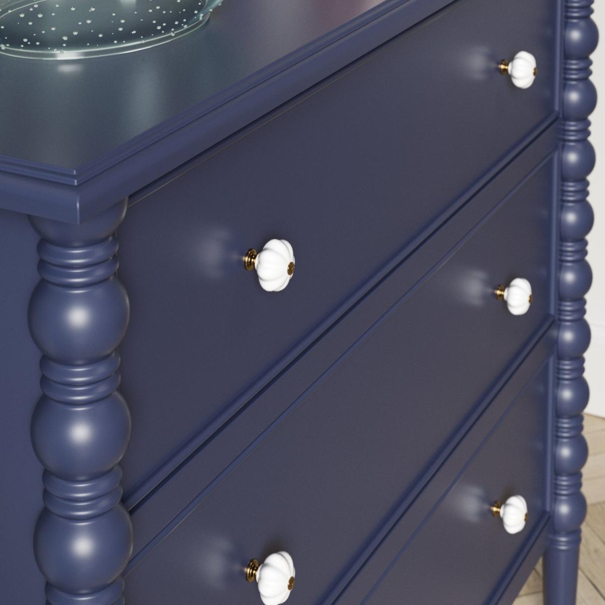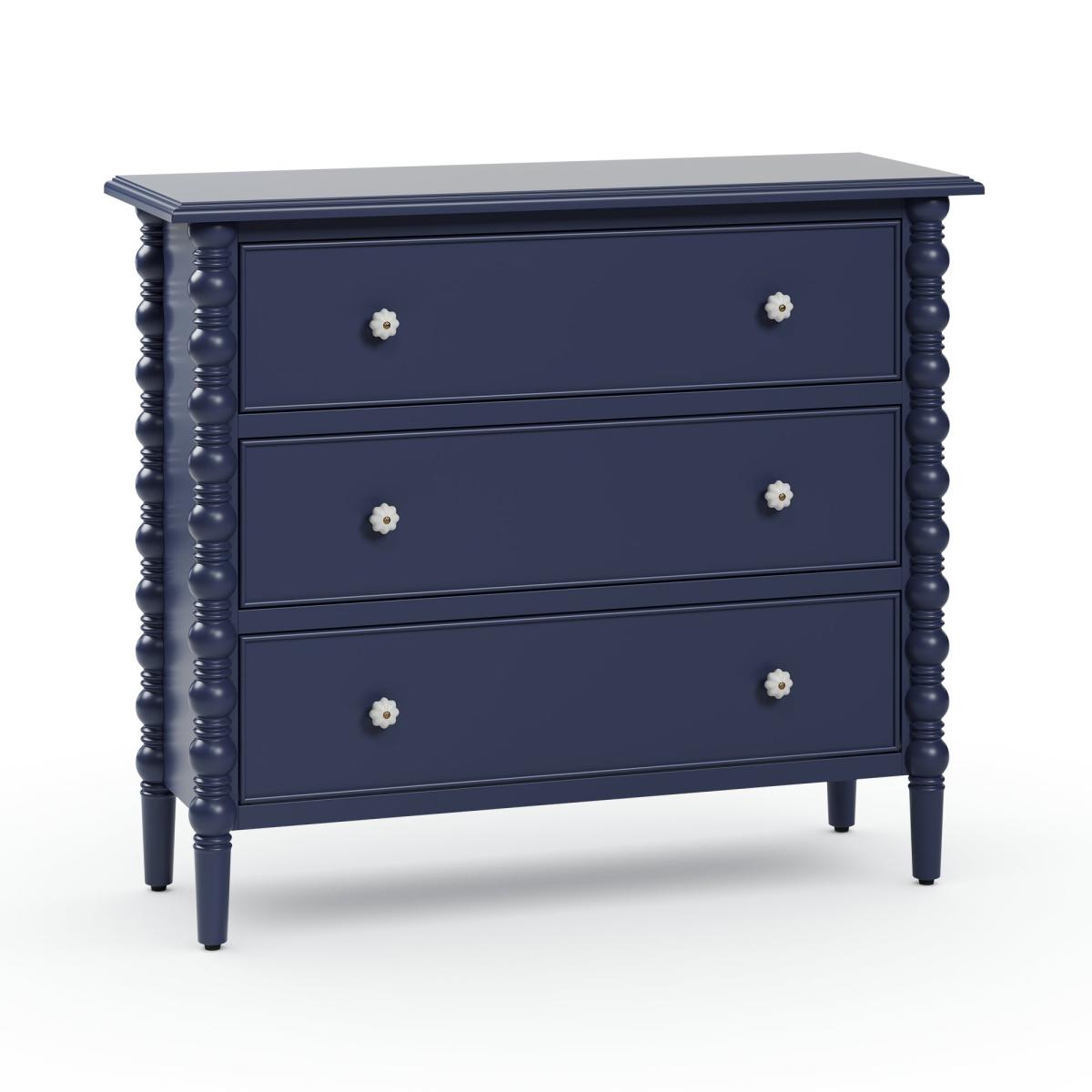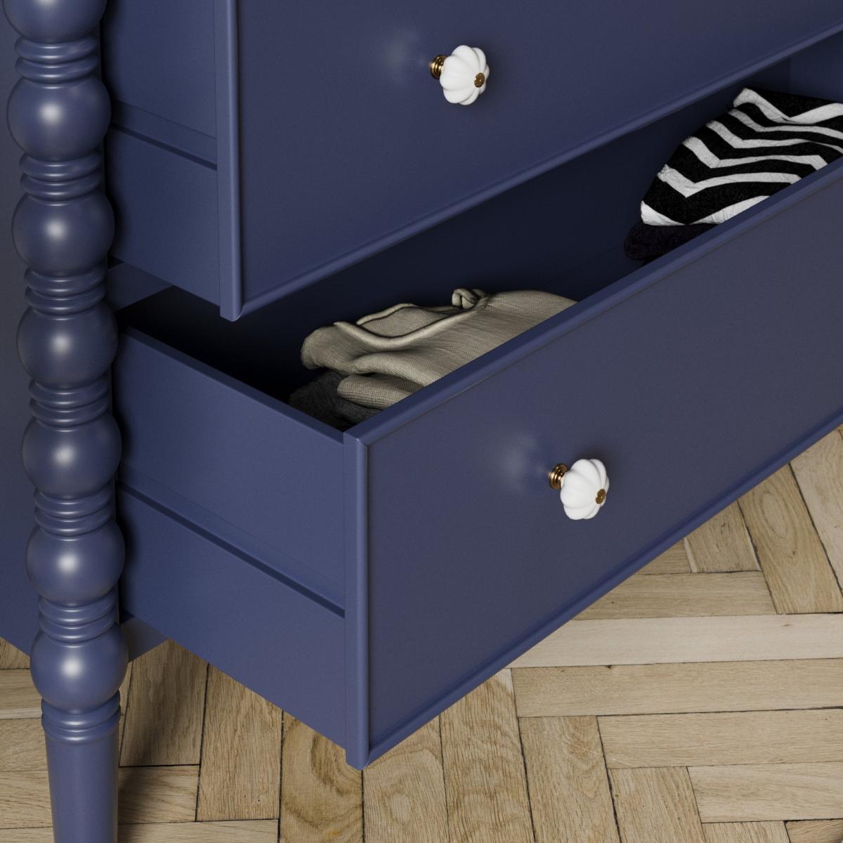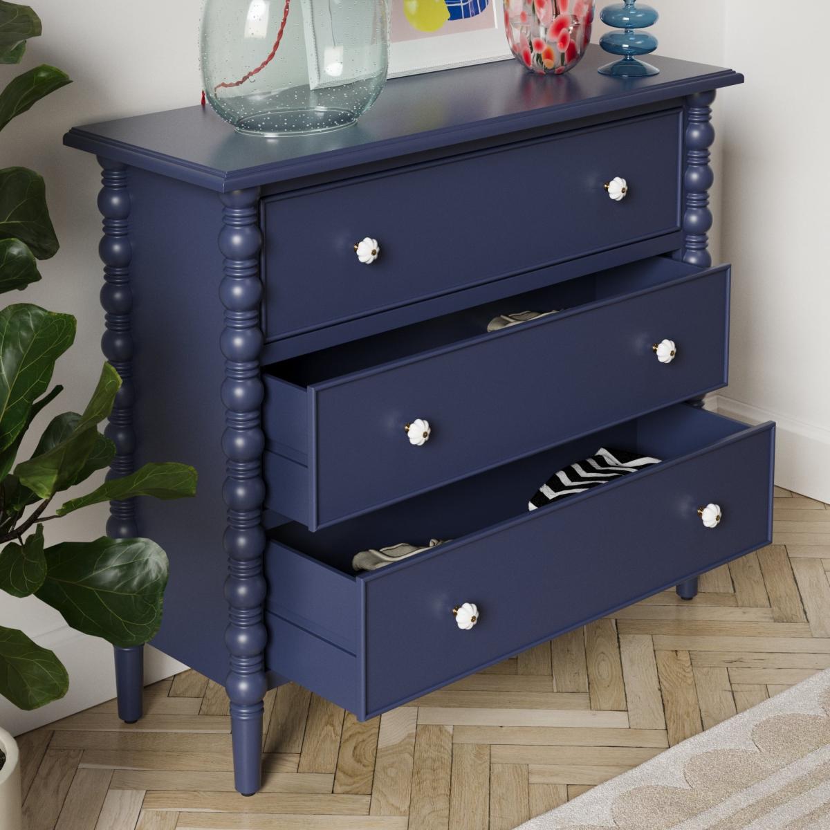 Dunelm Exclusive - Designed and Developed by Dunelm* Chest of 3 drawers* Navy painted finish* Ceramic handles* Wooden construction With three generously sized storage drawers, this chest of drawers offers ample space to keep your bedroom organized and clutter-free. From clothing and accessories to bed linens and personal items, you can conveniently store and access your belongings with ease. Each drawer is fitted with ceramic handles, which not only contribute to the overall aesthetic but also provide a comfortable grip for effortless opening and closing. The timeless navy hue finish of these drawers effortlessly blends with various bedroom styles while the turned wooden legs of this chest of drawers contribute to its refined aesthetic while providing stability and durability. From traditional to contemporary, this chest of drawers are a versatile choice for any interior design theme.