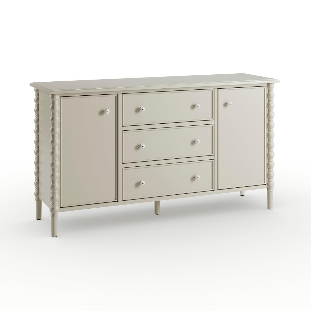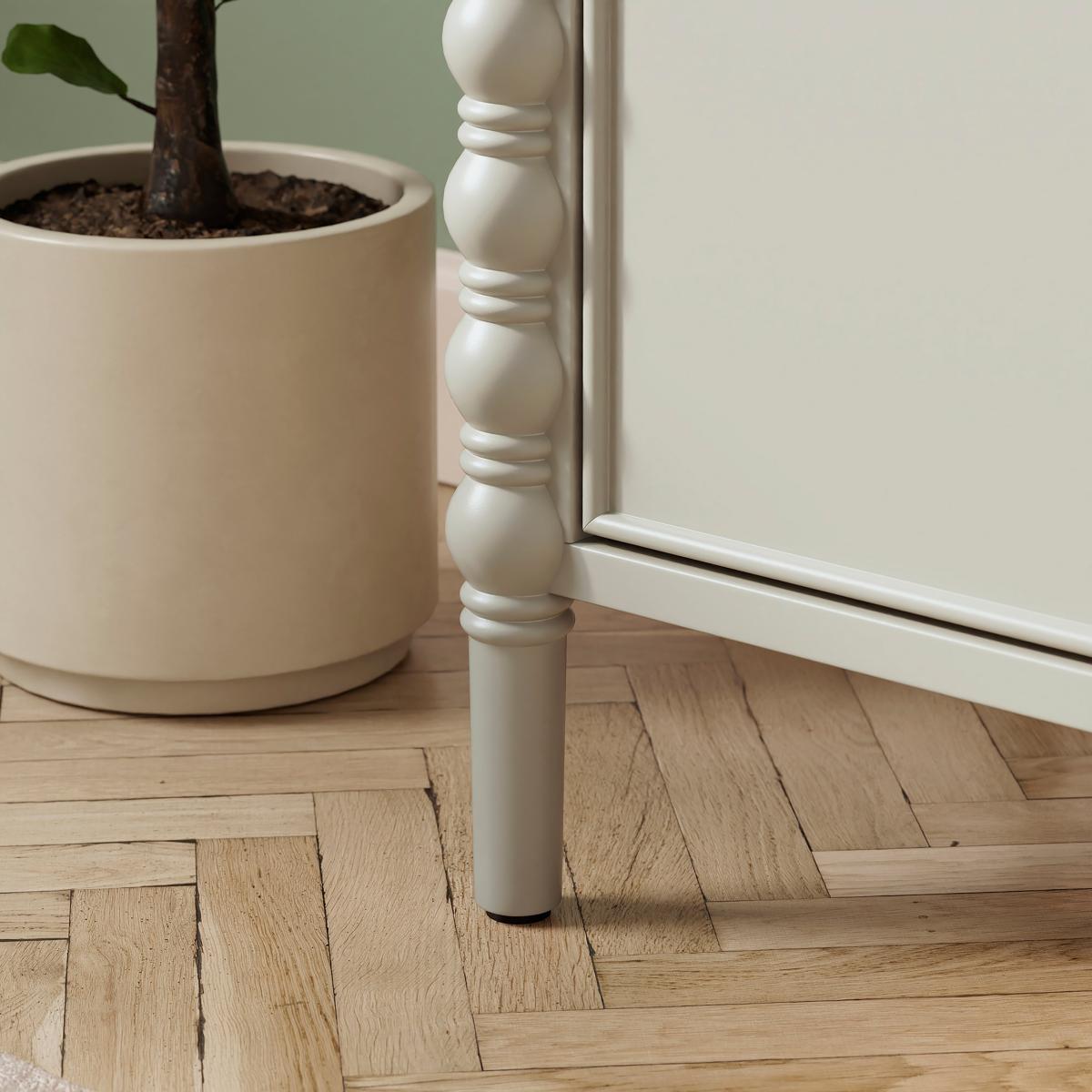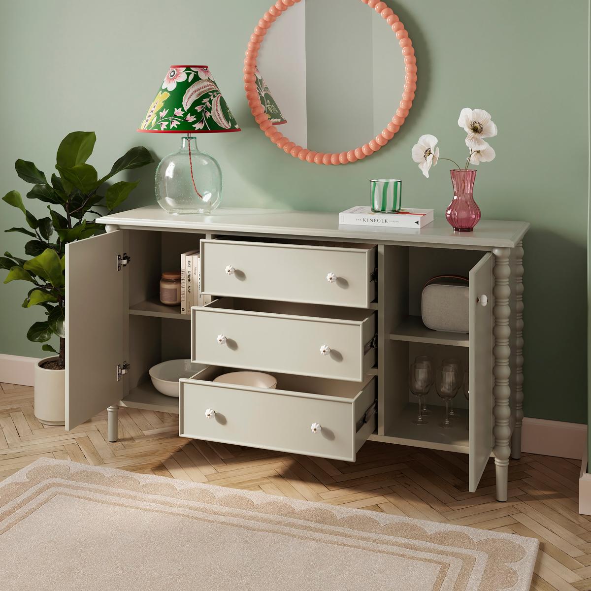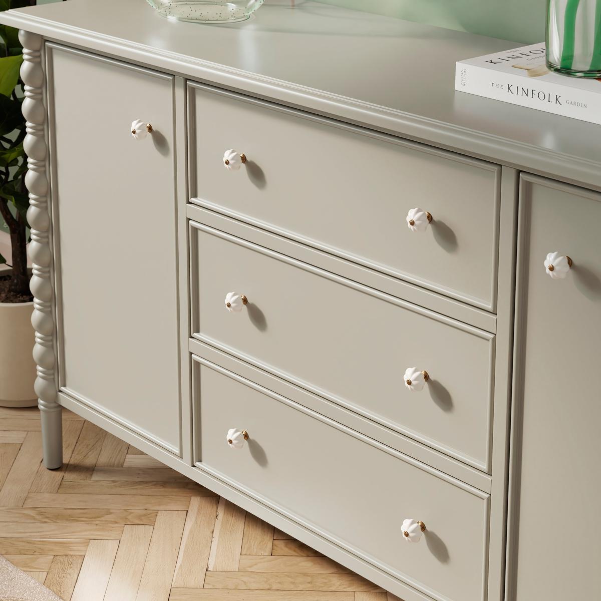 * Sideboard with drawers and shelves for storage * Ceramic handles * Wooden construction For those in need of extra storage with a touch of timeless charm, the Pippin sideboard is the perfect choice. Featuring a classic bobbin design and a beautifully neutral finish, this spacious sideboard is as stylish as it is practical. Behind its elegant doors, removable and adjustable shelving gives you the flexibility to store everything from tableware to household essentials, keeping your space neat and organised.