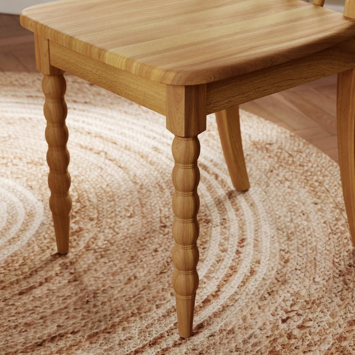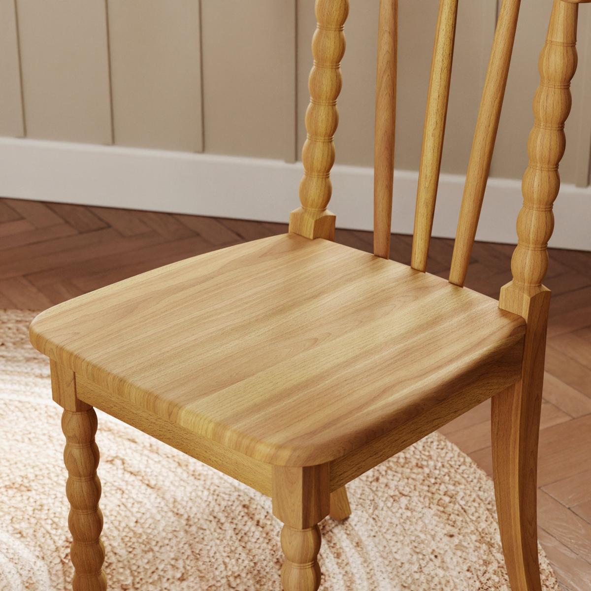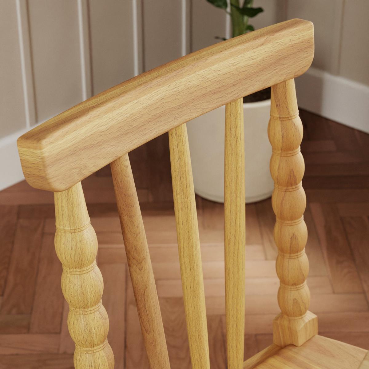 I love this wooden dining chair for its timeless, handcrafted appeal and versatile style. Its natural wood finish and distinctive rail-turned back give it a warm, inviting look that works beautifully in both traditional and modern interiors. It pairs well with a rustic or farmhouse aesthetic, but can also add a cosy touch to Scandi-inspired spaces. Practical styling tips include layering with textured cushions for extra comfort or mixing with other wood tones to create visual interest. To keep it looking its best, consider pairing it with a simple table and minimalist accessories for a clean, cohesive dining area, or add vintage elements for a more eclectic vibe.