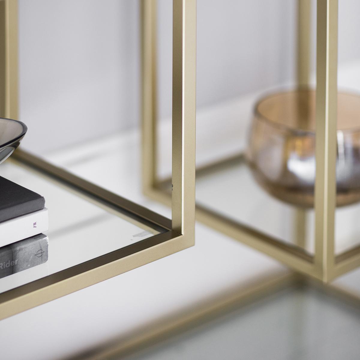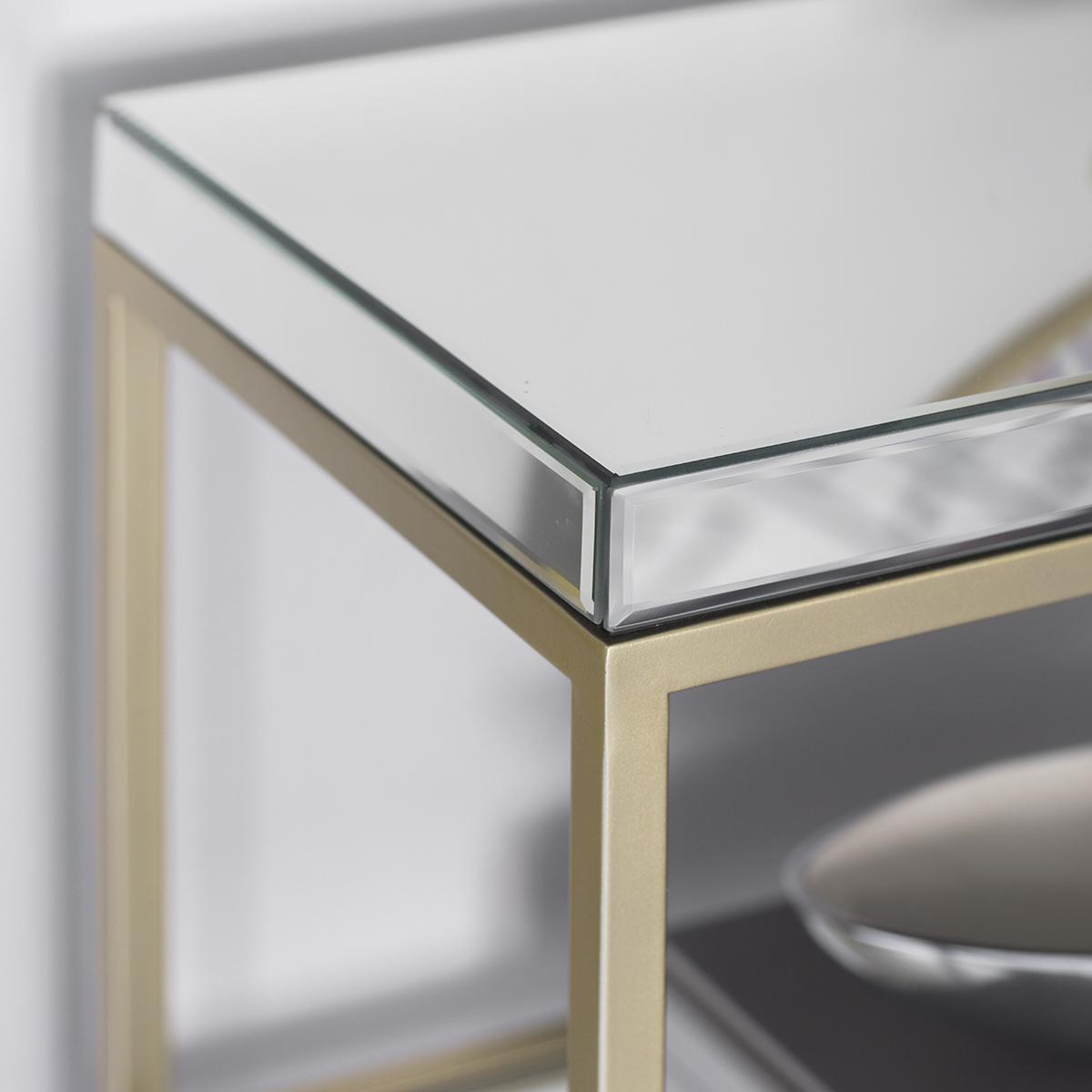 Create a focal point with this stylish yet practical designer console table, featuring a bevelled mirror top and tempered mirrored shelves set into a modern, soft champagne coloured metal frame.