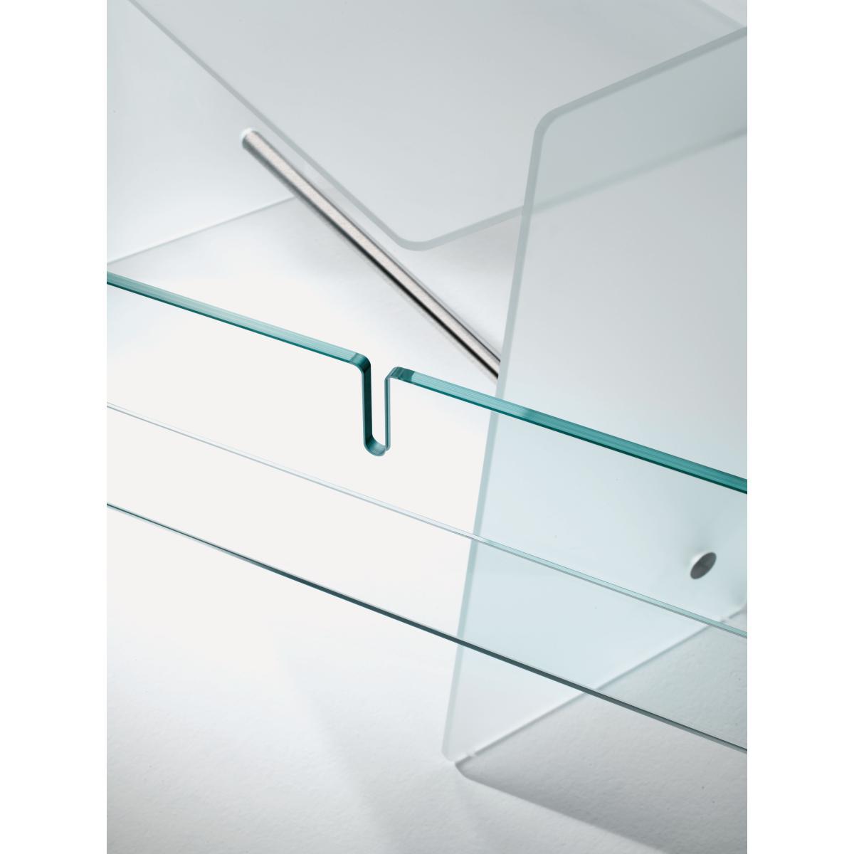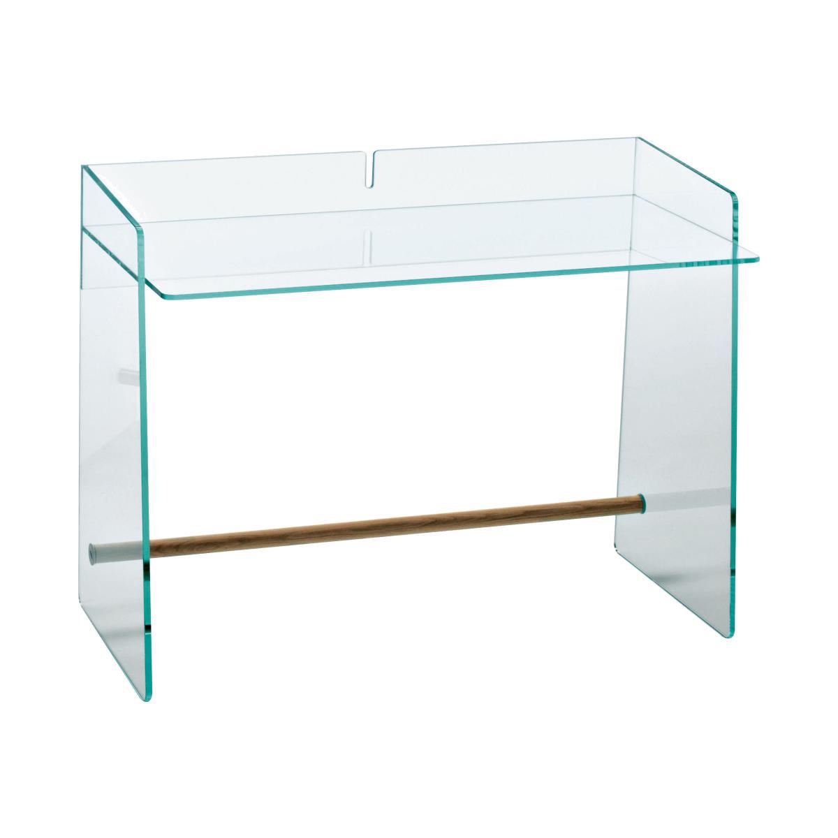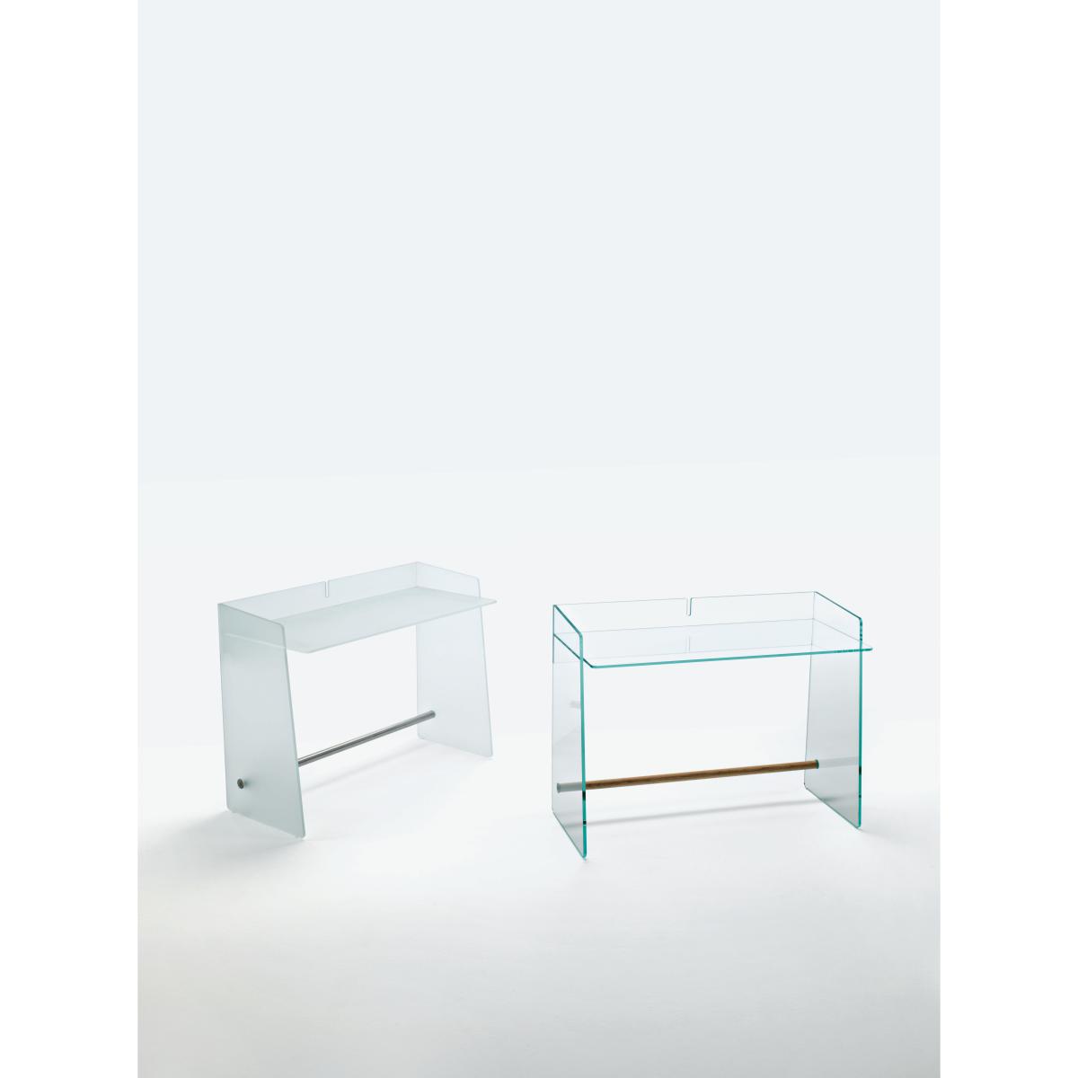 Writing desk in transparent extralight glass or in a new special double-faced extralight acid-etched glass tempered and thermo-welded. Available in two different sizes. A footrest bar is fixed to the sides of the writing desk by means of aluminium plates with satin inox finish, set in the depth of the glass. In the acid-etched version the bar is in aluminium with satin inox finish, whilst in the transparent version the bar is in natural ash. The great care of the details and the balanced proportions endow an appearance of harmony and natural grace.